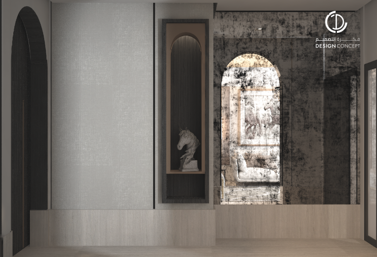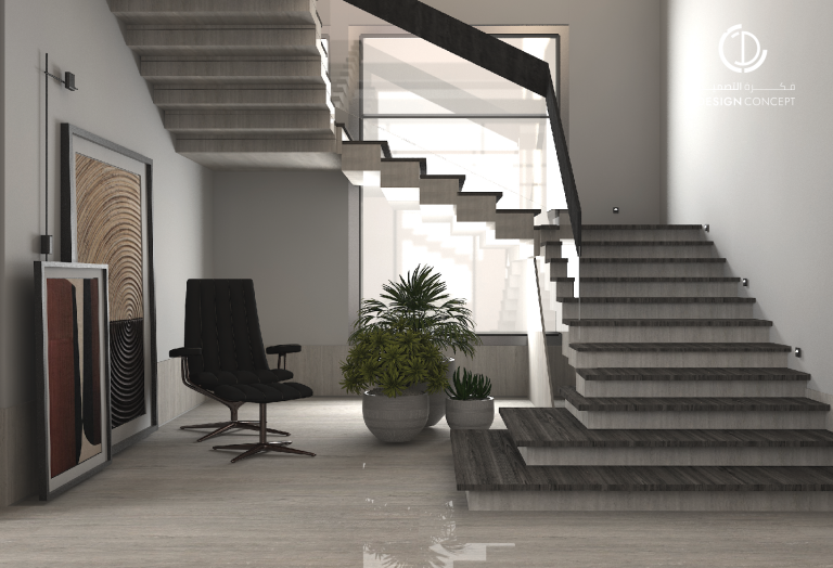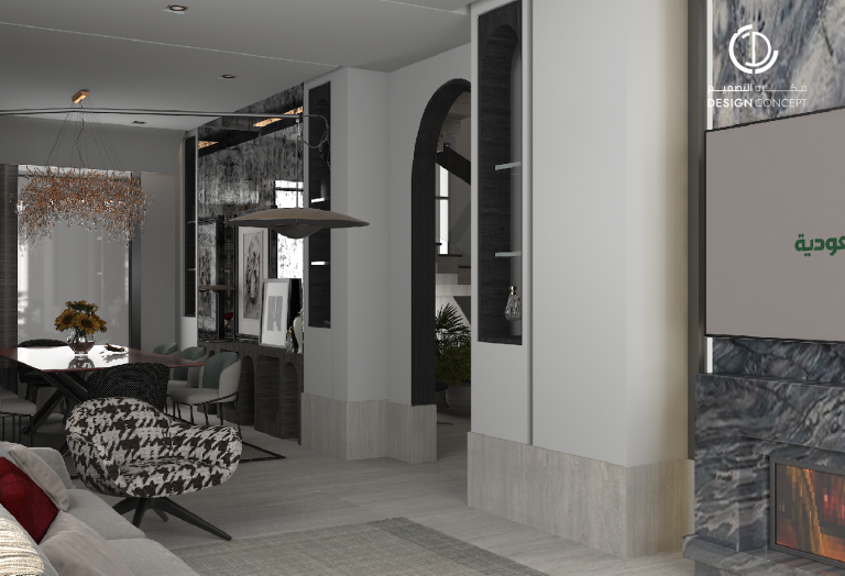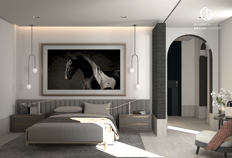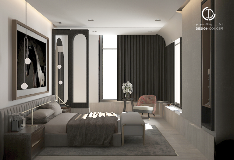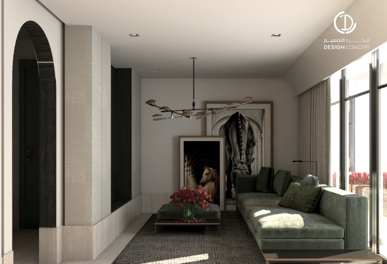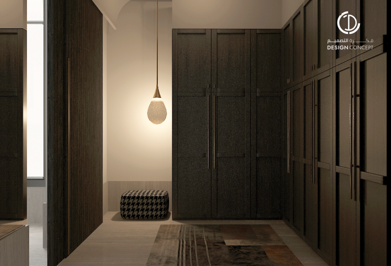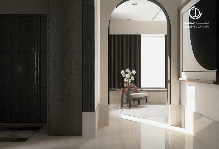 اعتمدنا في التصميم على اتباع هوية بسيطة ونمط حديث مع تحقيق التباين في الألوان والمواد المستخدمة، استخدمنا الأقواس لتكون التشكيل الرئيسي في التصميم للممرات والمداخل والخزائن الداخلية كذلك، كما حرصنا على إضافة مناطق رفاهية في الڤيلا ولذلك تفرّد الدور الثاني بمنطقة مفتوحة متعددة الاستخدامات والتي تُطل على حديقة السطح.