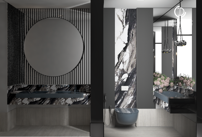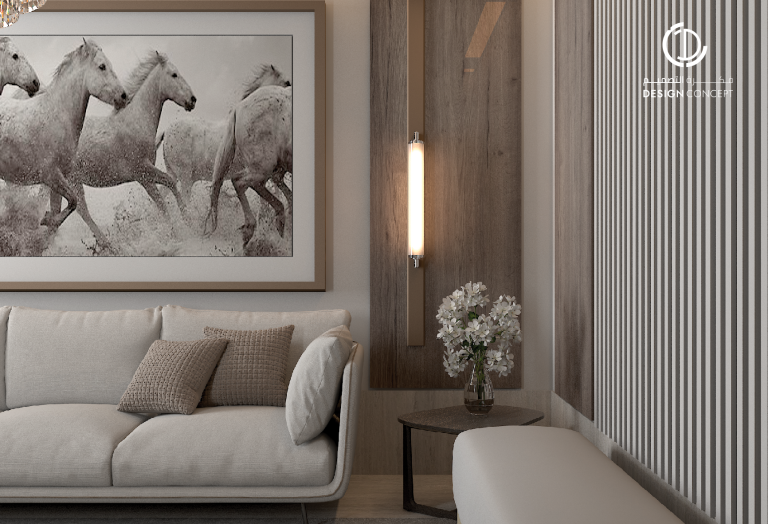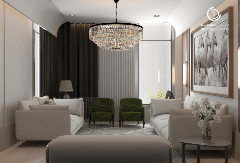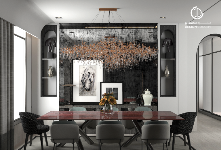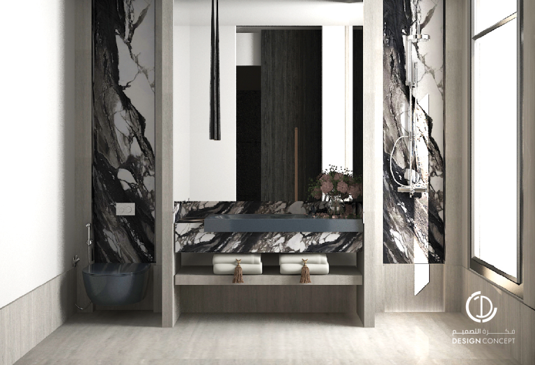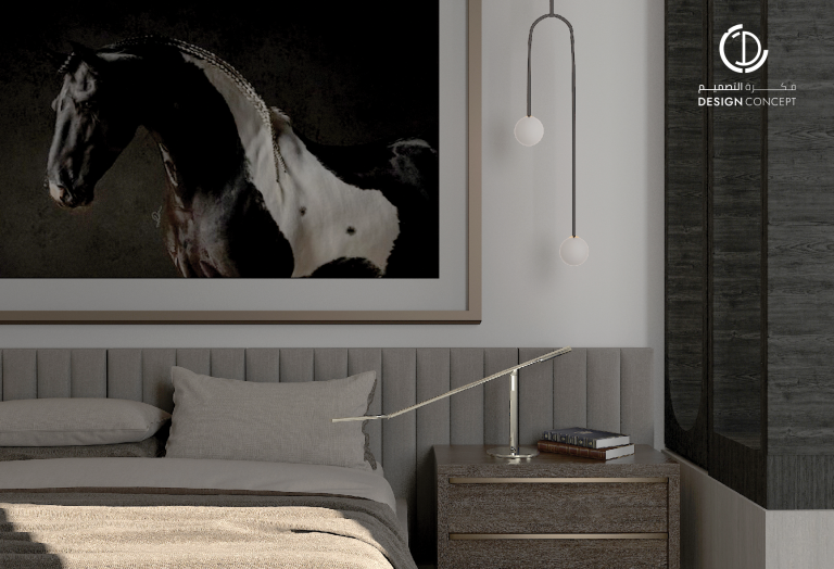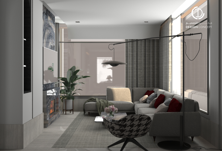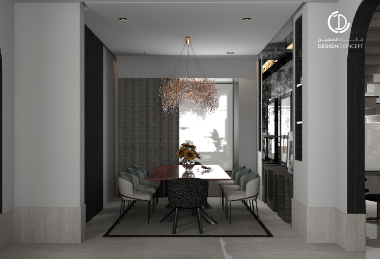 اعتمدنا في التصميم على اتباع هوية بسيطة ونمط حديث مع تحقيق التباين في الألوان والمواد المستخدمة، استخدمنا الأقواس لتكون التشكيل الرئيسي في التصميم للممرات والمداخل والخزائن الداخلية كذلك، كما حرصنا على إضافة مناطق رفاهية في الڤيلا ولذلك تفرّد الدور الثاني بمنطقة مفتوحة متعددة الاستخدامات والتي تُطل على حديقة السطح.