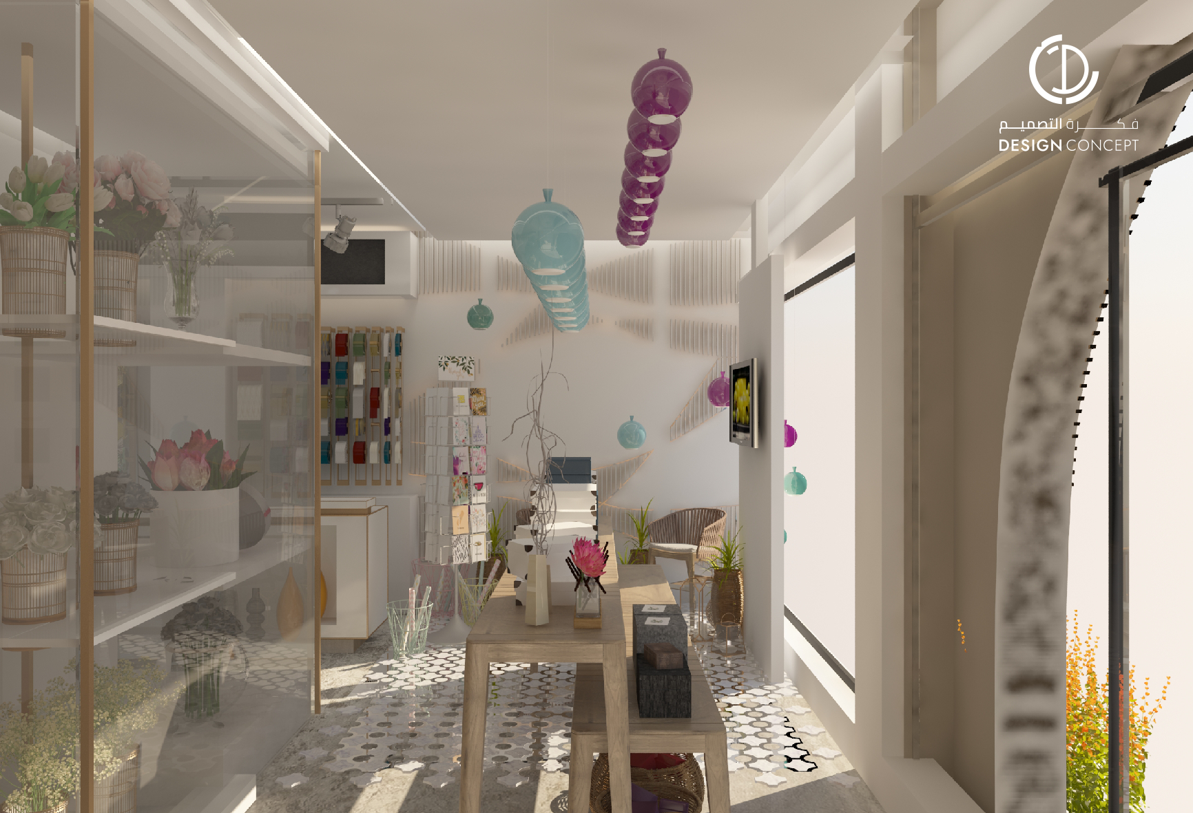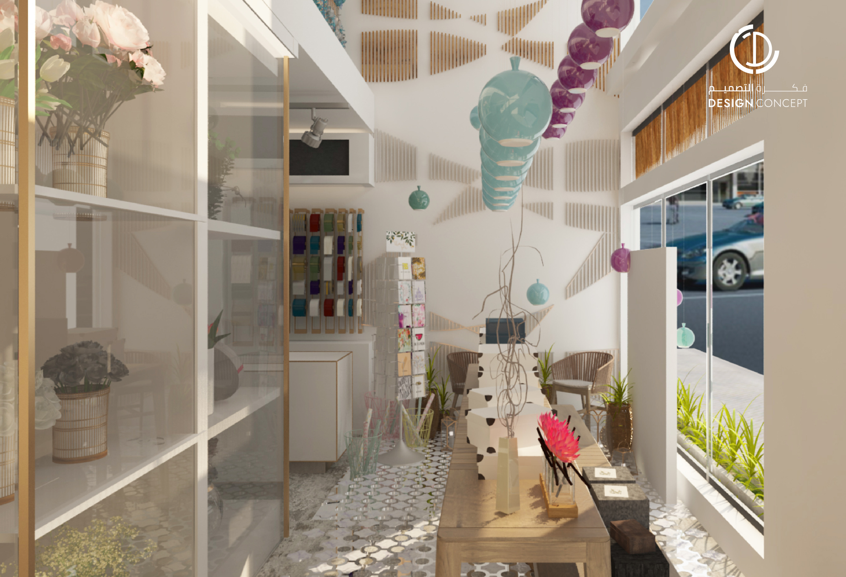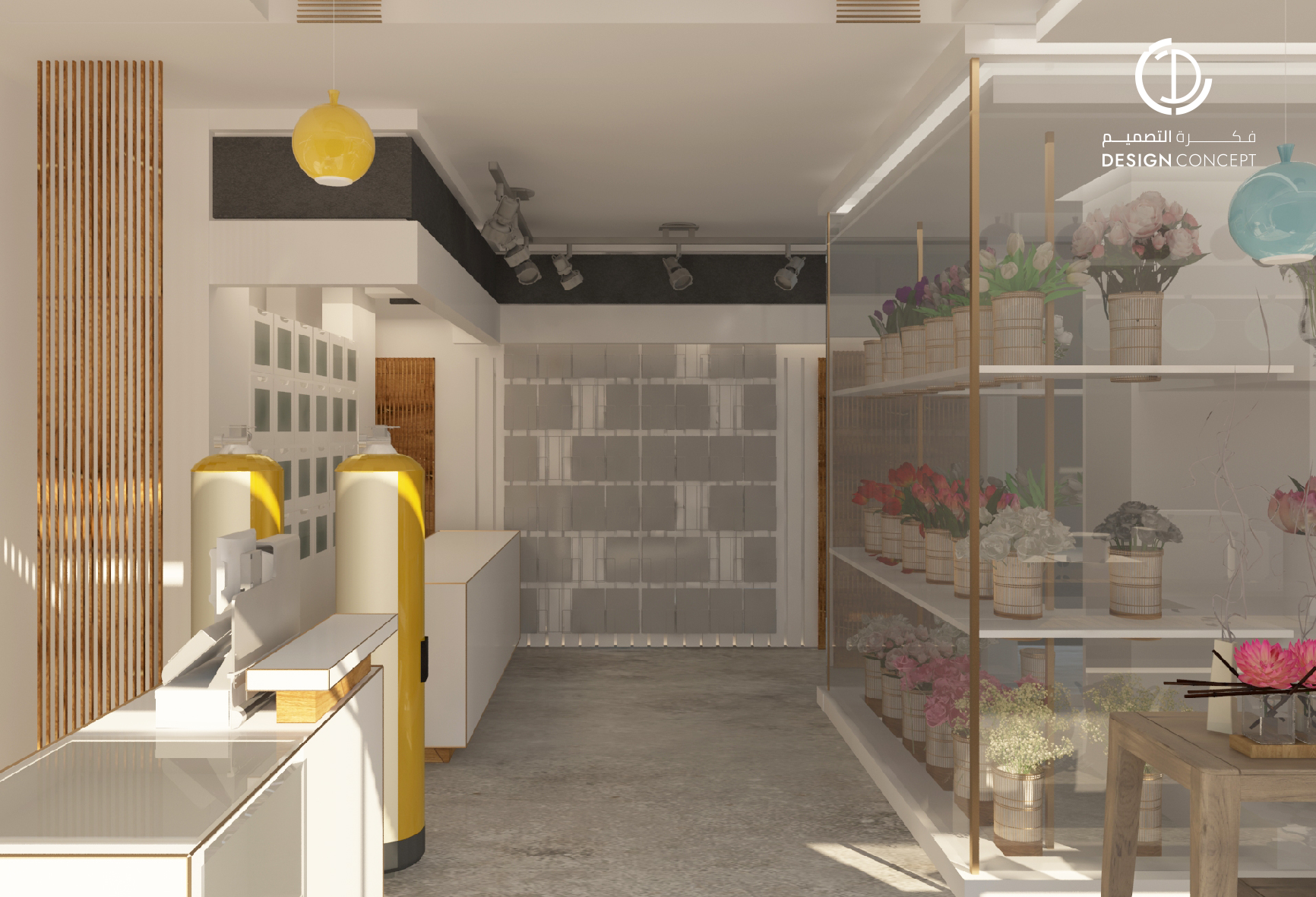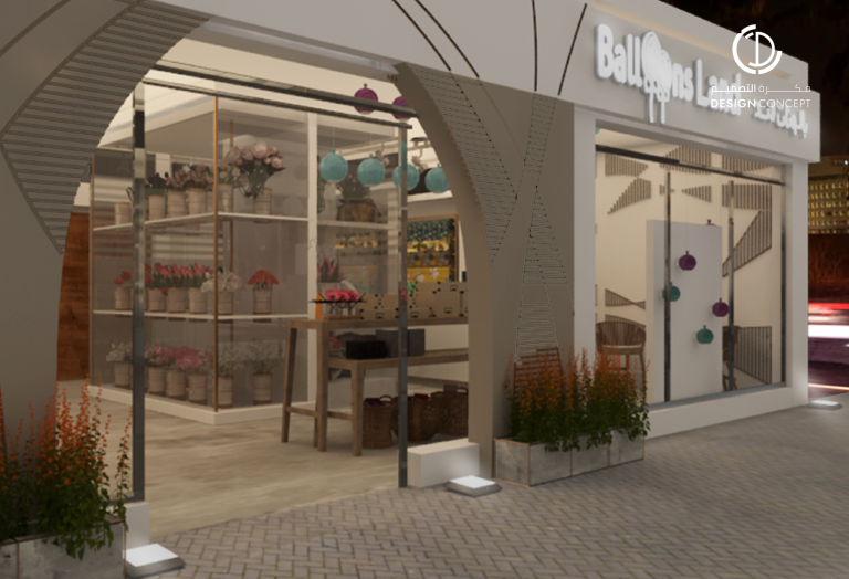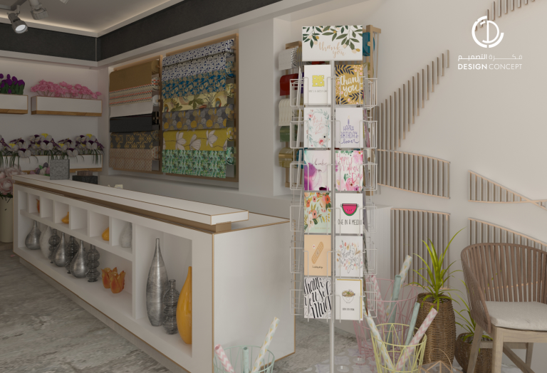 محل تجاري متخصص في تغليف الهدايا، اعتمدنا اللون الأبيض للجدران والخشب للأثاث، مع تصميم خزائن زجاجية للورد والتي أضافت جمالًا للمكان.