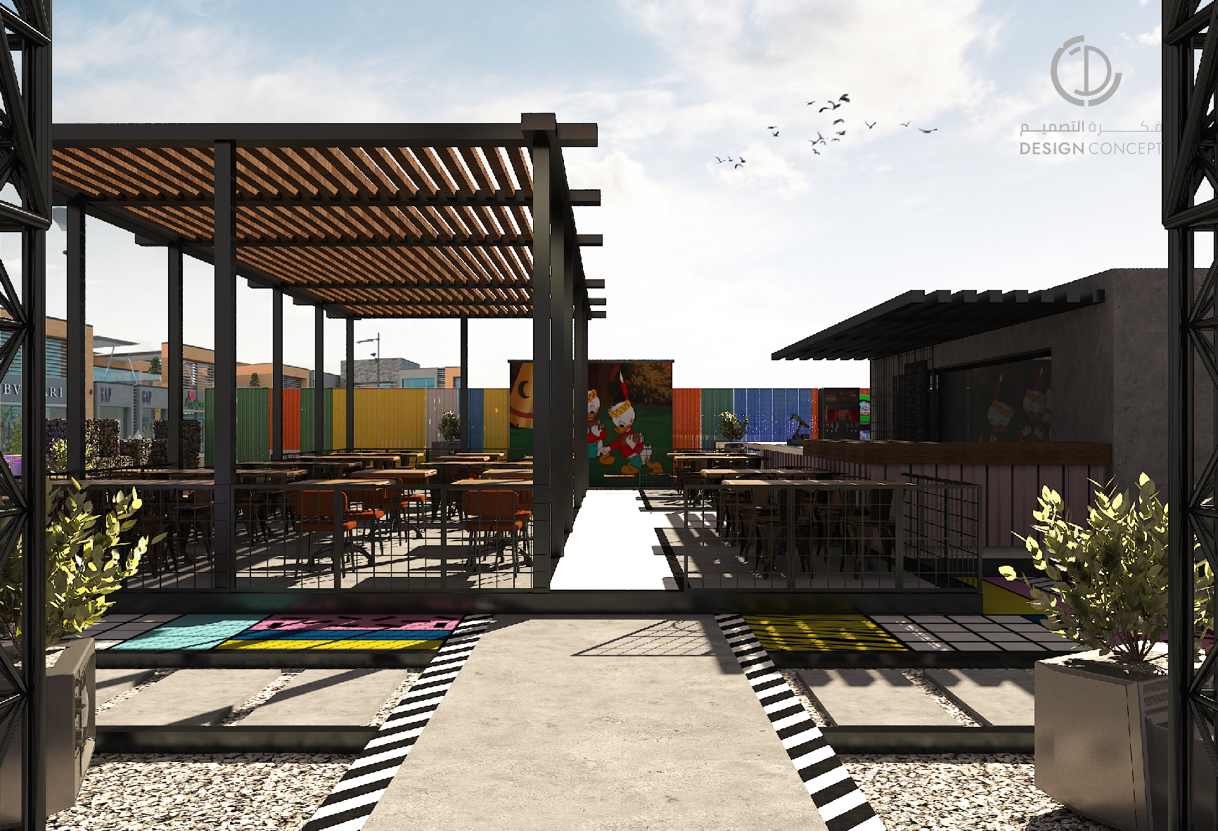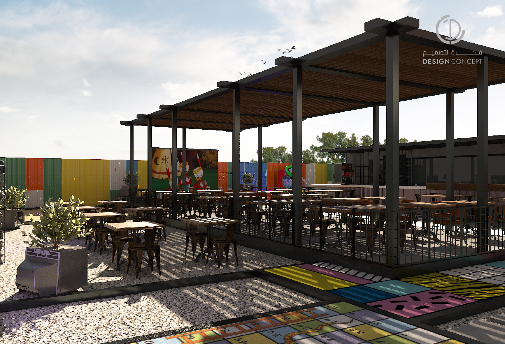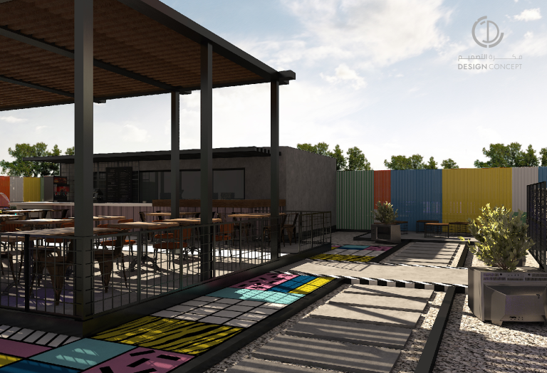 عبارة عن جلسات خارجية، مطعم ومساحة ترفيهية، حرصنا على خلق بيئة مرحة من خلال استخدام ألوان متنوعة كالأحمر، الأصفر والأزرق والحرص على دمجهم معًا بشكل متناسب.