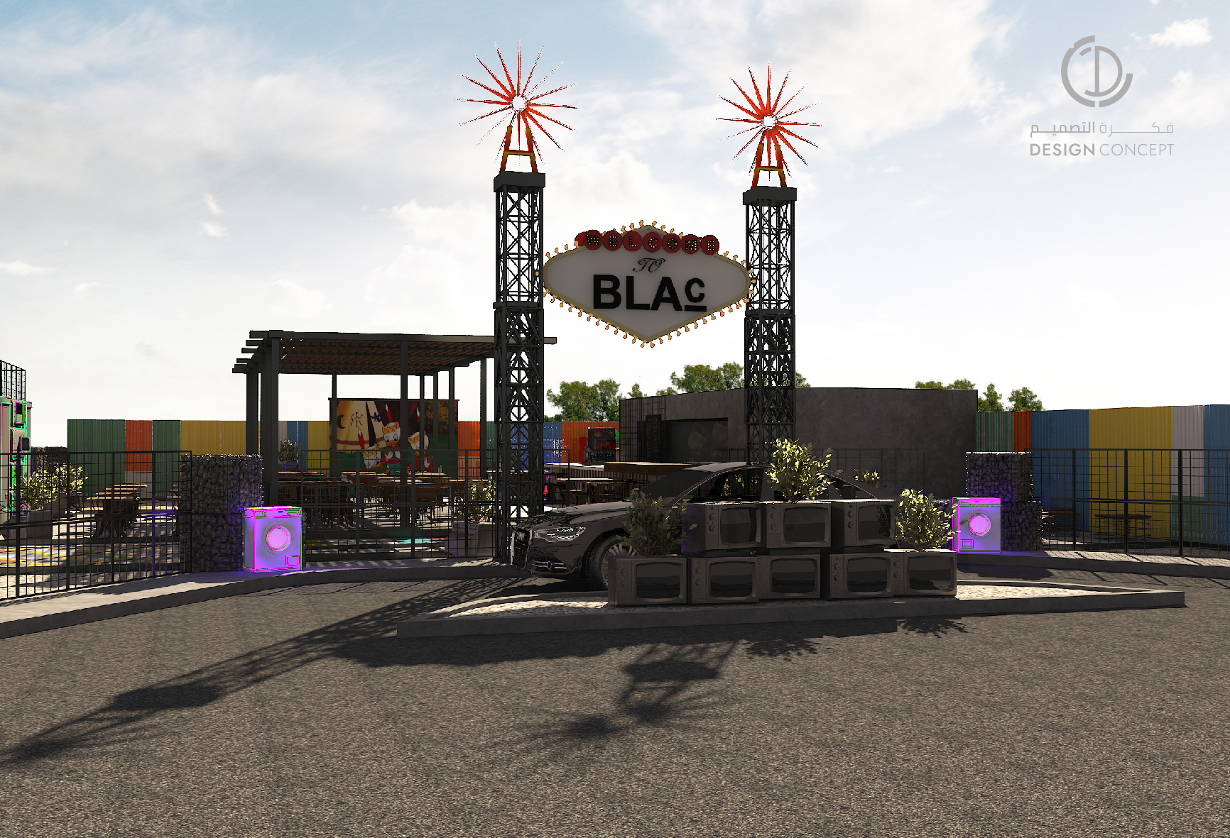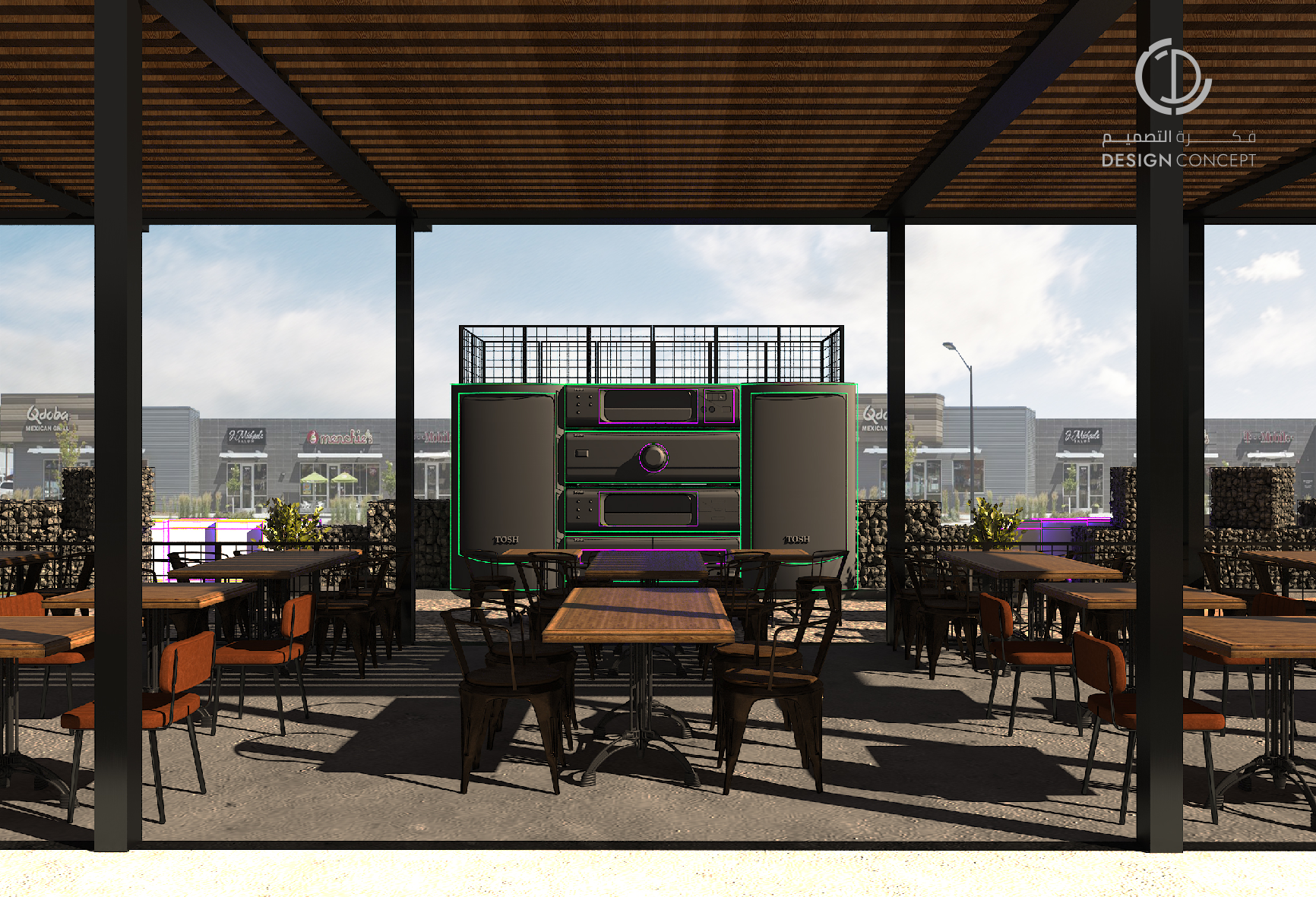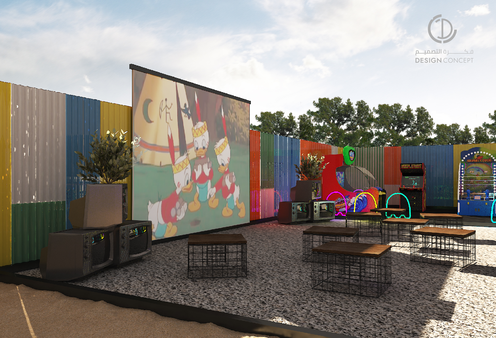 عبارة عن جلسات خارجية، مطعم ومساحة ترفيهية، حرصنا على خلق بيئة مرحة من خلال استخدام ألوان متنوعة كالأحمر، الأصفر والأزرق والحرص على دمجهم معًا بشكل متناسب.