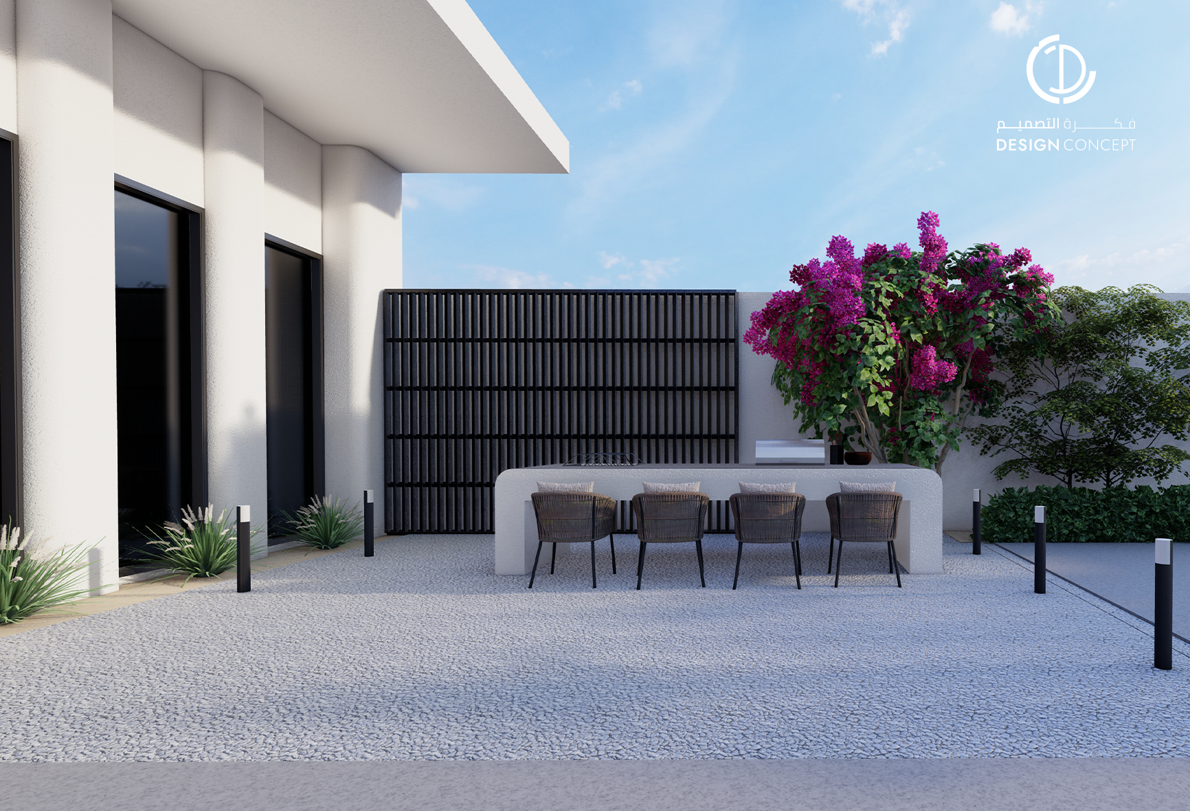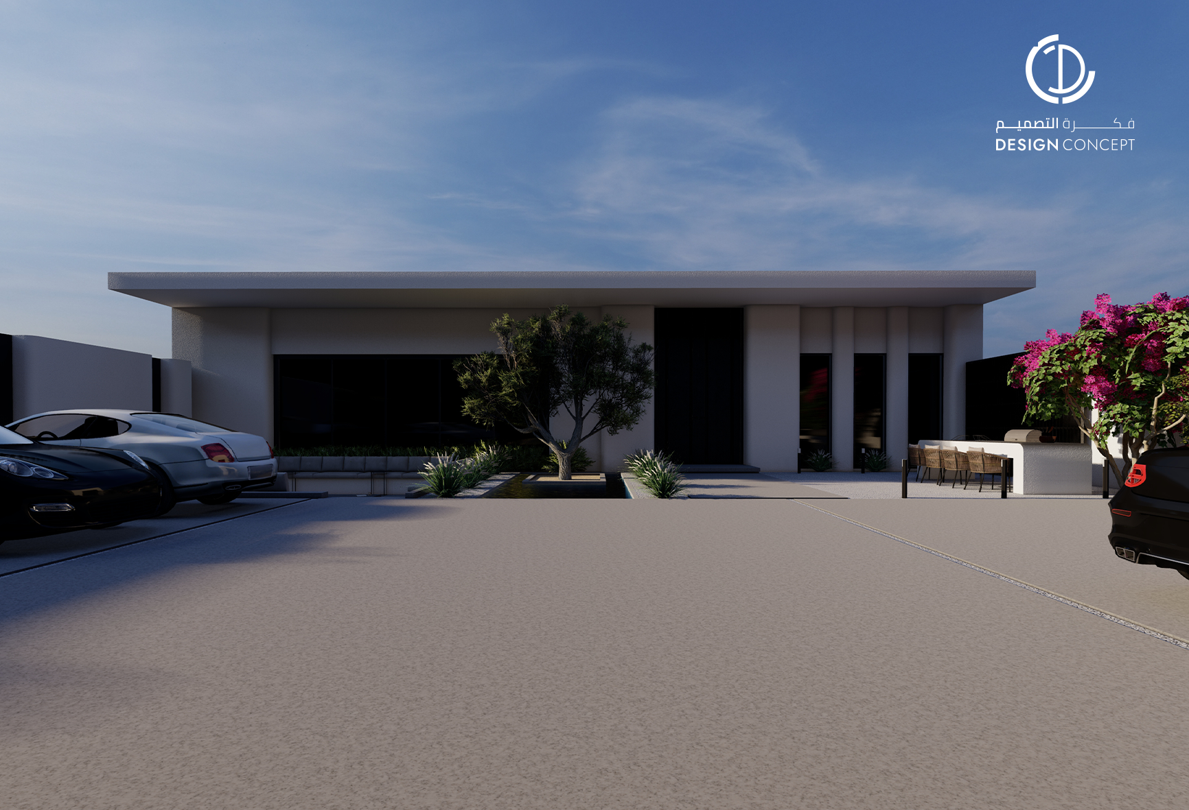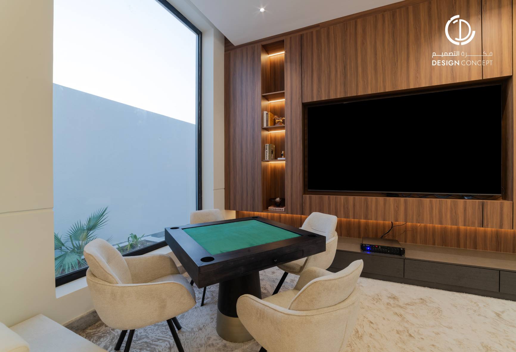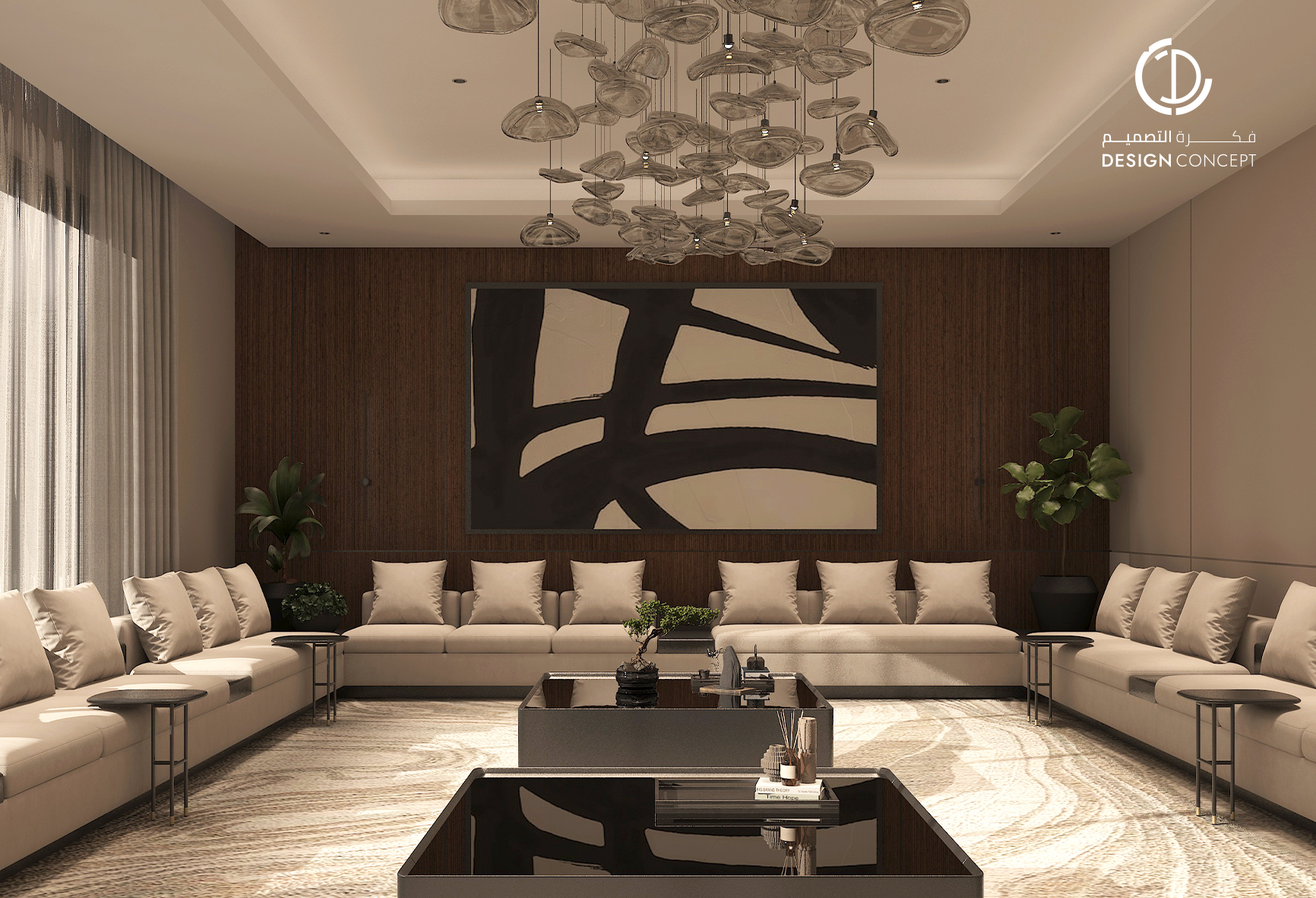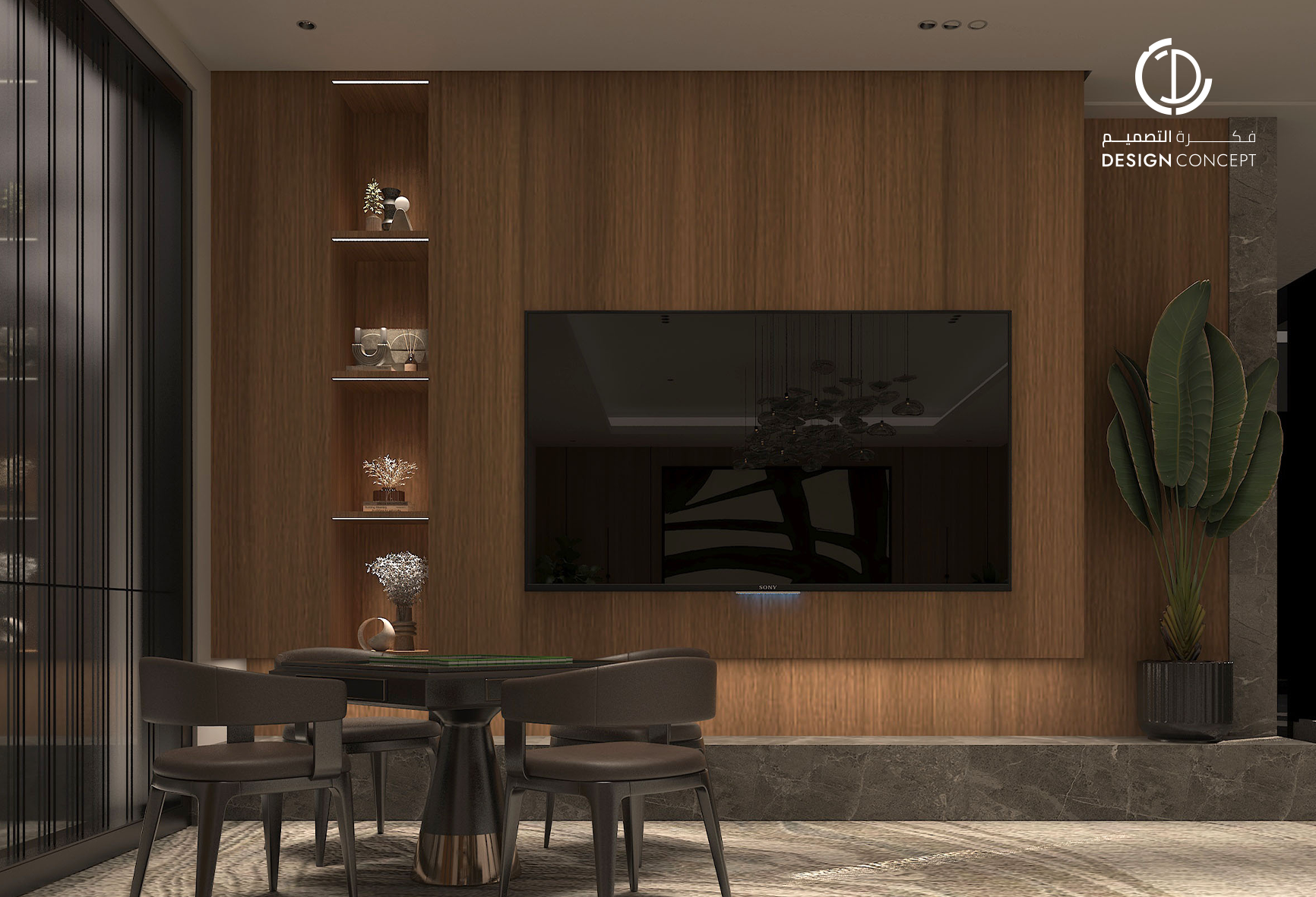 مشروع تصميم داخلي سكني مع الحديقة، عبارة عن ديوانية تتضمن جلسة خارجية مع منطقة الشواء، منطقة استقبال، مجلس داخلي، منطقة طاولة الطعام، دورات مياه، اعتمدنا في التصميم على اختيار ألوان غامقة للتعبير عن الفخامة مع اختيار اكسسوارات مميزة كالثريا.