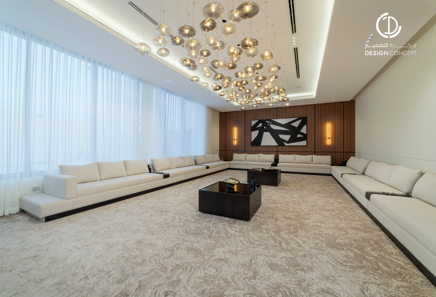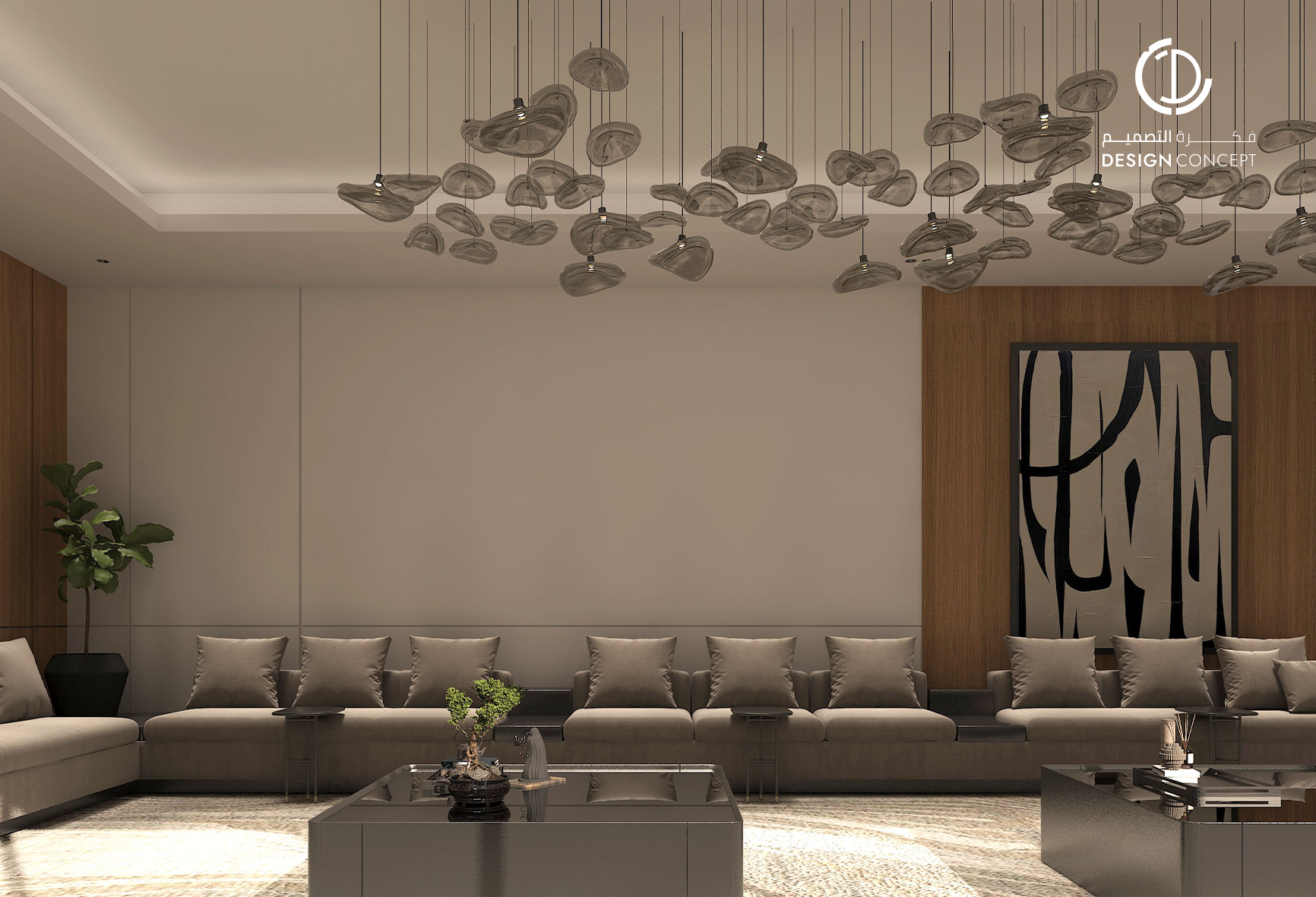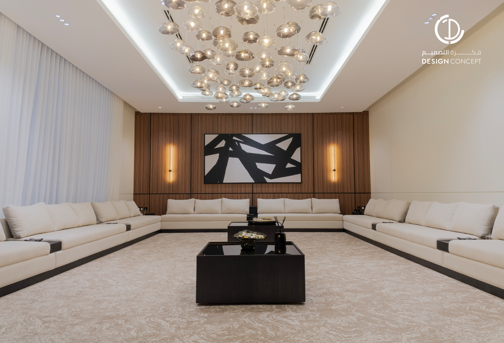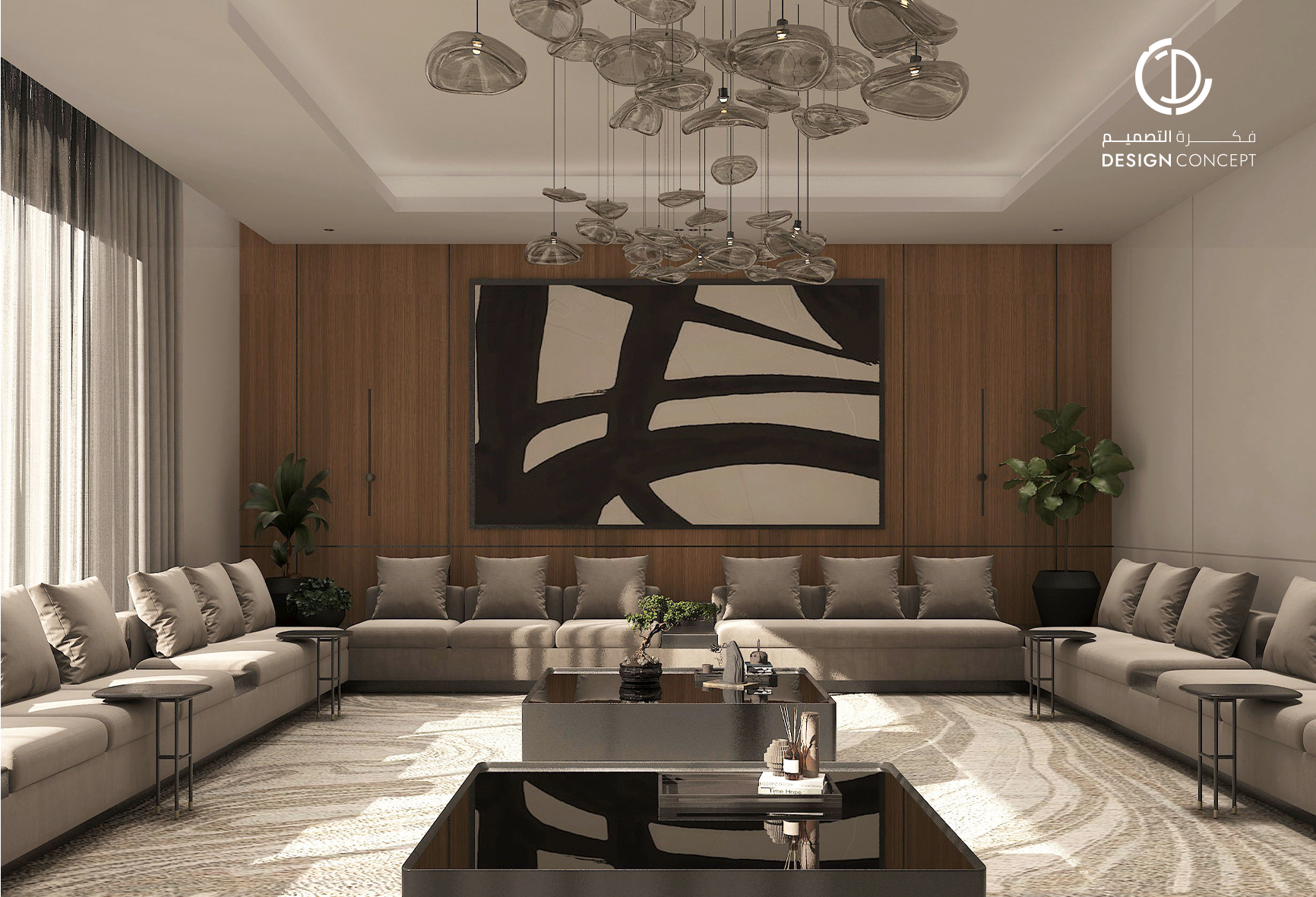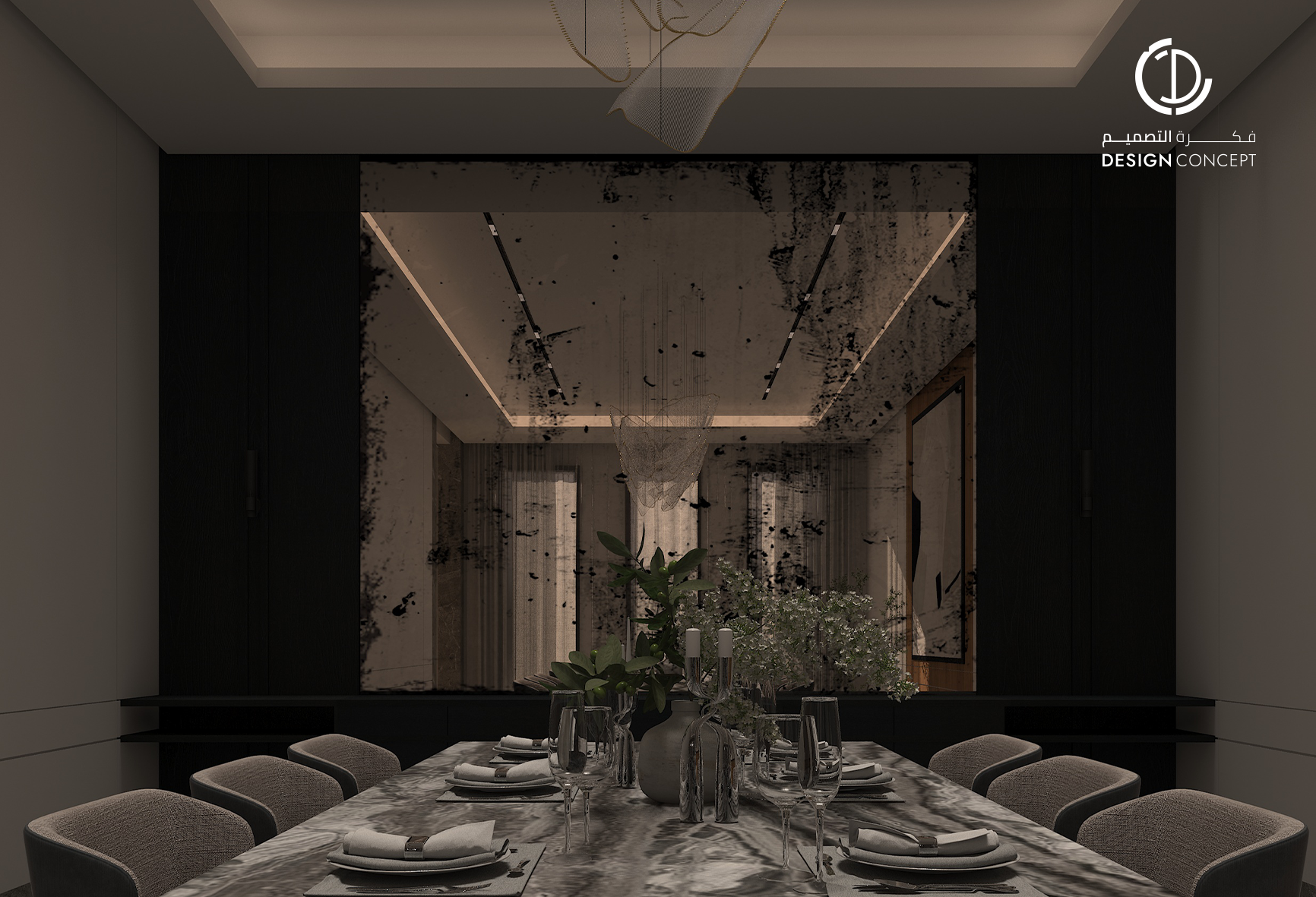 مشروع تصميم داخلي سكني مع الحديقة، عبارة عن ديوانية تتضمن جلسة خارجية مع منطقة الشواء، منطقة استقبال، مجلس داخلي، منطقة طاولة الطعام، دورات مياه، اعتمدنا في التصميم على اختيار ألوان غامقة للتعبير عن الفخامة مع اختيار اكسسوارات مميزة كالثريا.