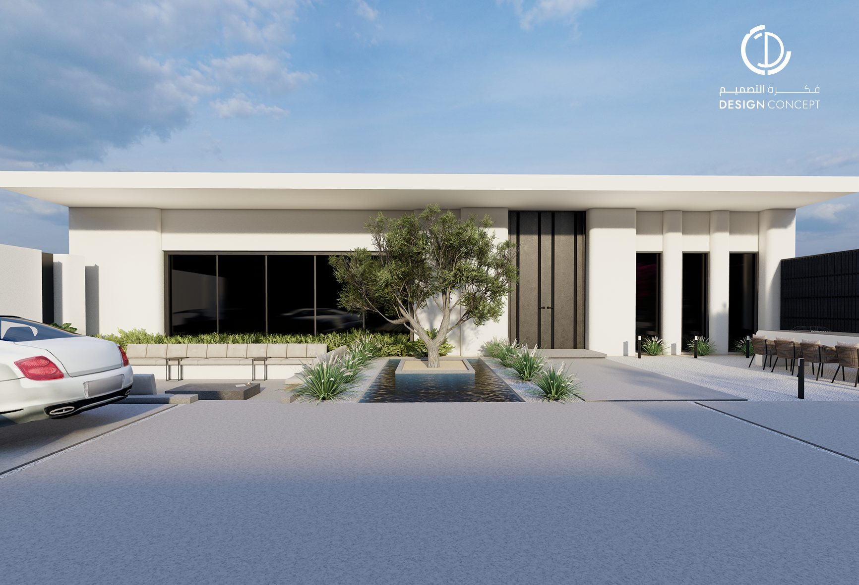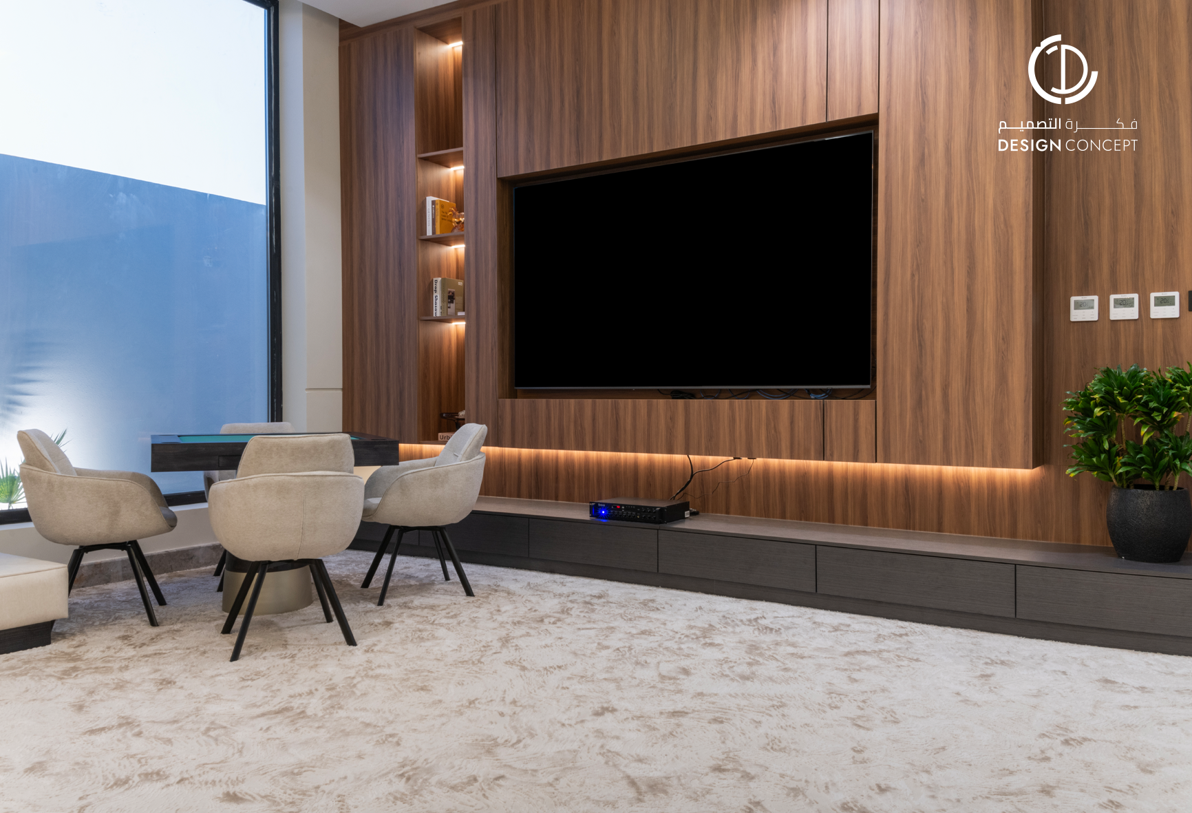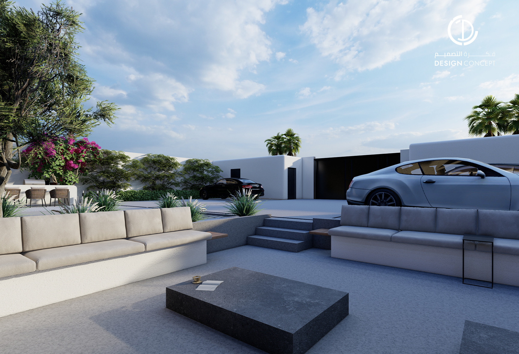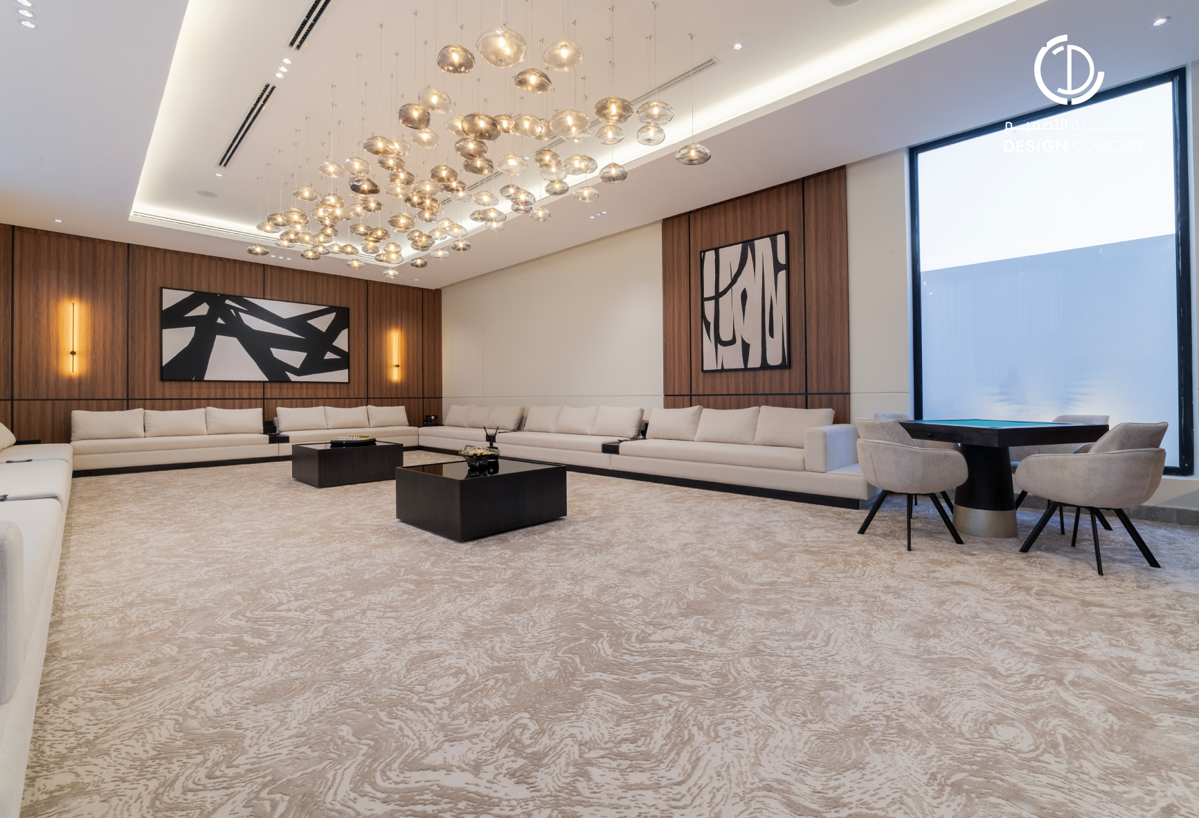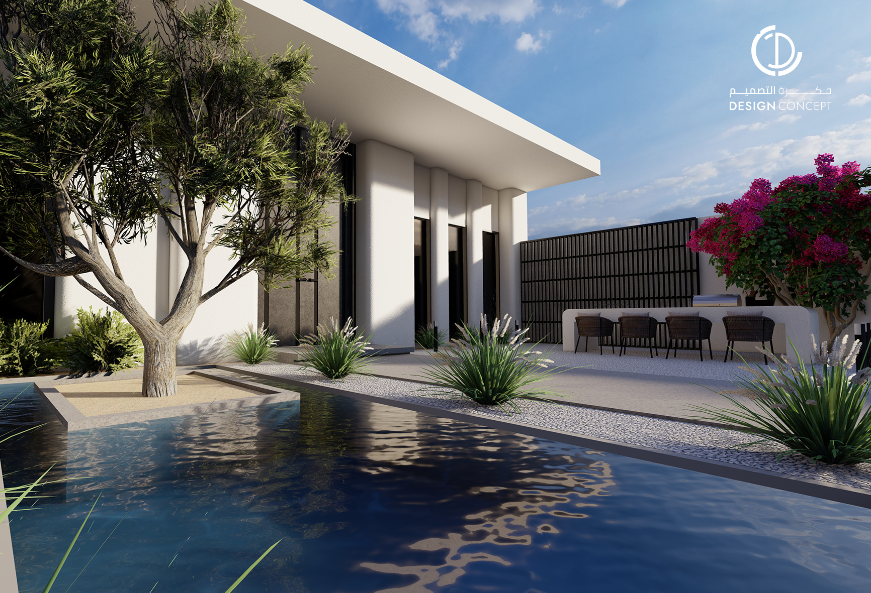 مشروع تصميم داخلي سكني مع الحديقة، عبارة عن ديوانية تتضمن جلسة خارجية مع منطقة الشواء، منطقة استقبال، مجلس داخلي، منطقة طاولة الطعام، دورات مياه، اعتمدنا في التصميم على اختيار ألوان غامقة للتعبير عن الفخامة مع اختيار اكسسوارات مميزة كالثريا.