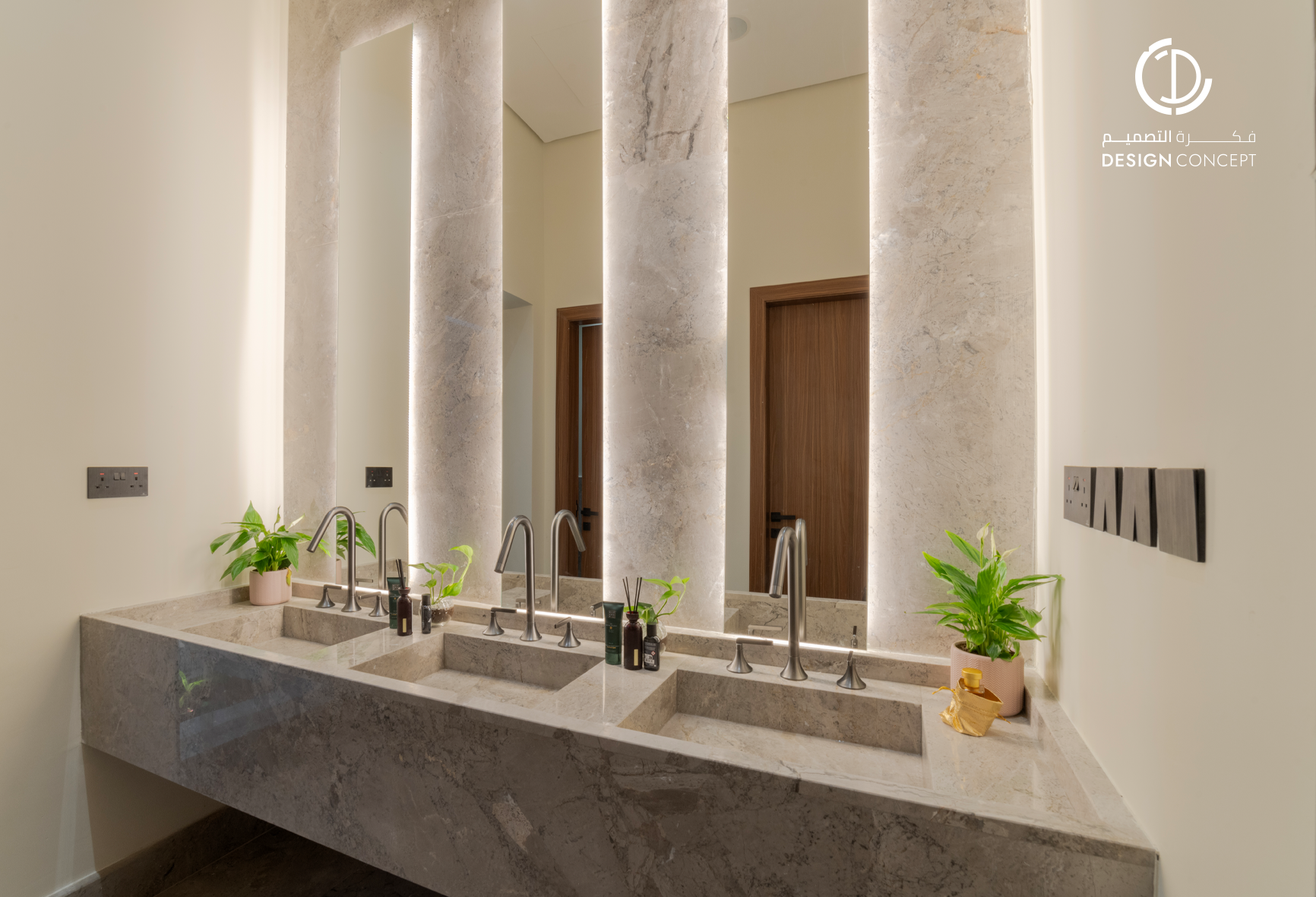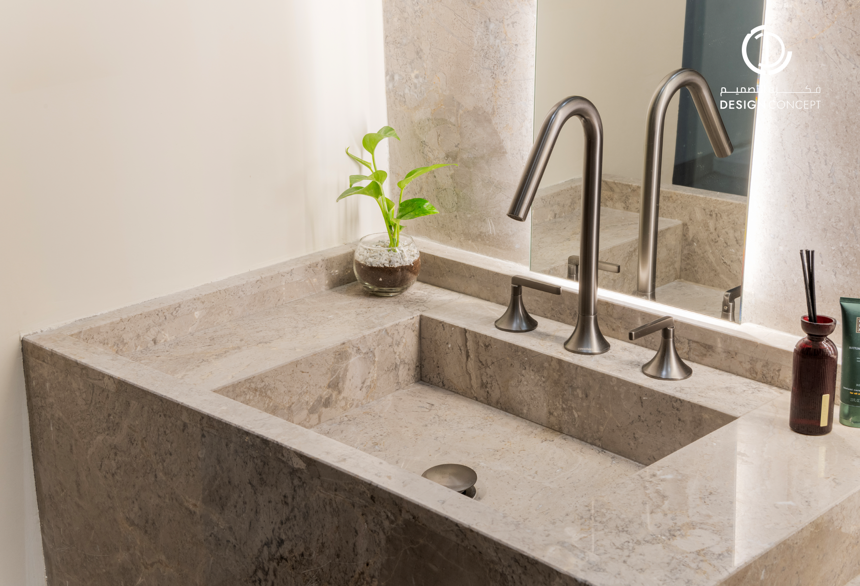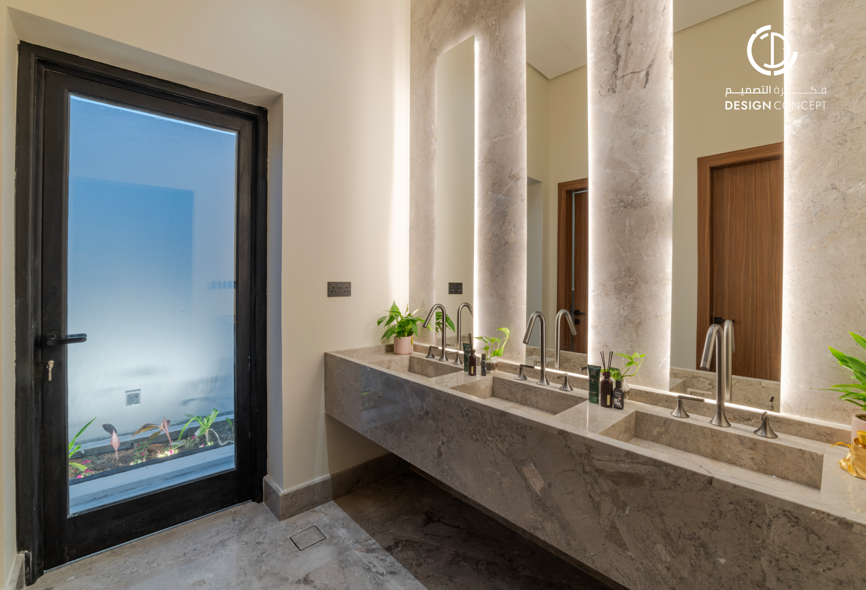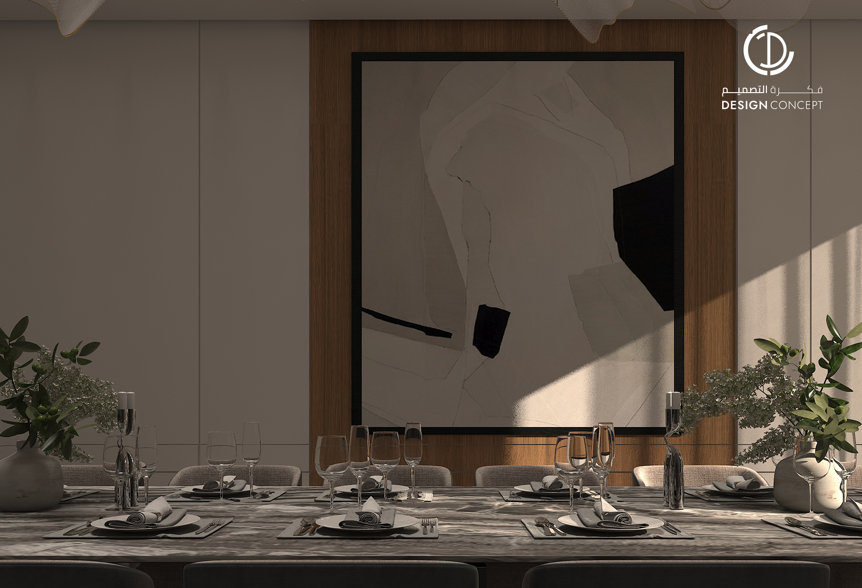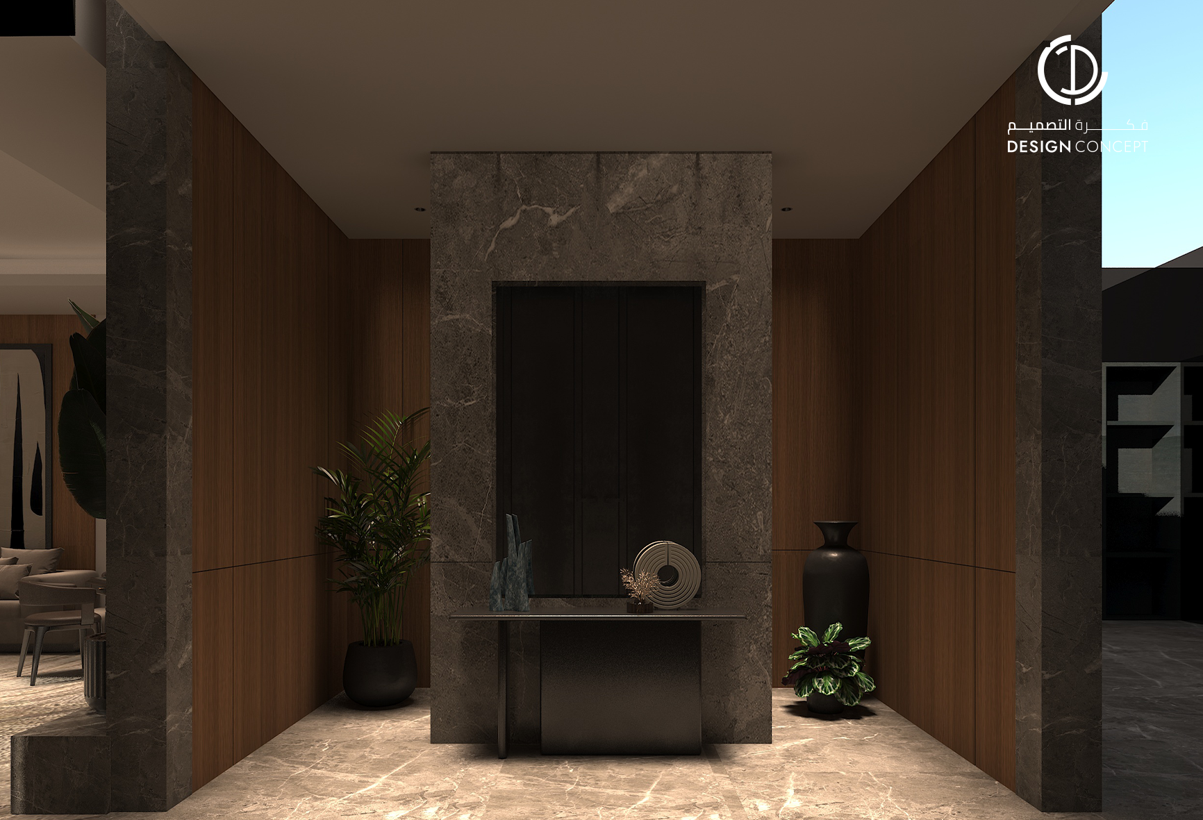 مشروع تصميم داخلي سكني مع الحديقة، عبارة عن ديوانية تتضمن جلسة خارجية مع منطقة الشواء، منطقة استقبال، مجلس داخلي، منطقة طاولة الطعام، دورات مياه، اعتمدنا في التصميم على اختيار ألوان غامقة للتعبير عن الفخامة مع اختيار اكسسوارات مميزة كالثريا.