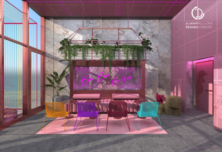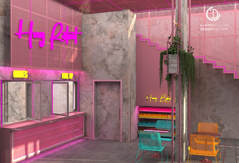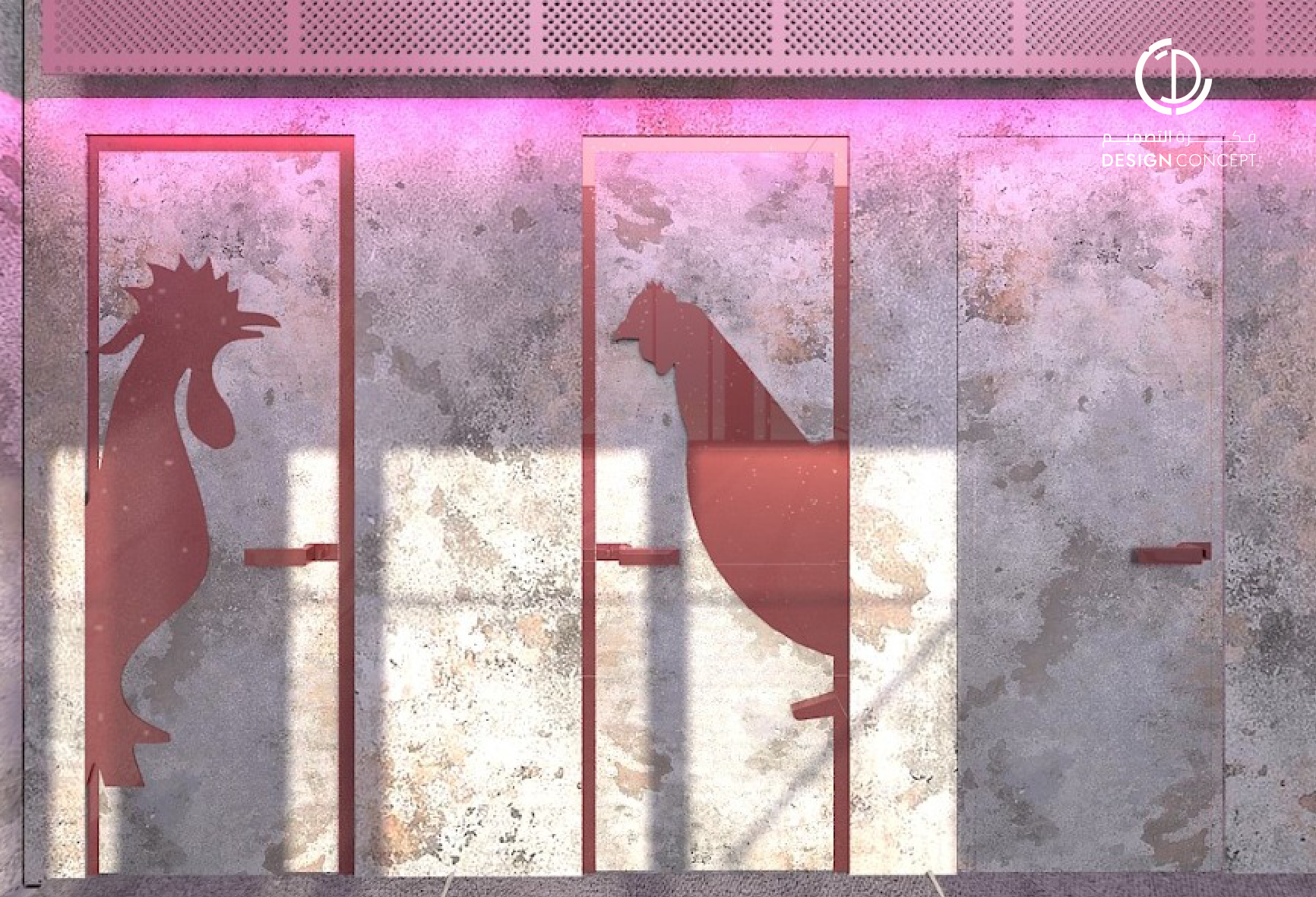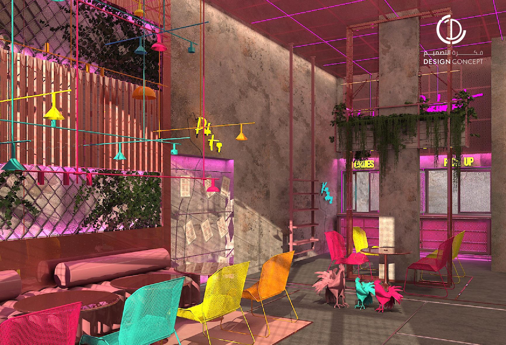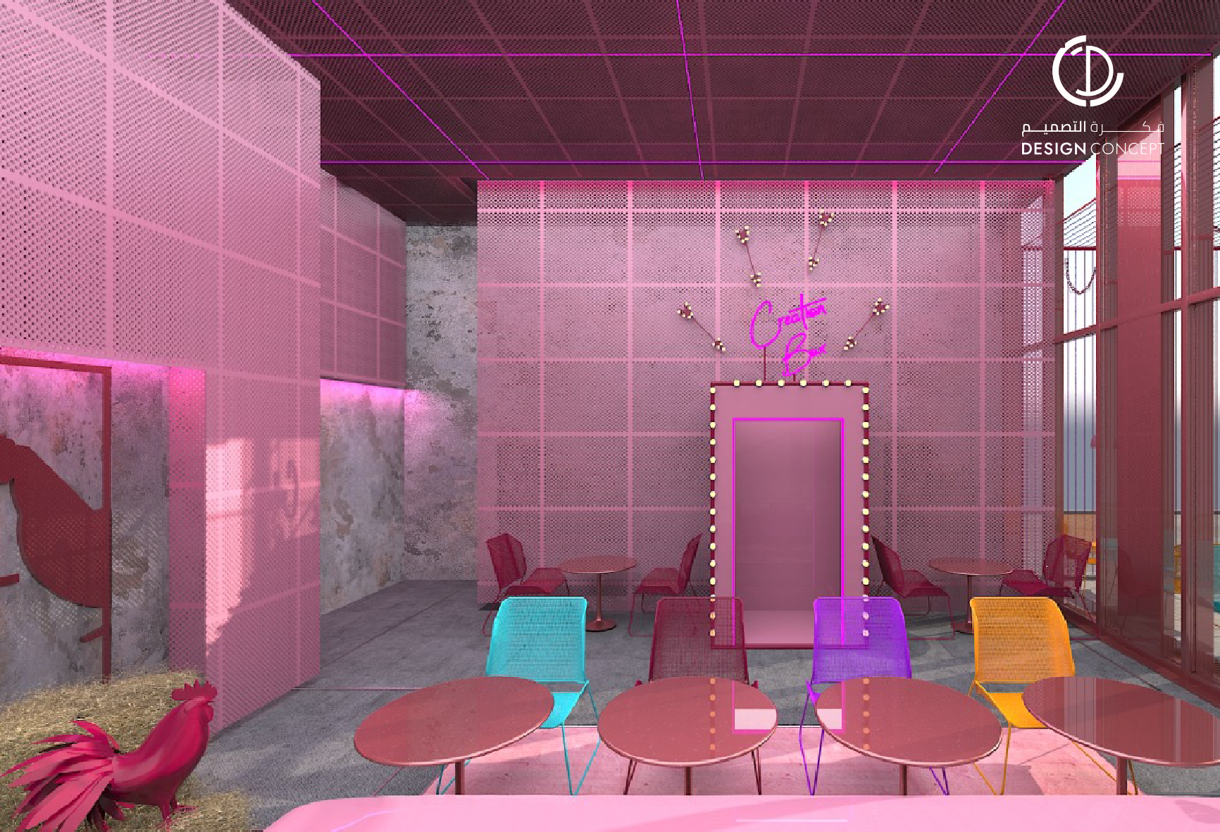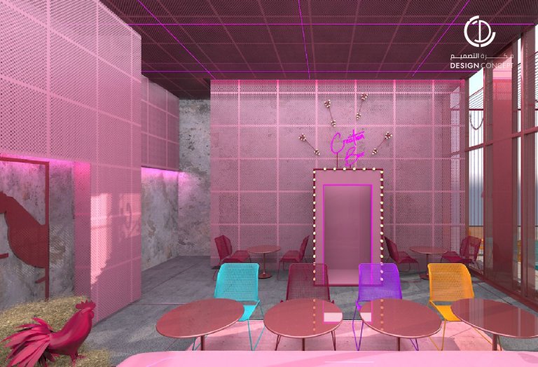 تم تصميم المطعم بأسلوب هزلي يستقطب فئة الشباب وذلك بتطبيق عناصر حظيرة الدجاج بطريقة معاصرة والتي تتمثل بشبك الحديد، الفواصل، ثلاجات تخزين البيض، الحواجز، رفوف البيض، الخطوط المستقيمة وأسطح مصقولة.