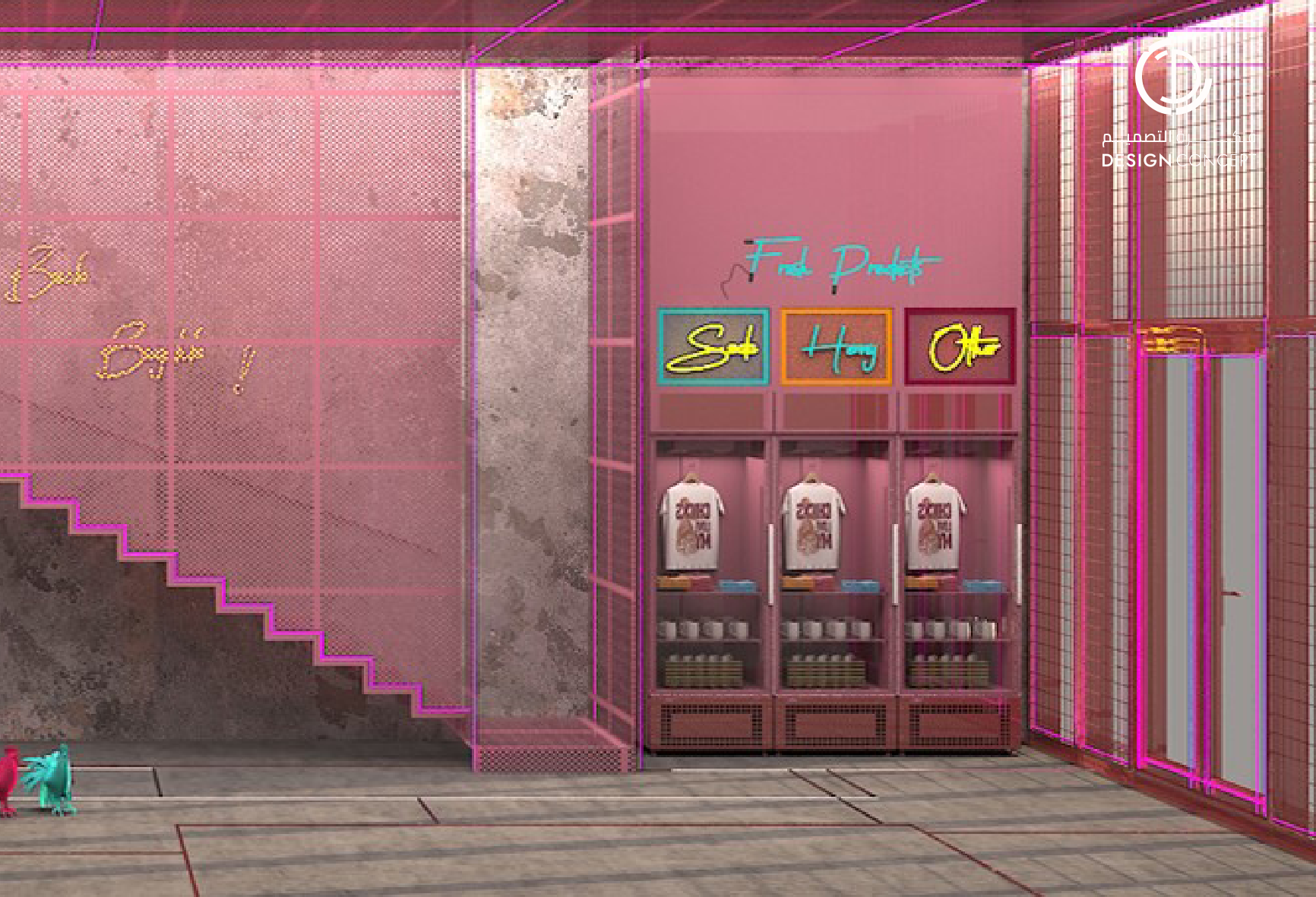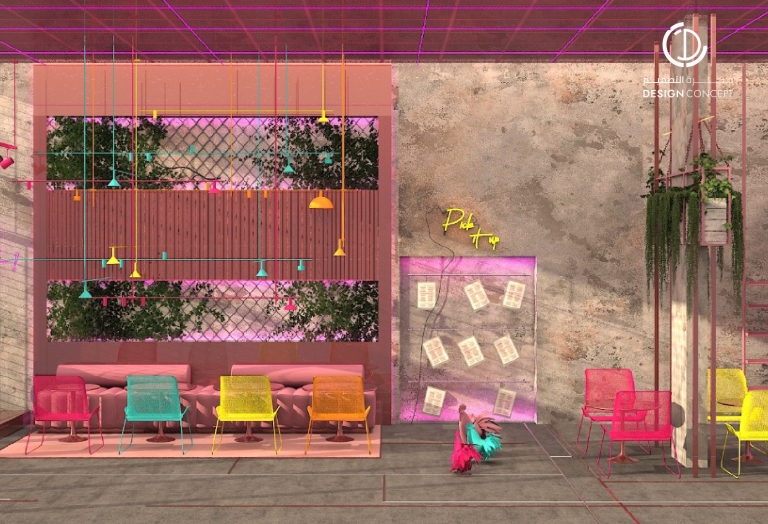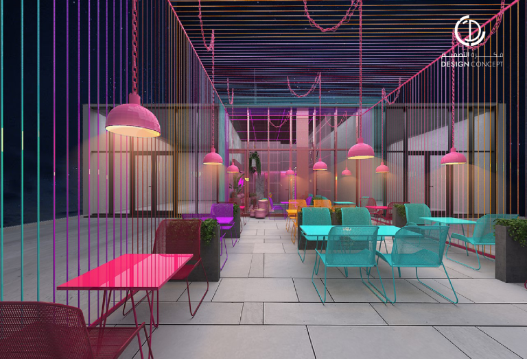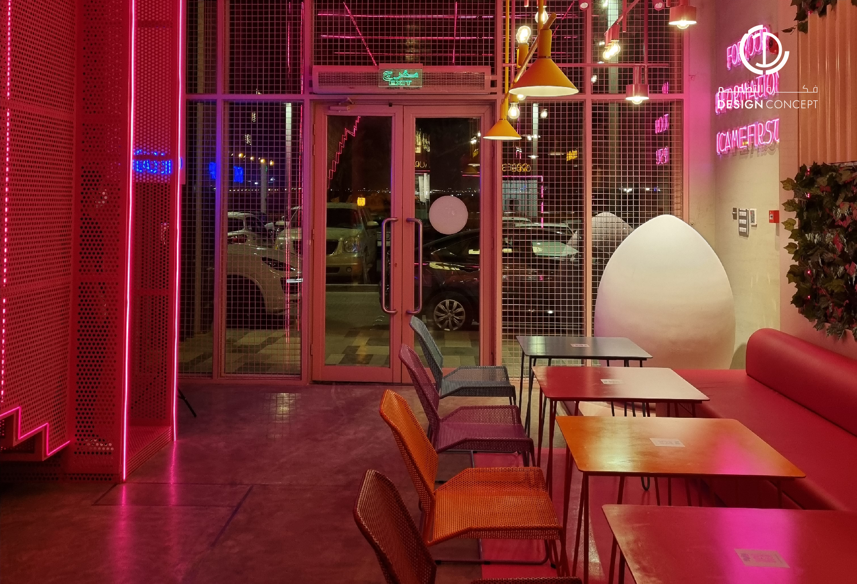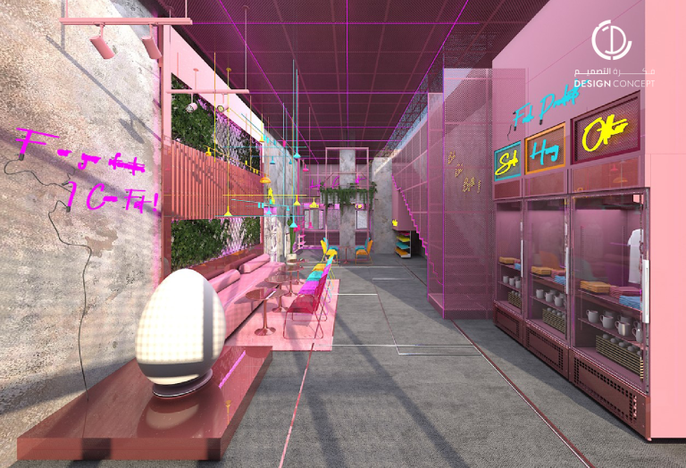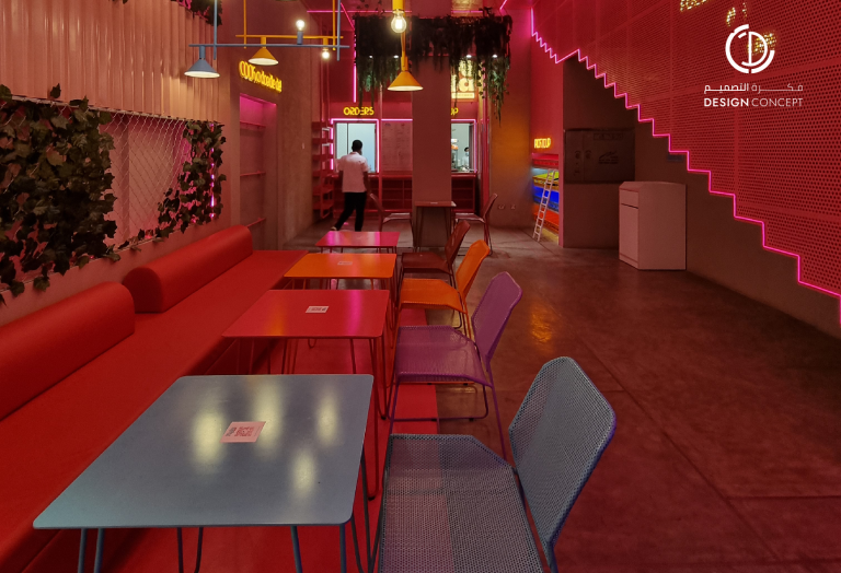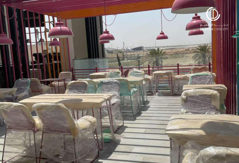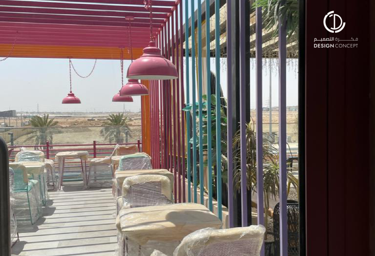 تم تصميم المطعم بأسلوب هزلي يستقطب فئة الشباب وذلك بتطبيق عناصر حظيرة الدجاج بطريقة معاصرة والتي تتمثل بشبك الحديد، الفواصل، ثلاجات تخزين البيض، الحواجز، رفوف البيض، الخطوط المستقيمة وأسطح مصقولة.