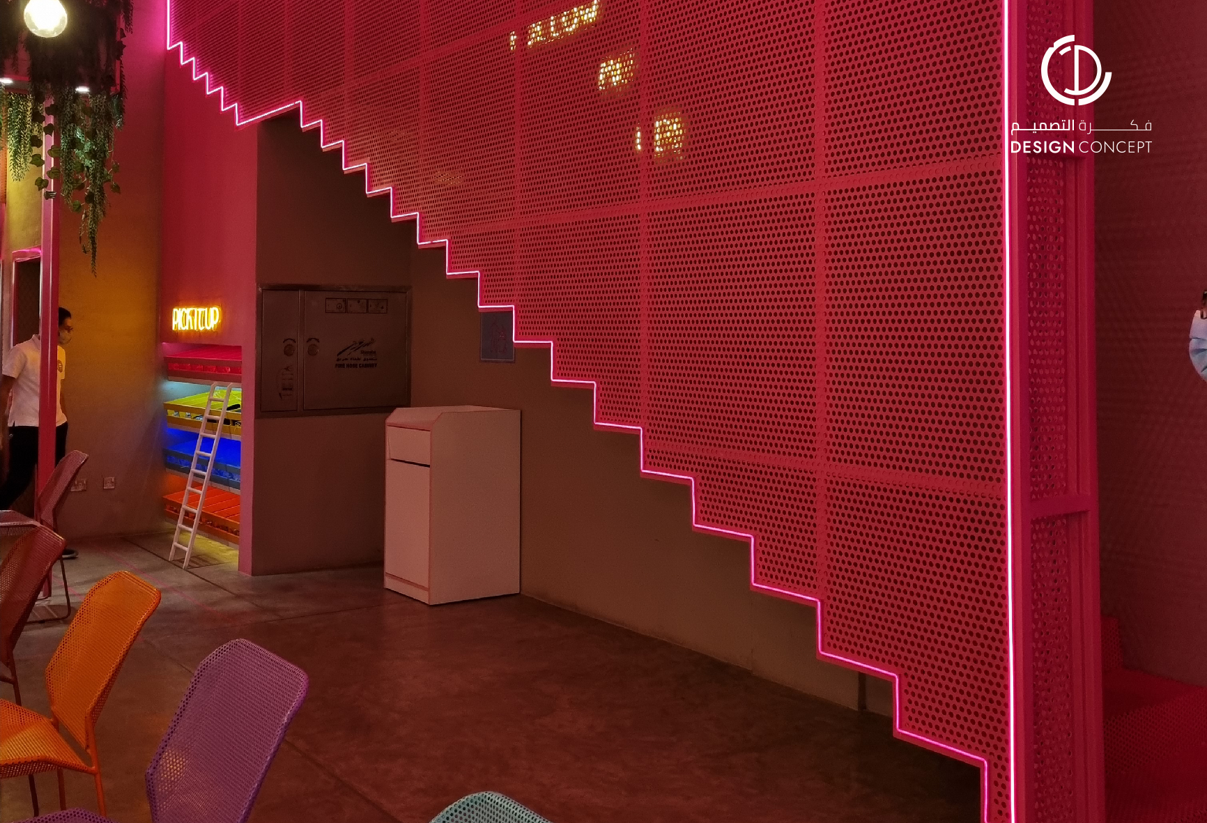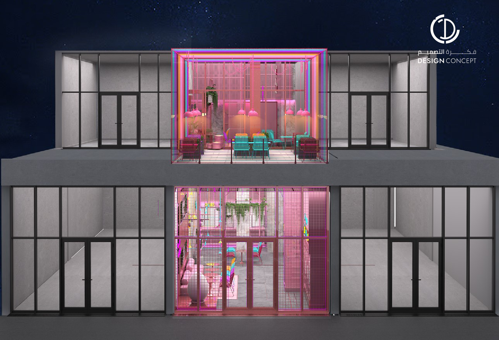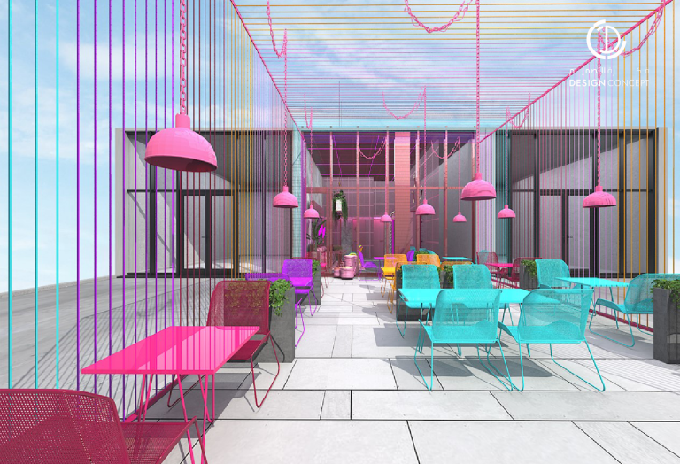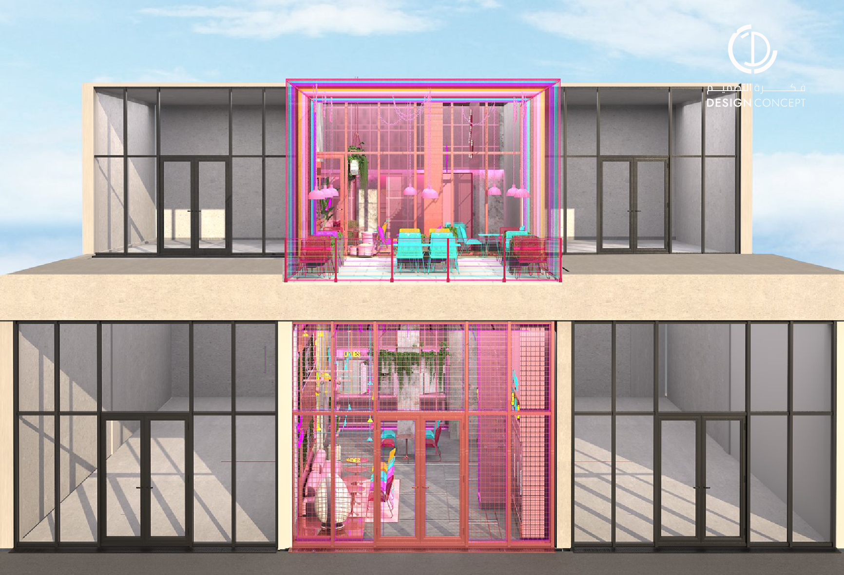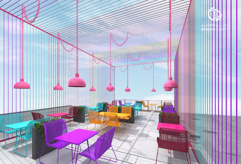تم تصميم المطعم بأسلوب هزلي يستقطب فئة الشباب وذلك بتطبيق عناصر حظيرة الدجاج بطريقة معاصرة والتي تتمثل بشبك الحديد، الفواصل، ثلاجات تخزين البيض، الحواجز، رفوف البيض، الخطوط المستقيمة وأسطح مصقولة.