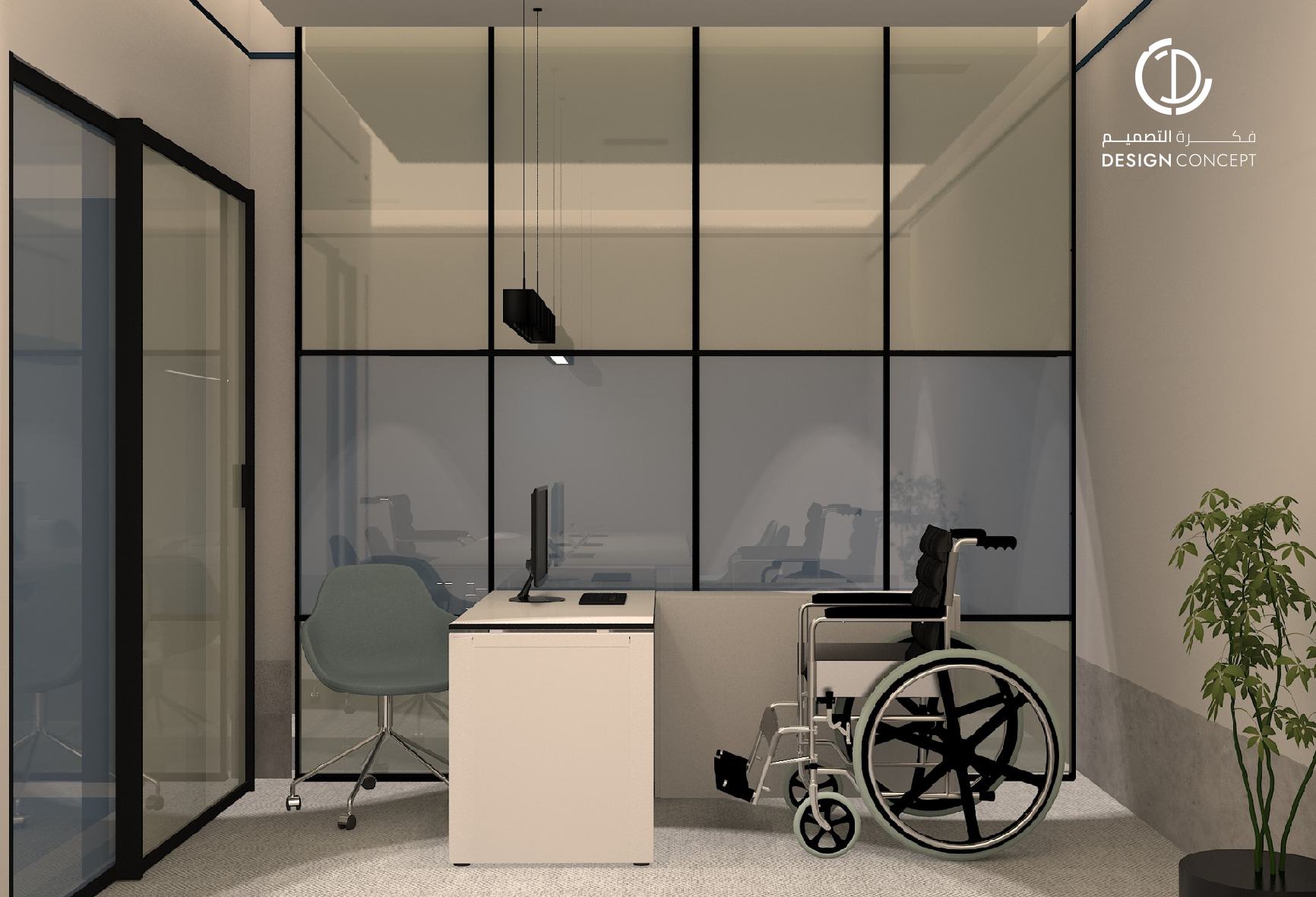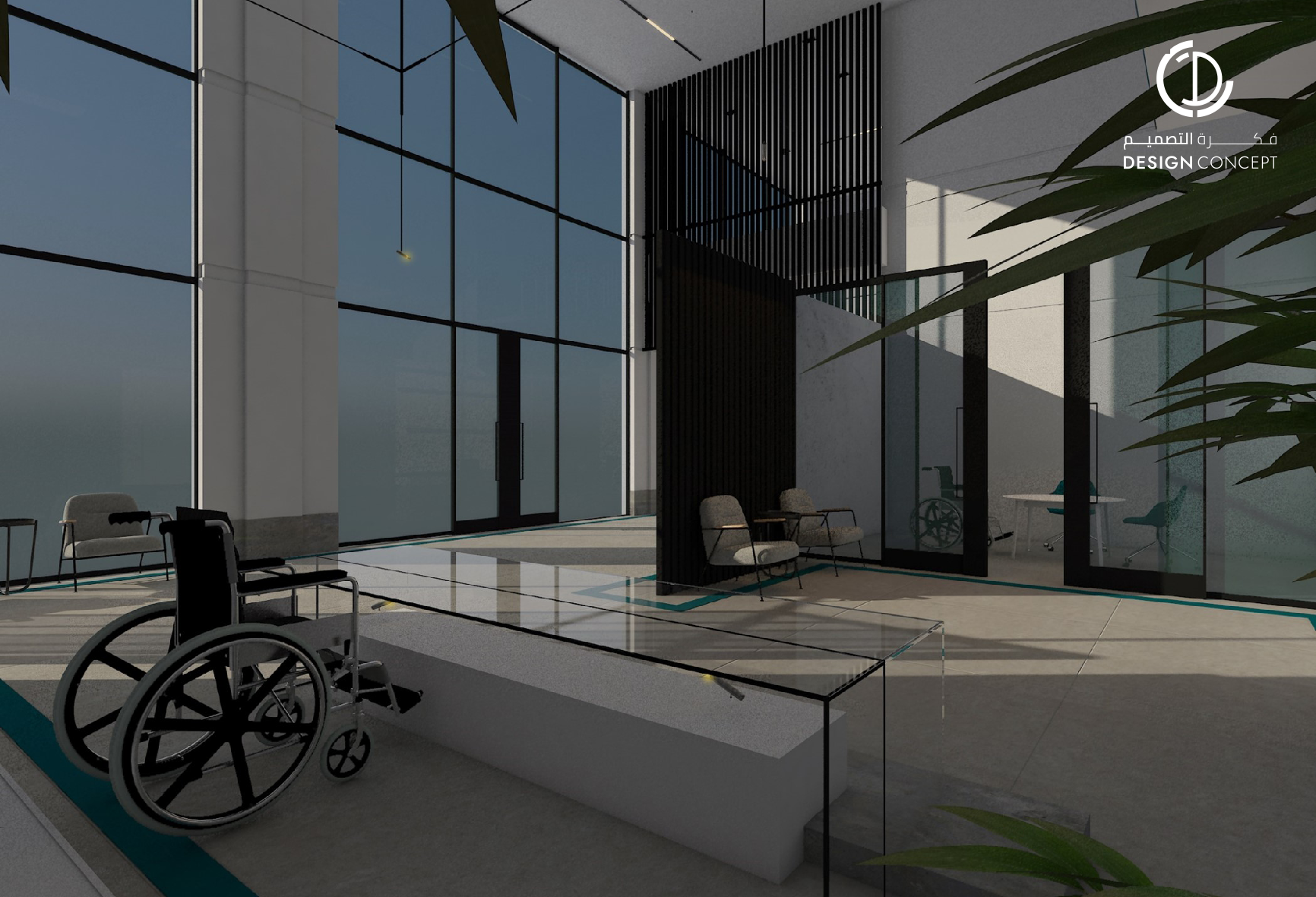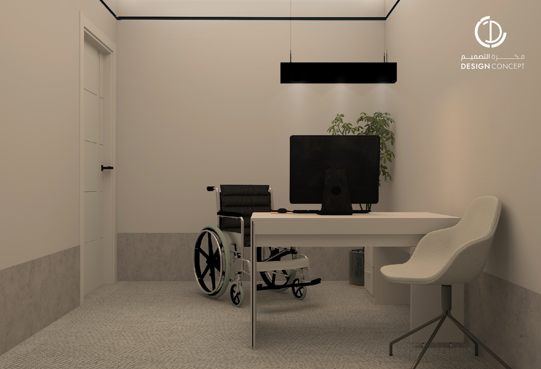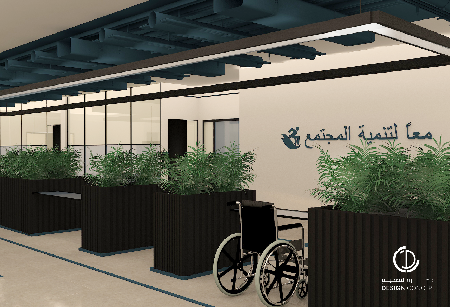 تصميم داخلي للجمعية مع مراعاة دورها في استهداف ذوي الإعاقة الحركية، شملت الفكرة التصميمة مضمون الشفافية والأُحادية، فغلب على التصميم توحيد الألوان مع تقسيم الحيزات لمناطق عامة ومناطق خاصة للموظفين.