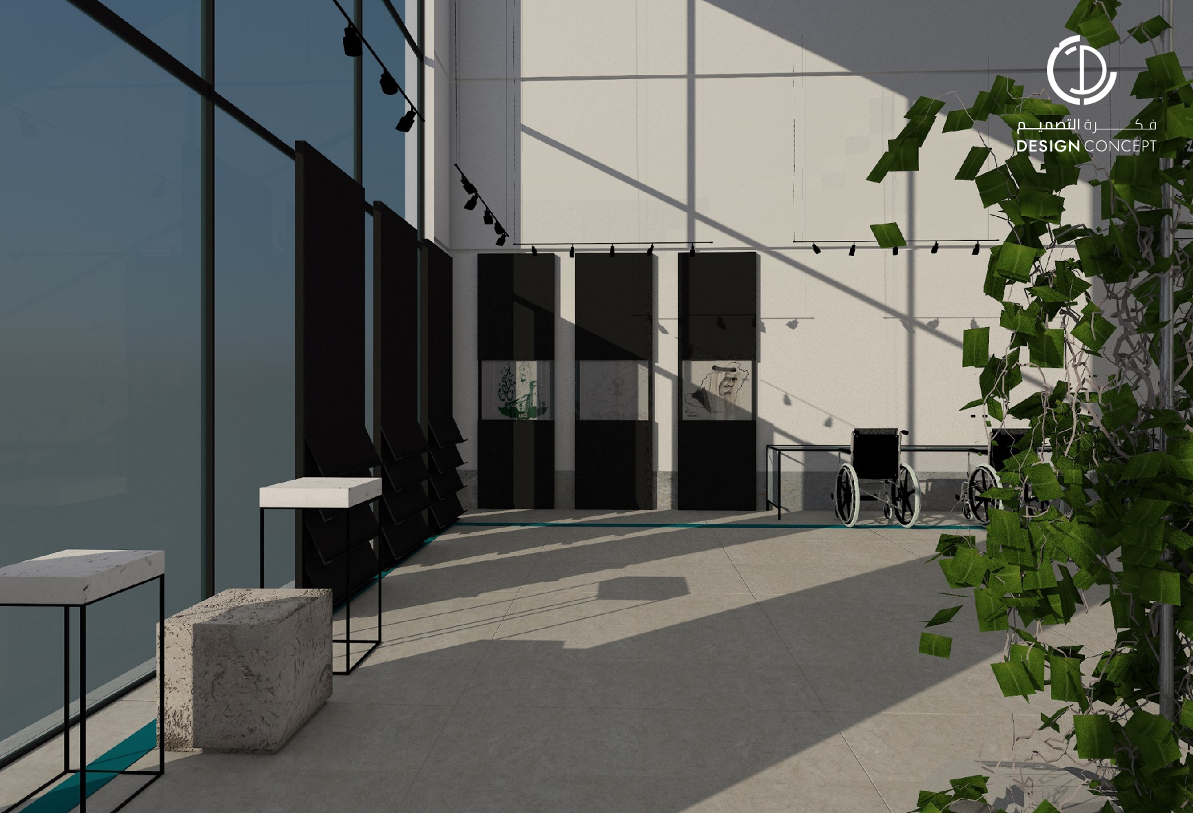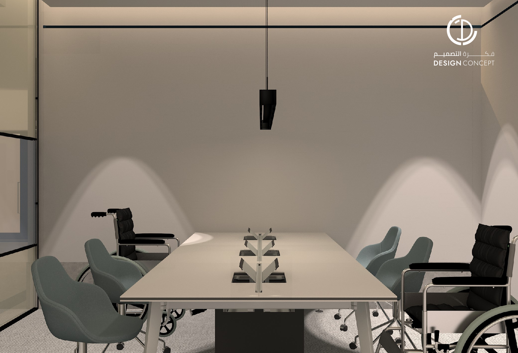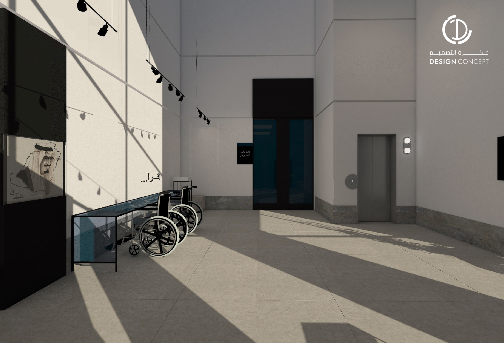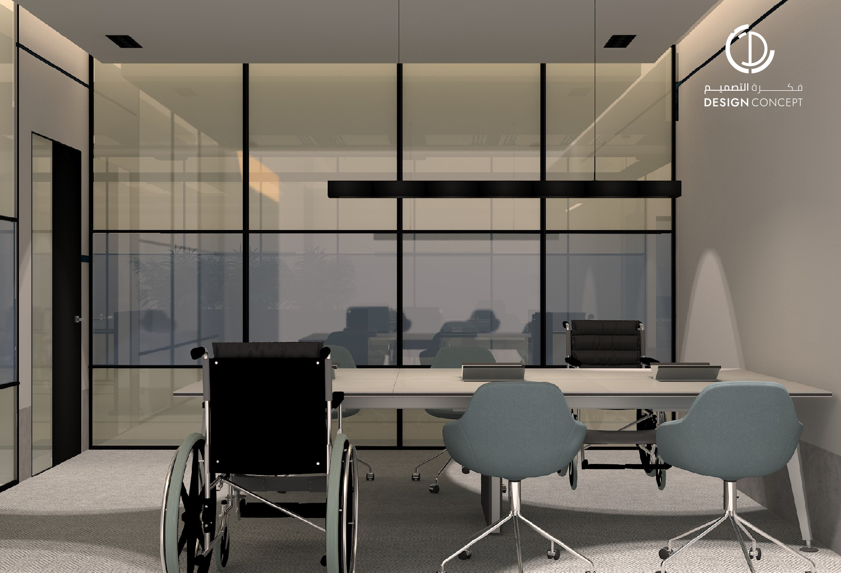 تصميم داخلي للجمعية مع مراعاة دورها في استهداف ذوي الإعاقة الحركية، شملت الفكرة التصميمة مضمون الشفافية والأُحادية، فغلب على التصميم توحيد الألوان مع تقسيم الحيزات لمناطق عامة ومناطق خاصة للموظفين.