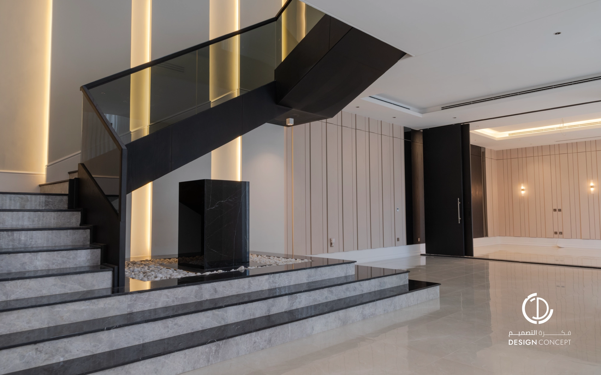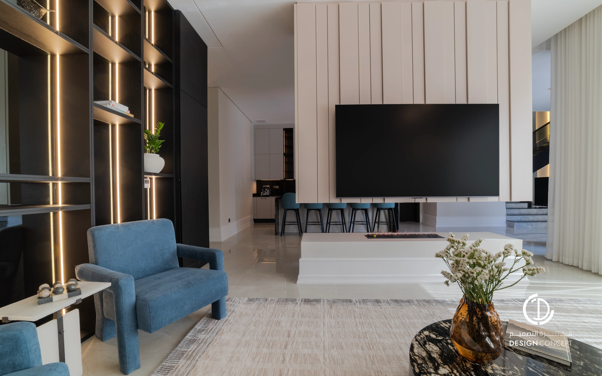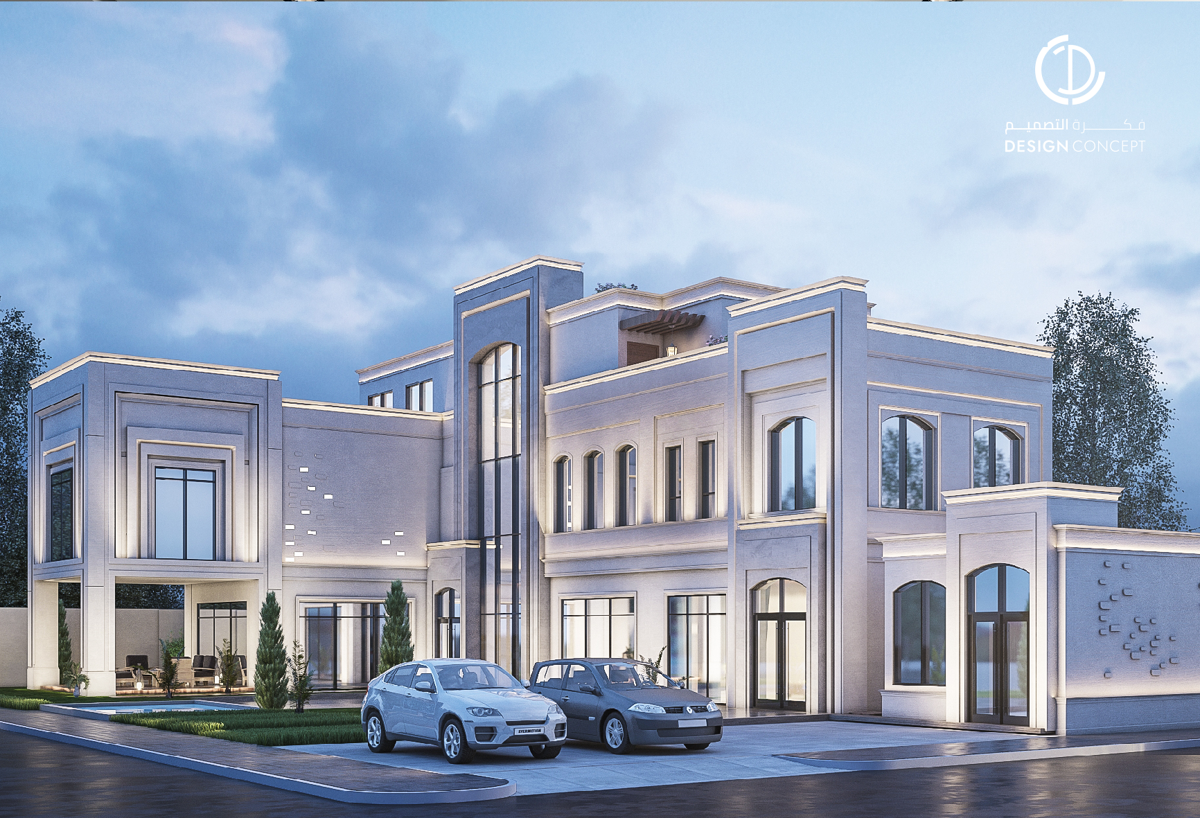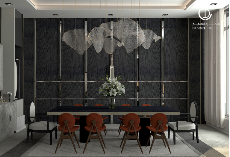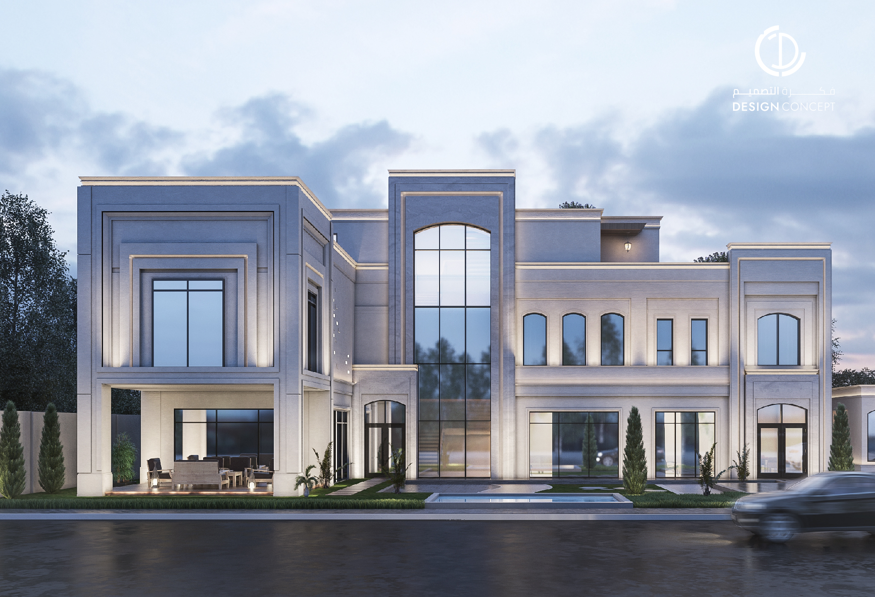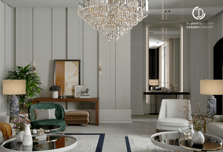 صُممت الڤيلا لتوافق ذوق المالك في حُبه للتفاصيل الكلاسيكية ورغبته بحيزات مفتوحة تُحاكي النمط الحديث، اعتمدنا في التصميم الداخلي على دمج العناصر الكلاسيكية مع النمط المعاصر، أما التصميم المعماري صُمم بضلعين متبايني الأبعاد يغلب على واجهاته نوافذ طويلة.
