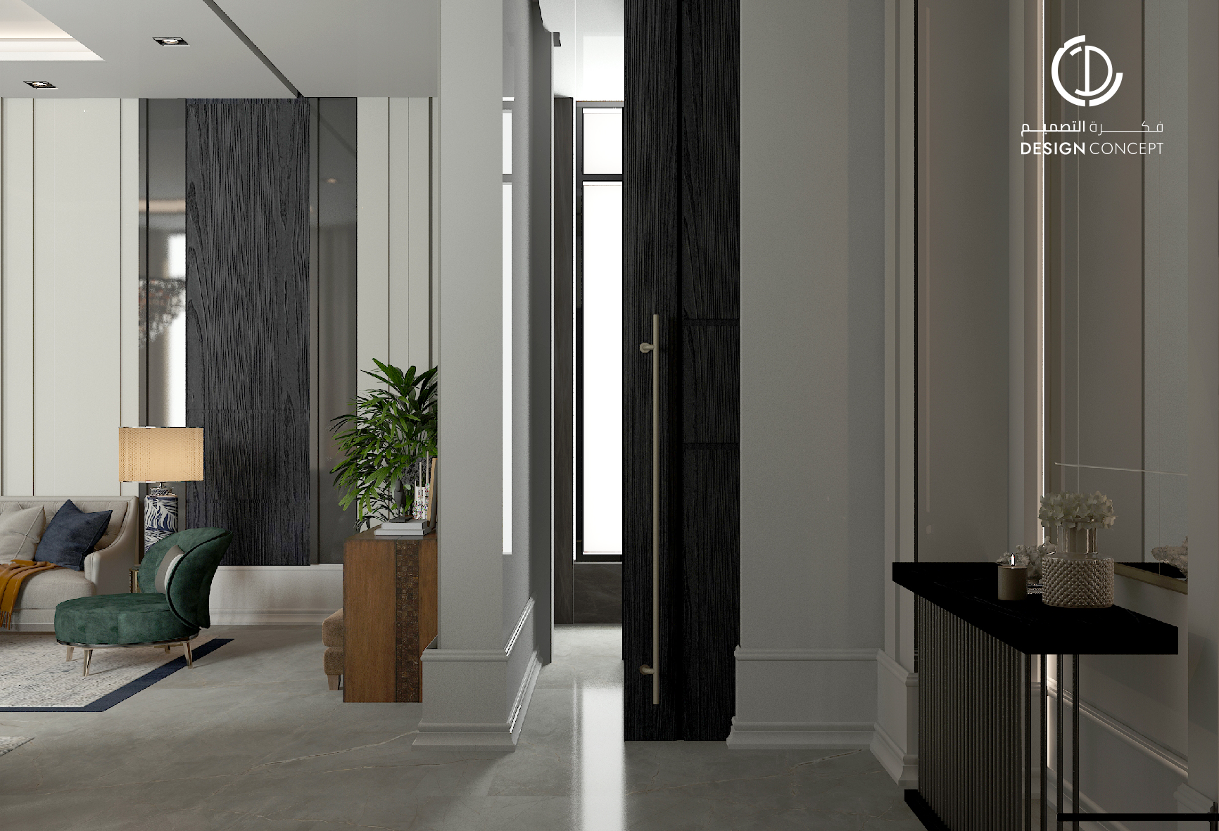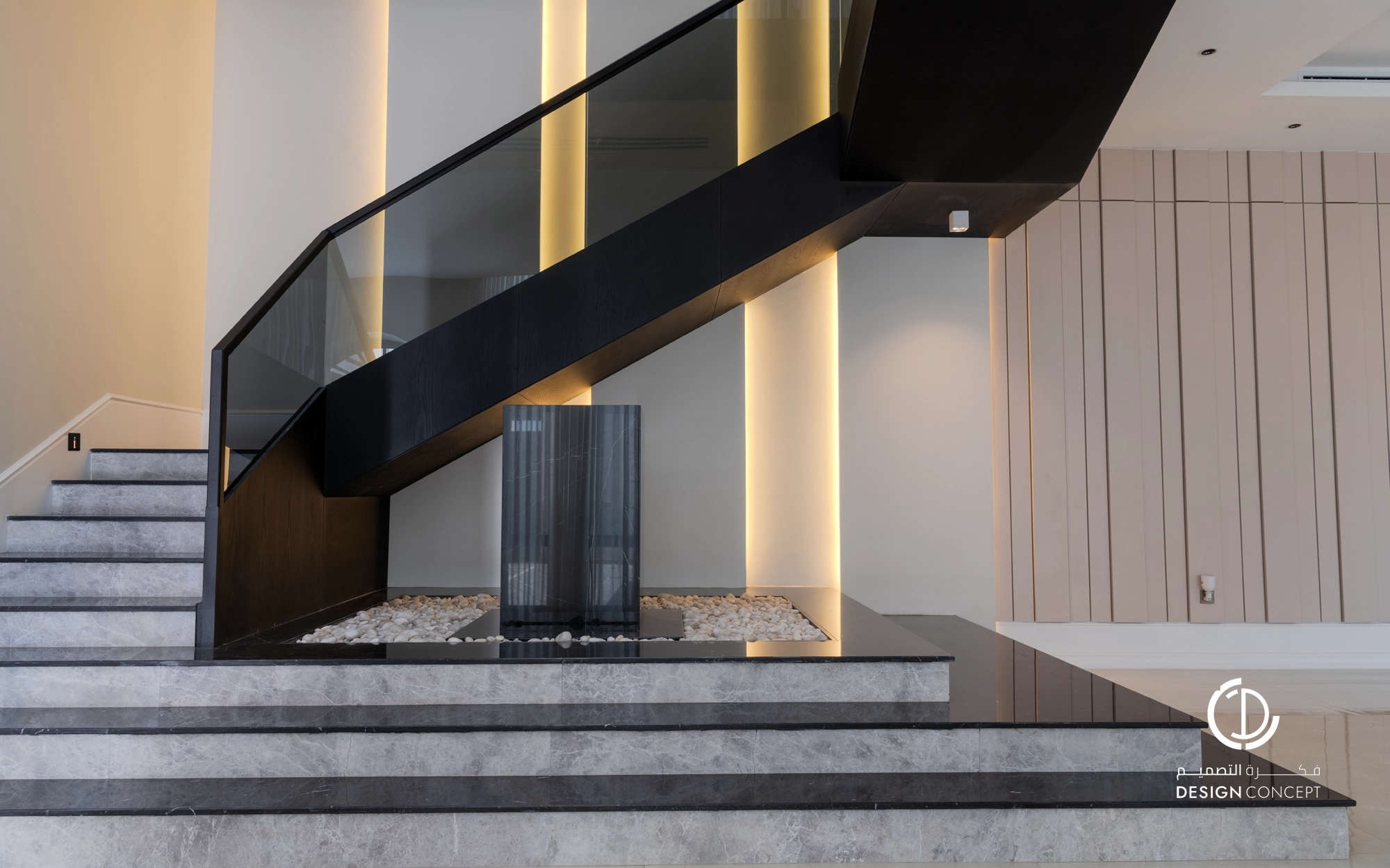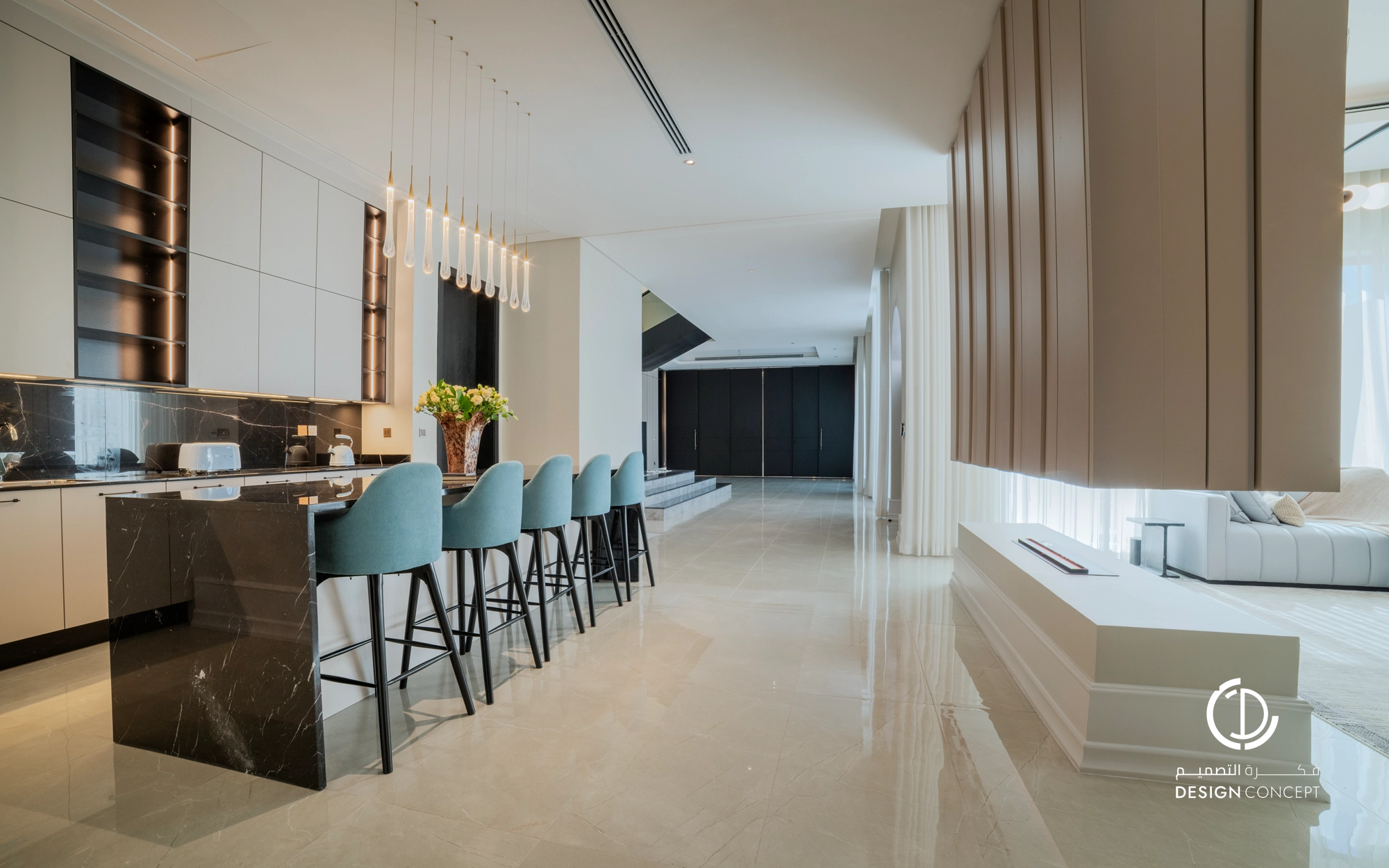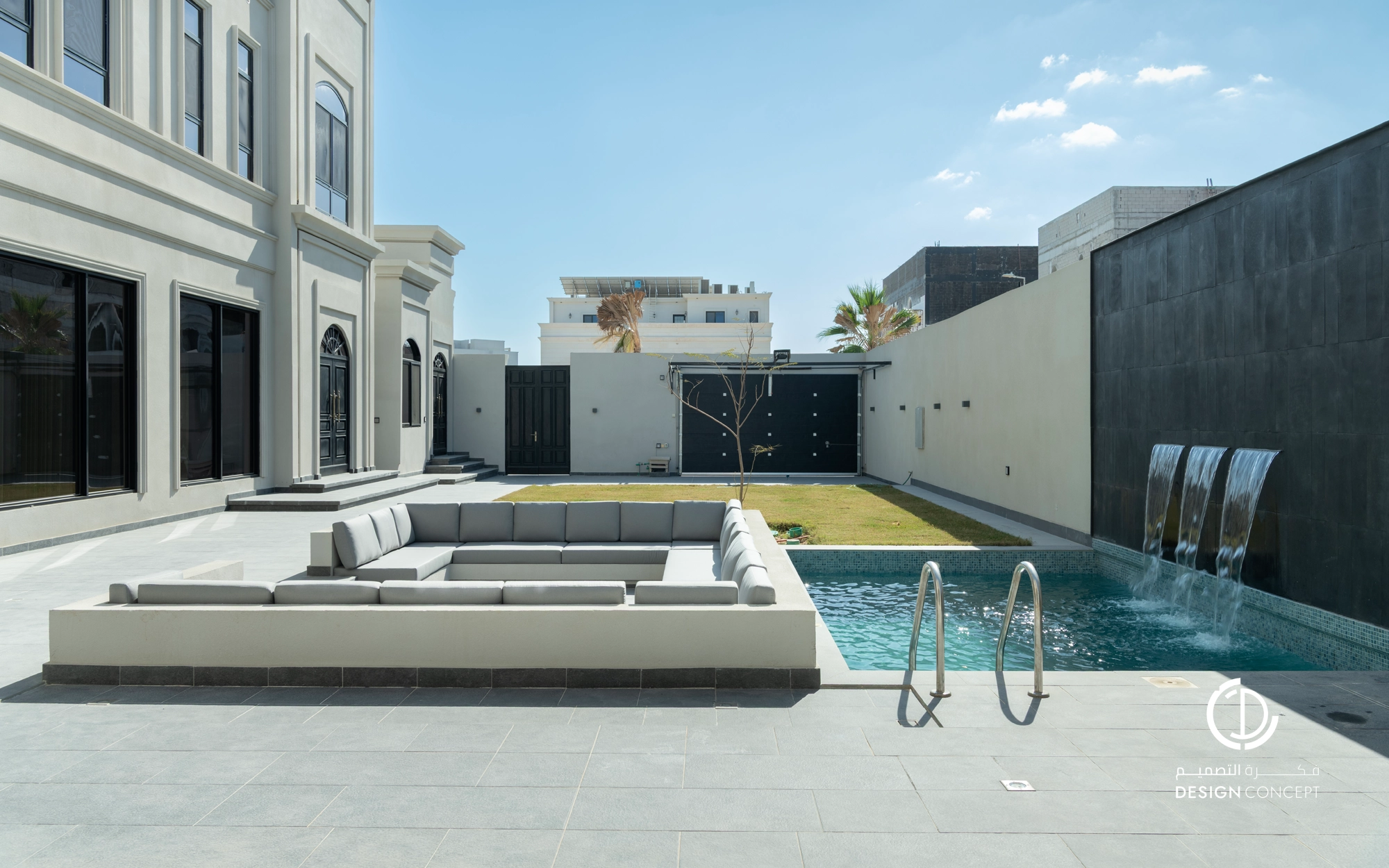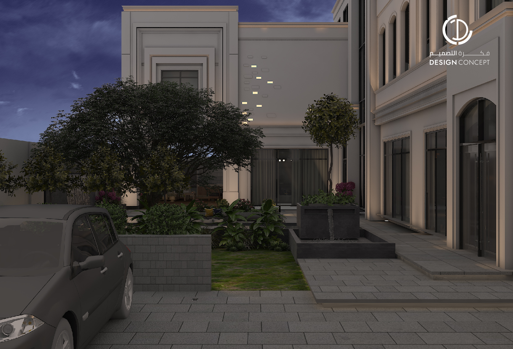 صُممت الڤيلا لتوافق ذوق المالك في حُبه للتفاصيل الكلاسيكية ورغبته بحيزات مفتوحة تُحاكي النمط الحديث، اعتمدنا في التصميم الداخلي على دمج العناصر الكلاسيكية مع النمط المعاصر، أما التصميم المعماري صُمم بضلعين متبايني الأبعاد يغلب على واجهاته نوافذ طويلة.