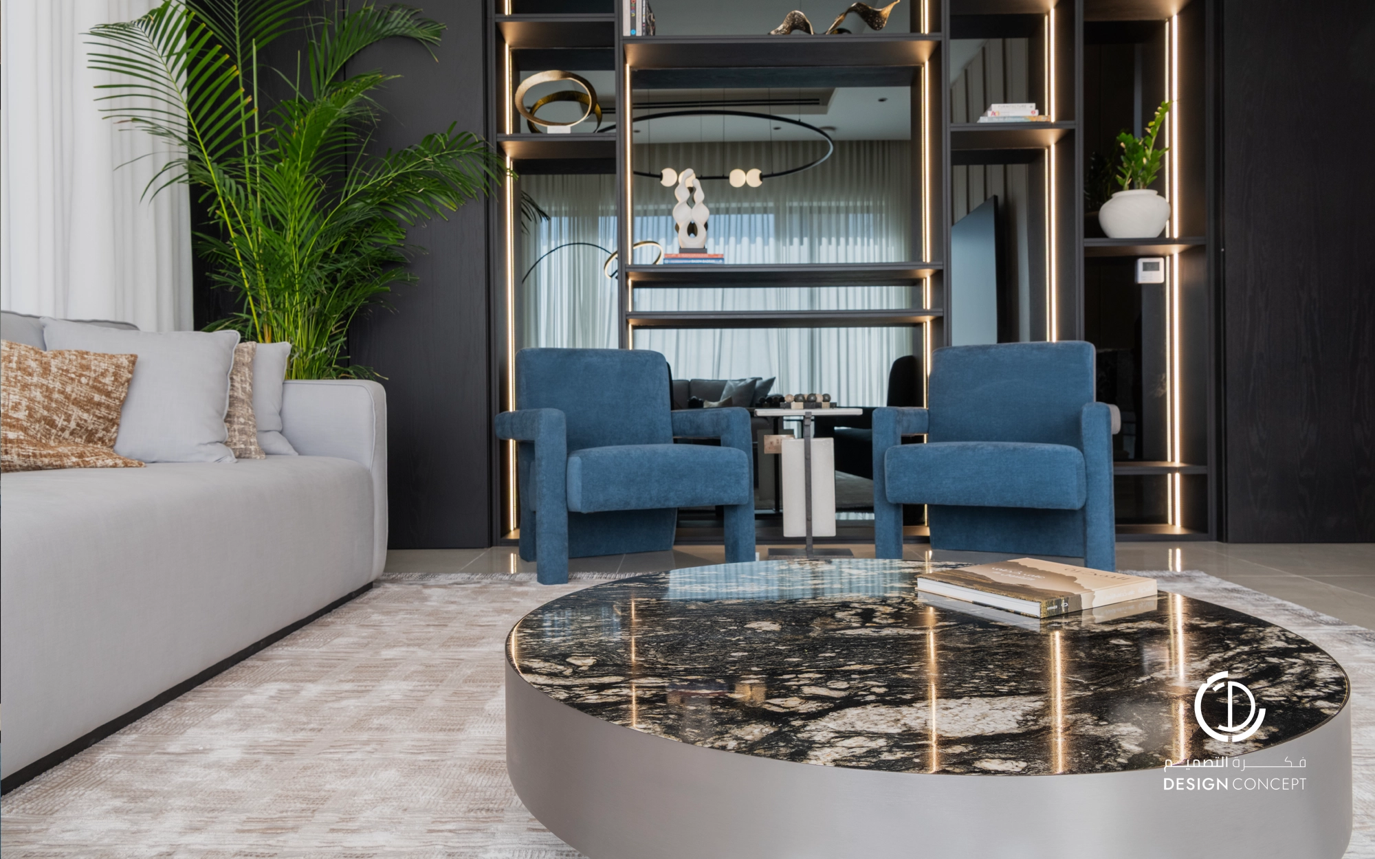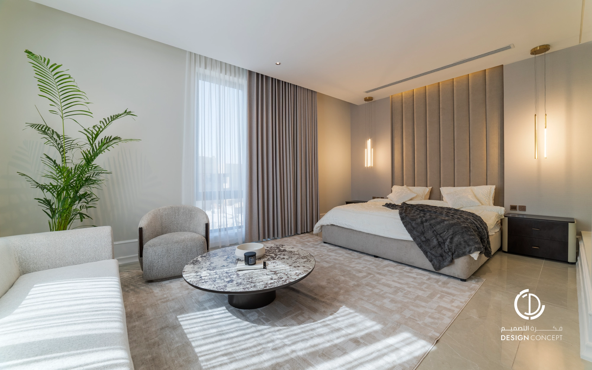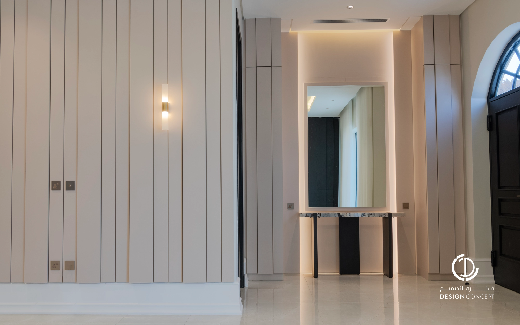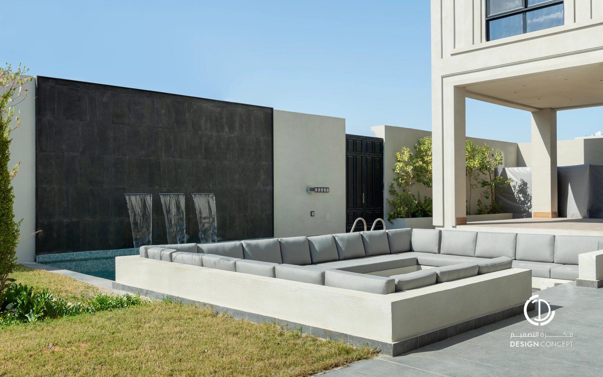 صُممت الڤيلا لتوافق ذوق المالك في حُبه للتفاصيل الكلاسيكية ورغبته بحيزات مفتوحة تُحاكي النمط الحديث، اعتمدنا في التصميم الداخلي على دمج العناصر الكلاسيكية مع النمط المعاصر، أما التصميم المعماري صُمم بضلعين متبايني الأبعاد يغلب على واجهاته نوافذ طويلة.
