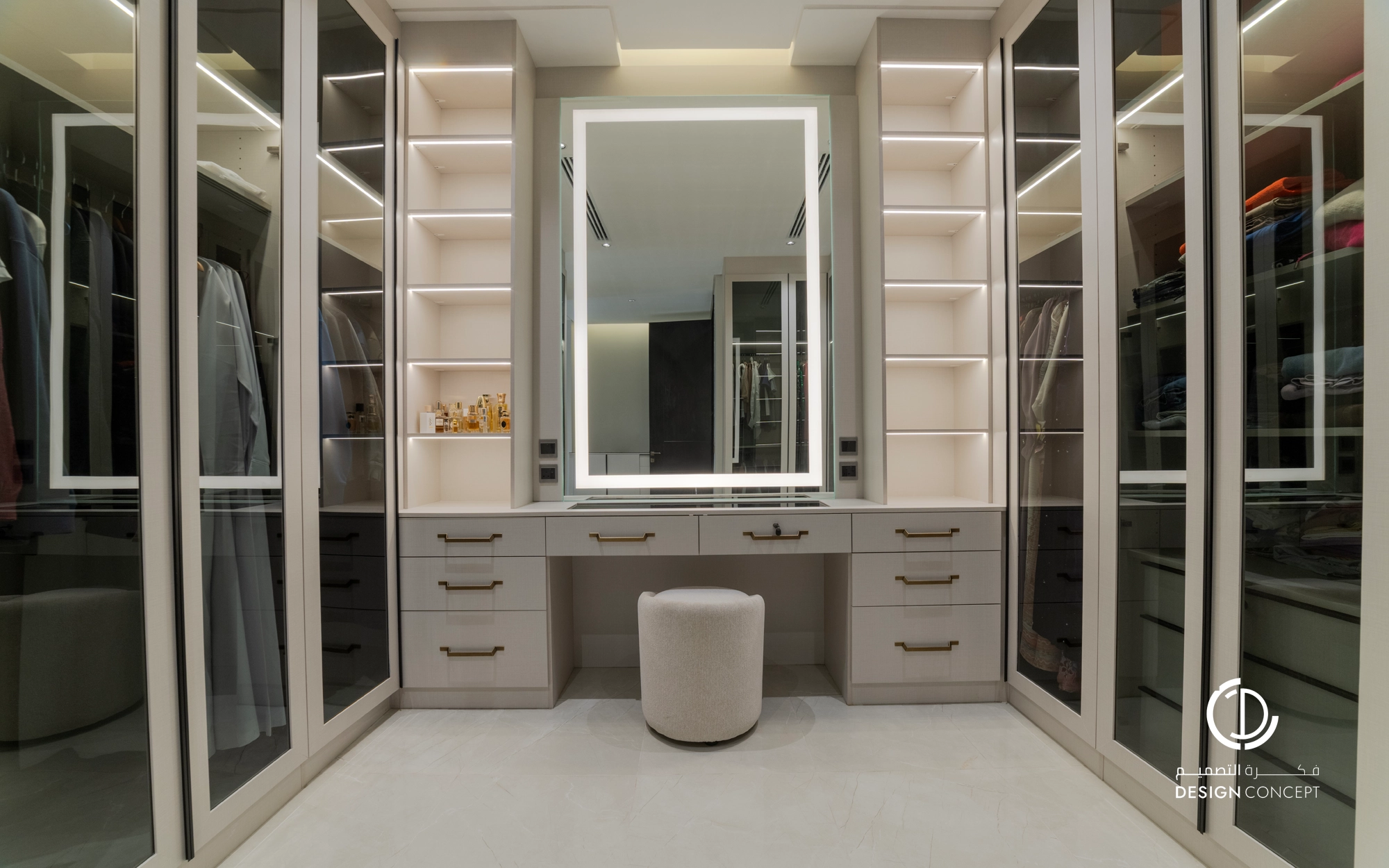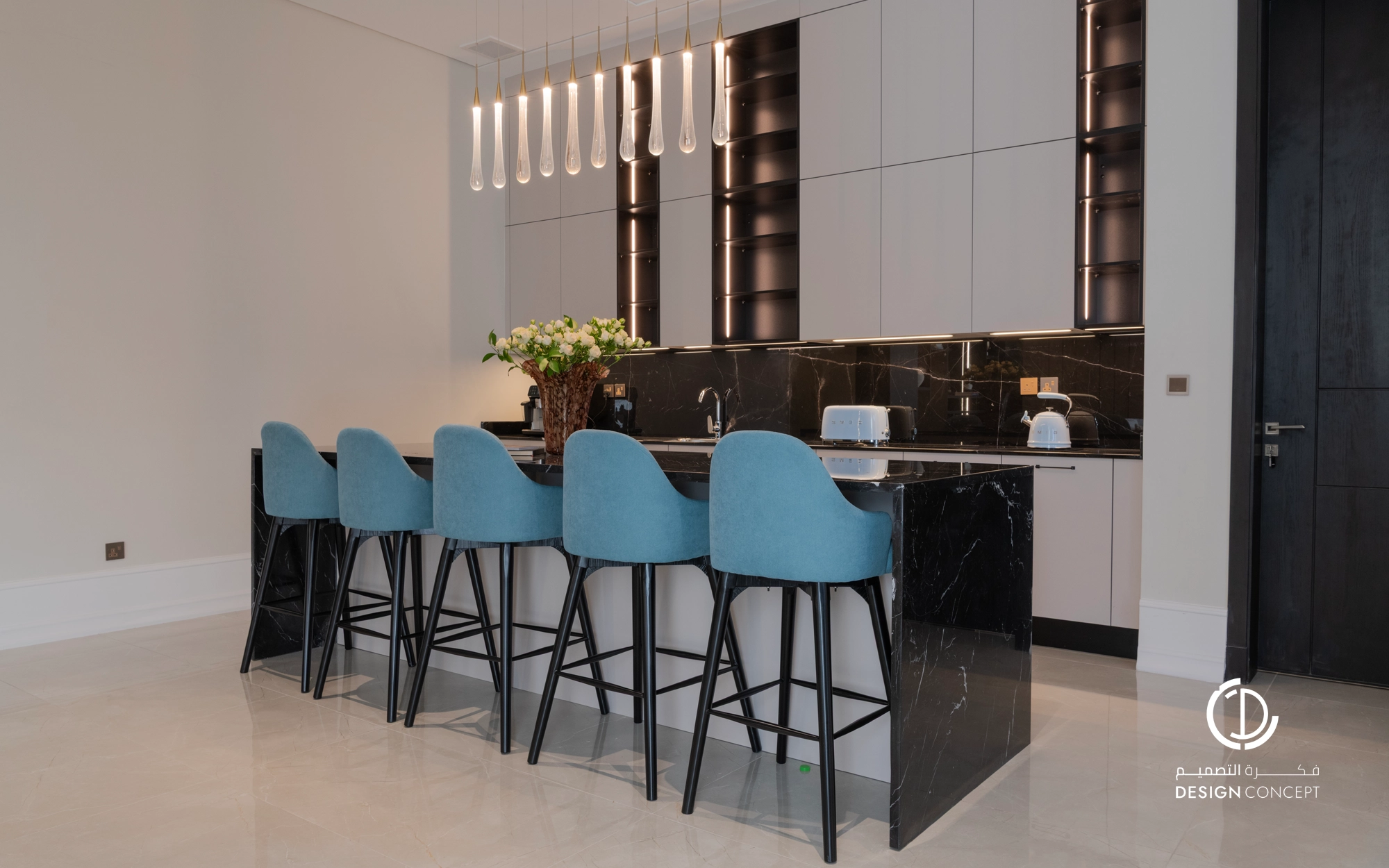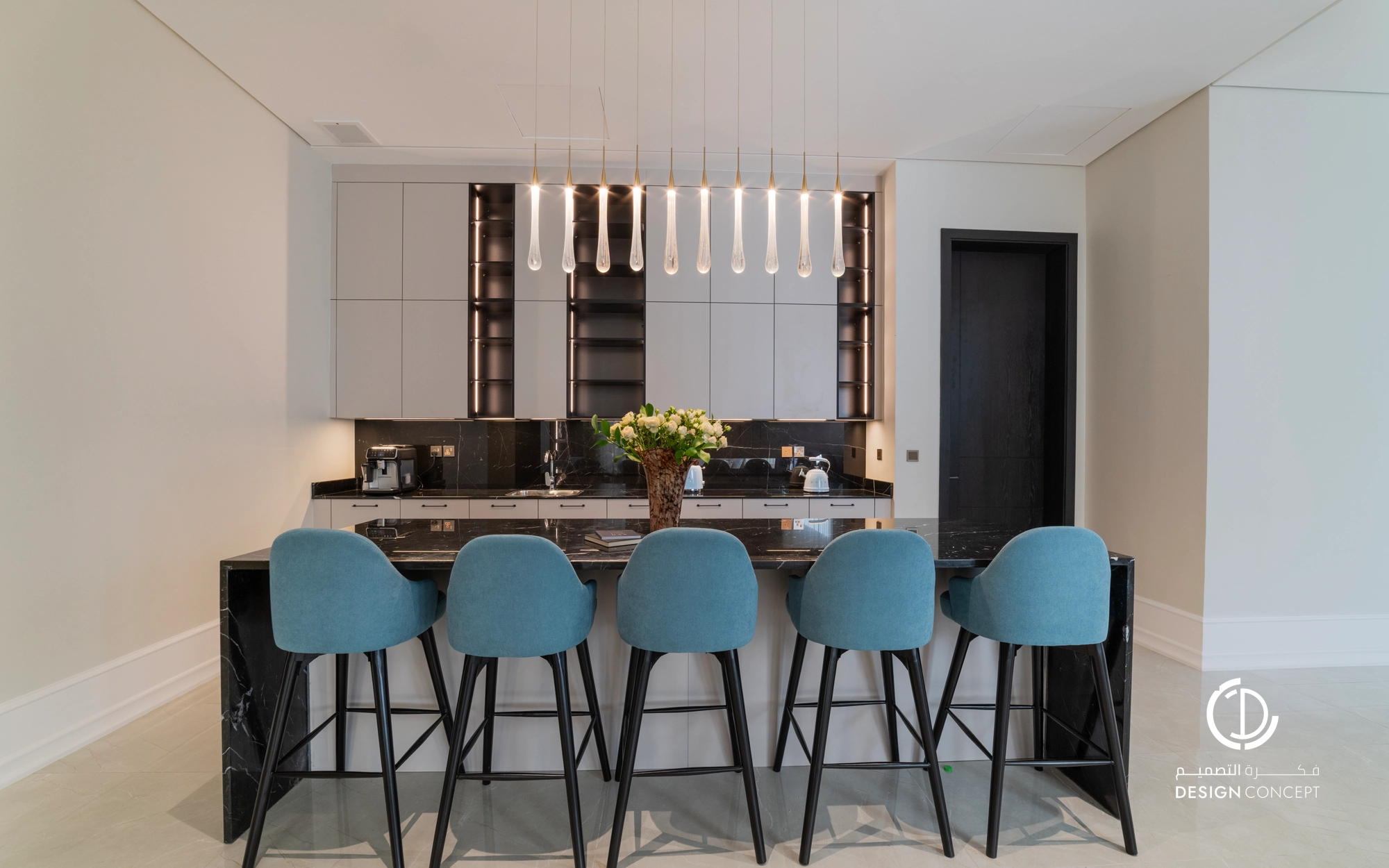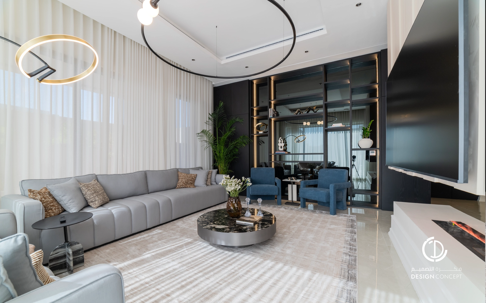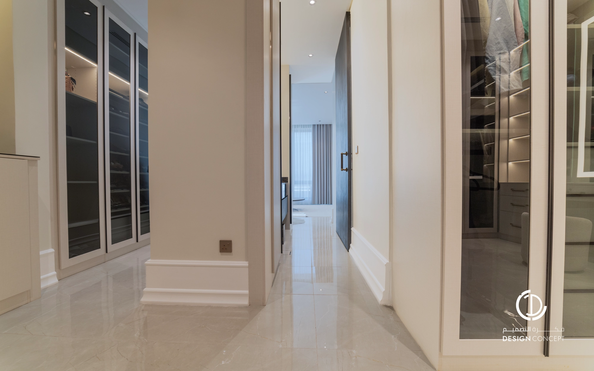 صُممت الڤيلا لتوافق ذوق المالك في حُبه للتفاصيل الكلاسيكية ورغبته بحيزات مفتوحة تُحاكي النمط الحديث، اعتمدنا في التصميم الداخلي على دمج العناصر الكلاسيكية مع النمط المعاصر، أما التصميم المعماري صُمم بضلعين متبايني الأبعاد يغلب على واجهاته نوافذ طويلة.