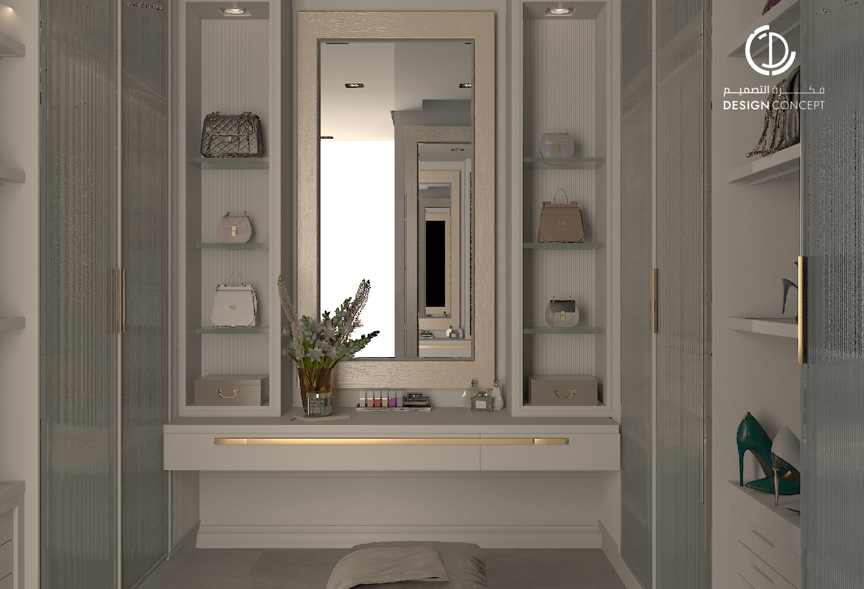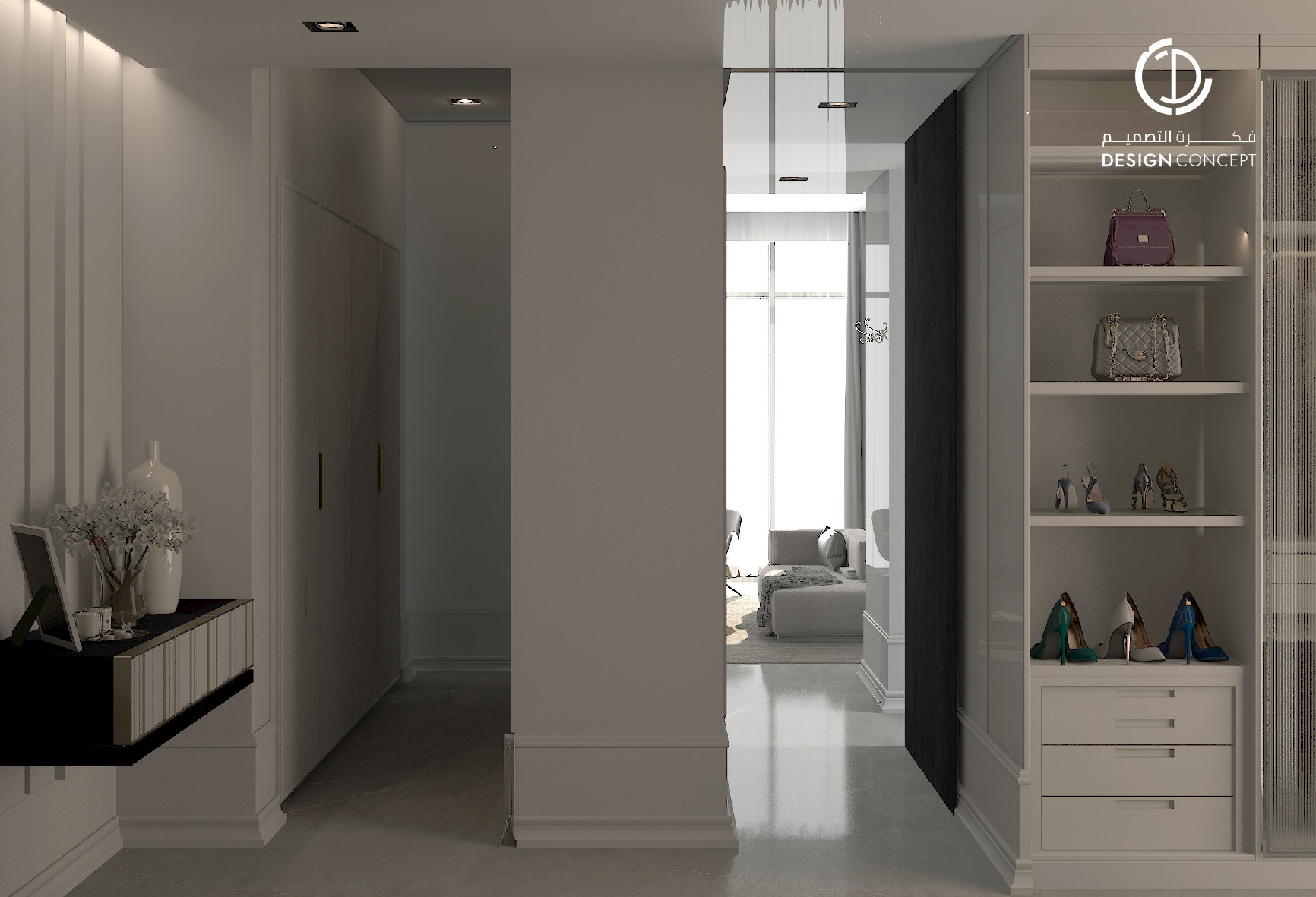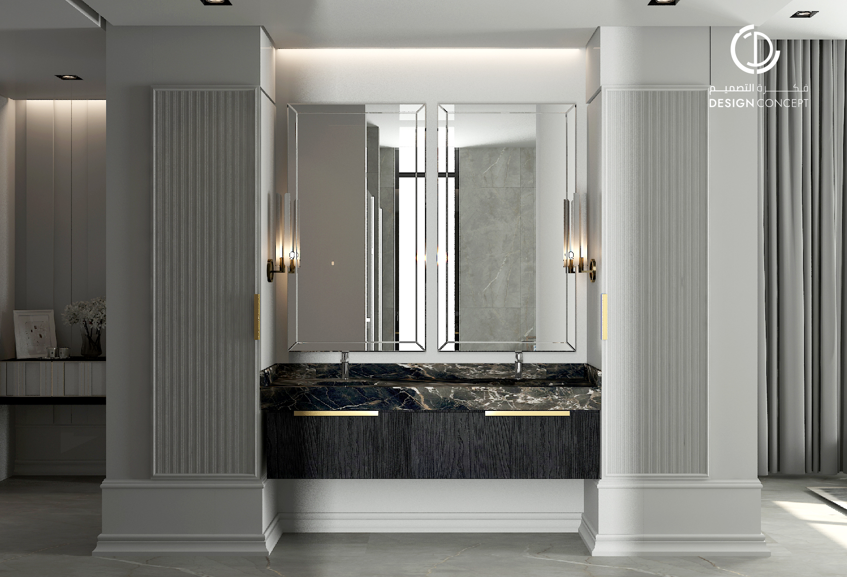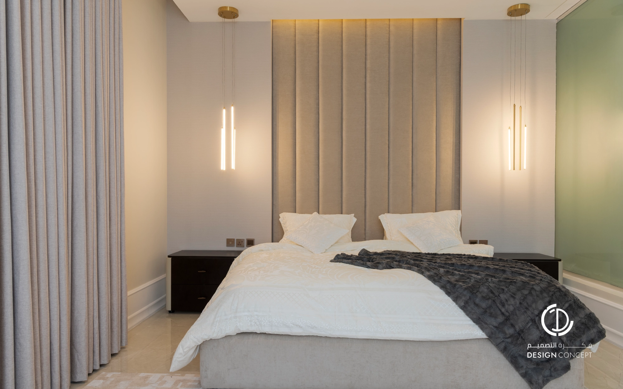 صُممت الڤيلا لتوافق ذوق المالك في حُبه للتفاصيل الكلاسيكية ورغبته بحيزات مفتوحة تُحاكي النمط الحديث، اعتمدنا في التصميم الداخلي على دمج العناصر الكلاسيكية مع النمط المعاصر، أما التصميم المعماري صُمم بضلعين متبايني الأبعاد يغلب على واجهاته نوافذ طويلة.
