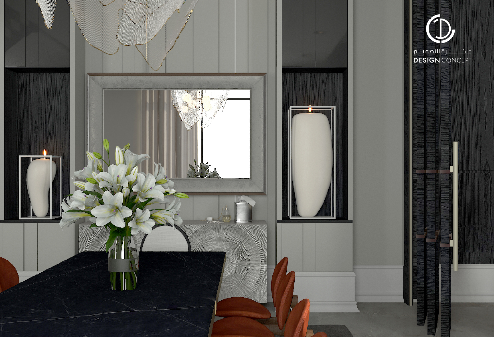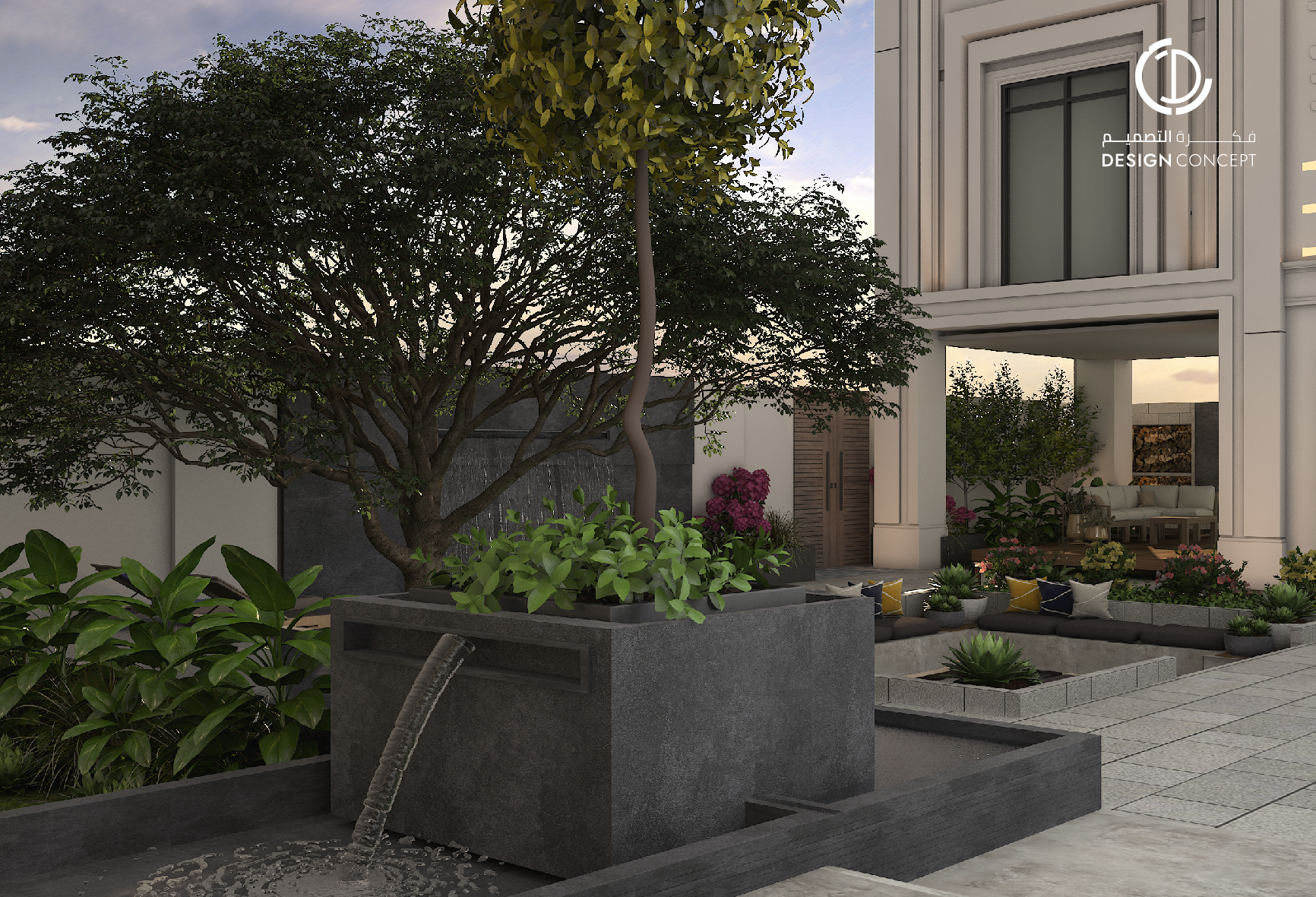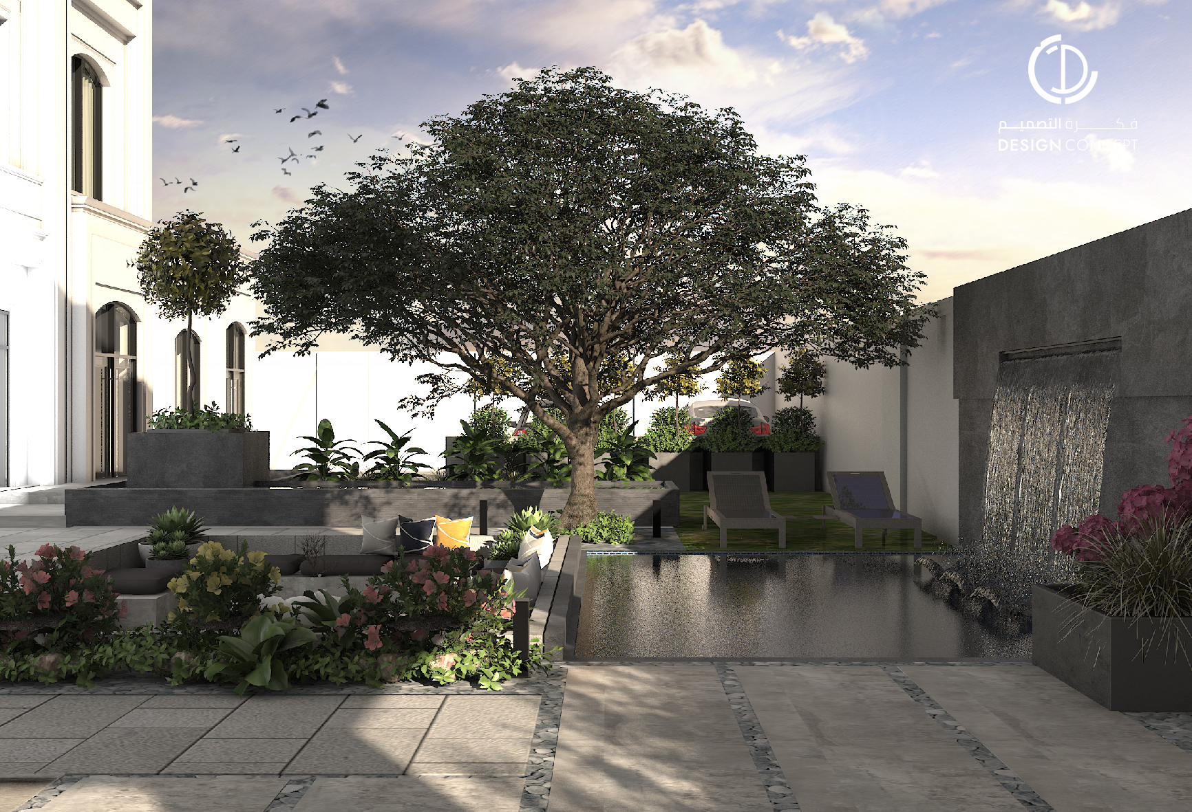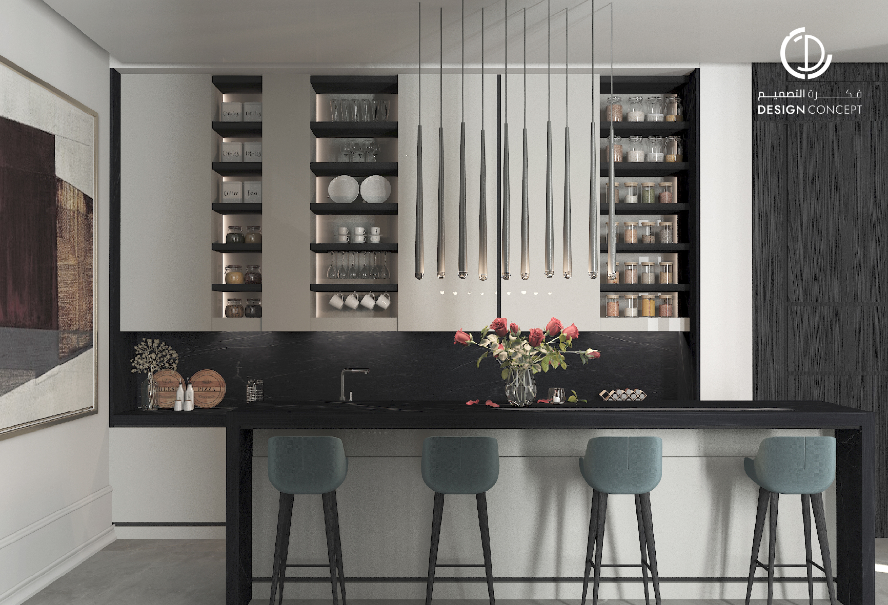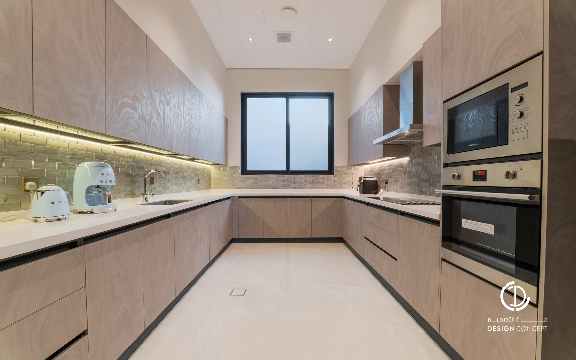 صُممت الڤيلا لتوافق ذوق المالك في حُبه للتفاصيل الكلاسيكية ورغبته بحيزات مفتوحة تُحاكي النمط الحديث، اعتمدنا في التصميم الداخلي على دمج العناصر الكلاسيكية مع النمط المعاصر، أما التصميم المعماري صُمم بضلعين متبايني الأبعاد يغلب على واجهاته نوافذ طويلة.