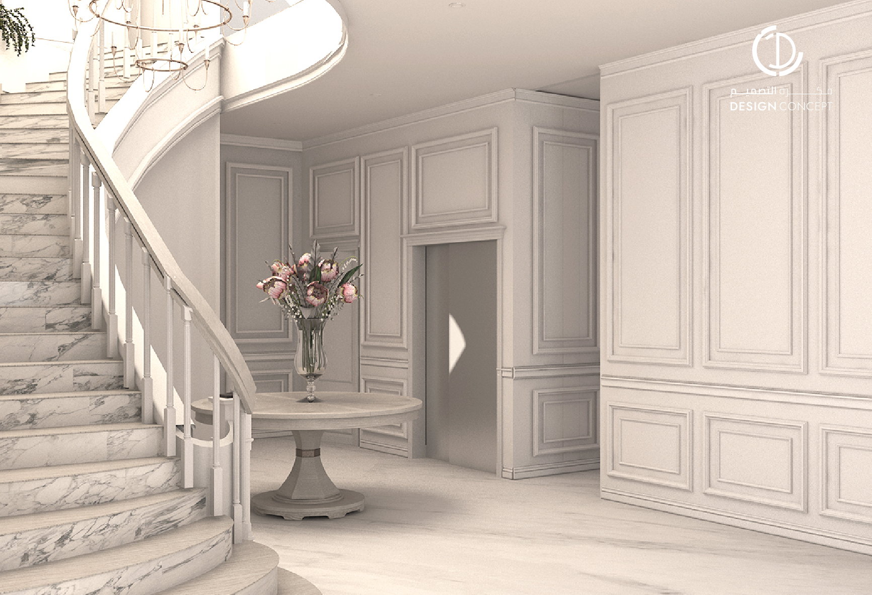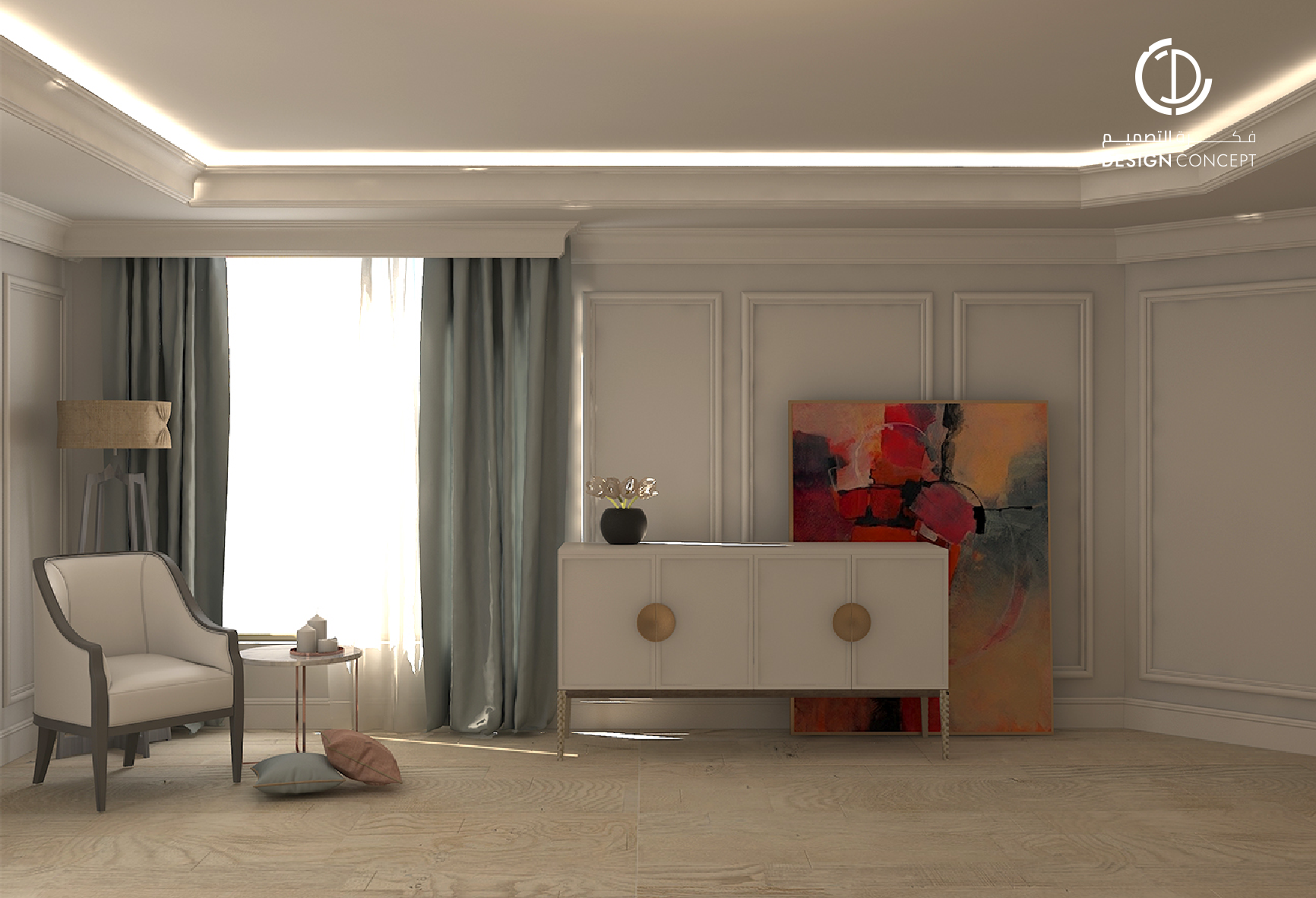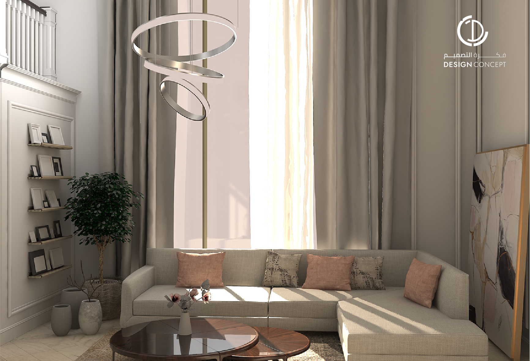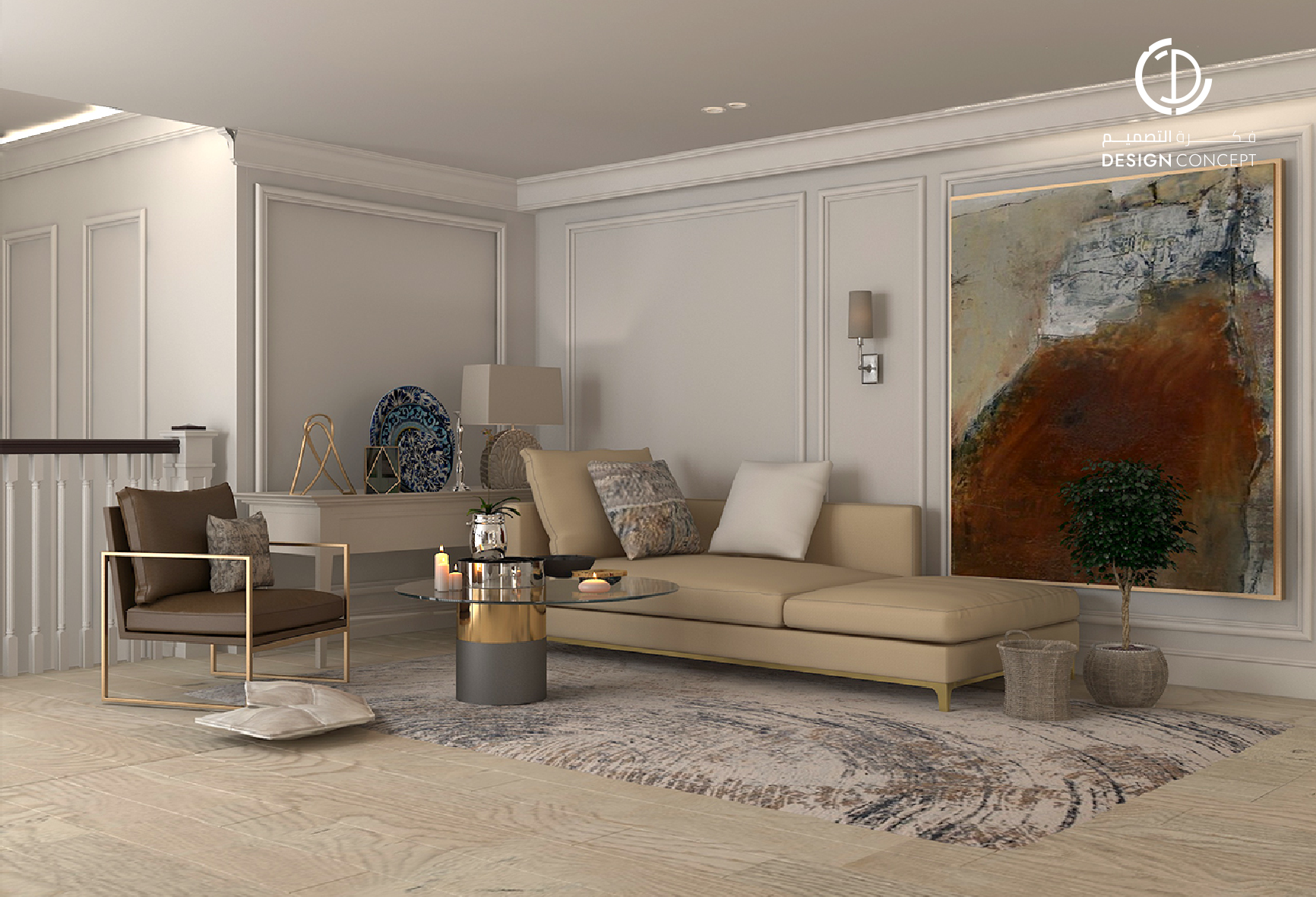 تصميم معاصر وحديث، اعتمدنا اللون الأبيض للجدران والأسقف والرخام الأبيض للأرضيات مع استخدام كبير للألوان الهادئة في غرف النوم واختيار قطع أثاث كلاسيكية للمجلس والصالة.