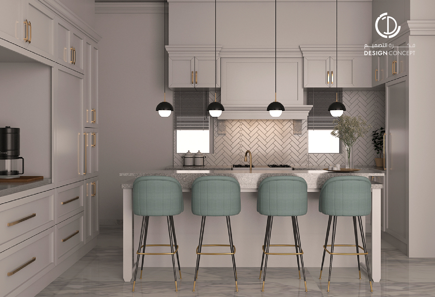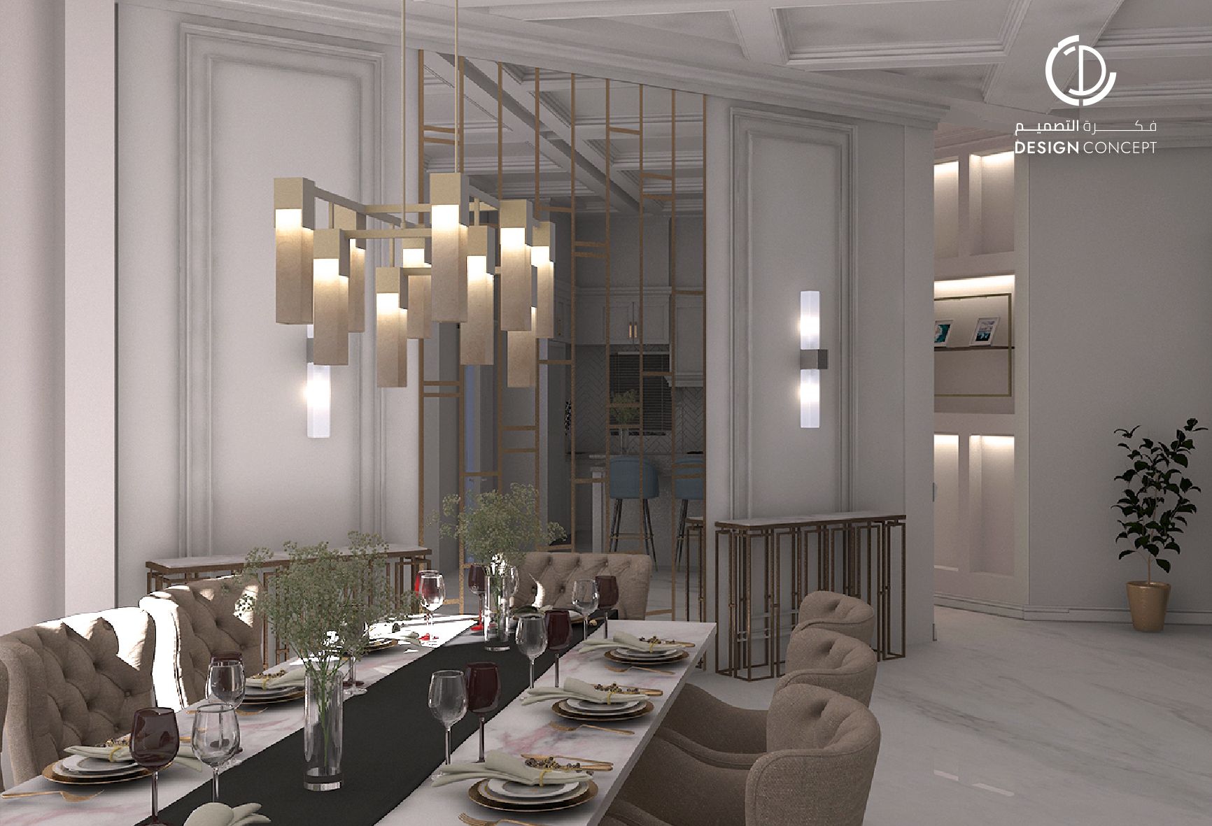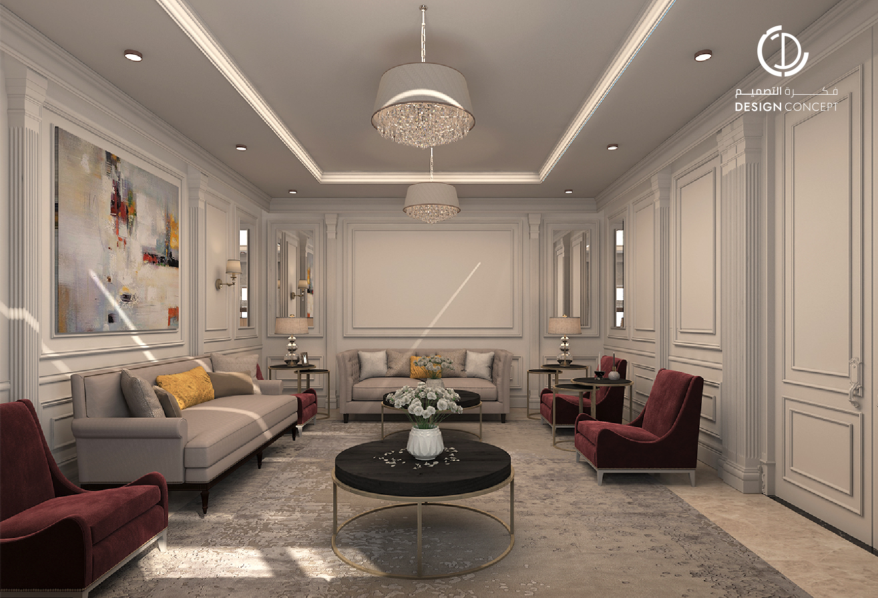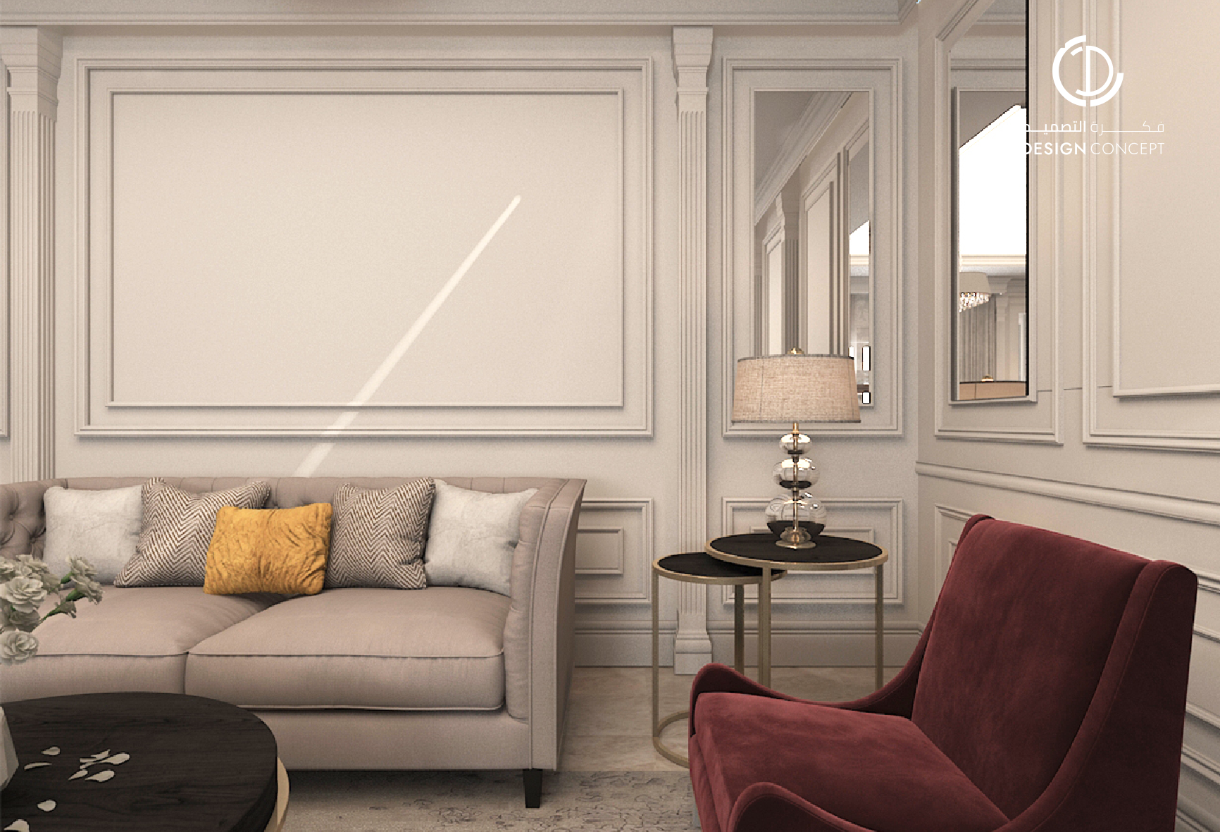 تصميم معاصر وحديث، اعتمدنا اللون الأبيض للجدران والأسقف والرخام الأبيض للأرضيات مع استخدام كبير للألوان الهادئة في غرف النوم واختيار قطع أثاث كلاسيكية للمجلس والصالة.