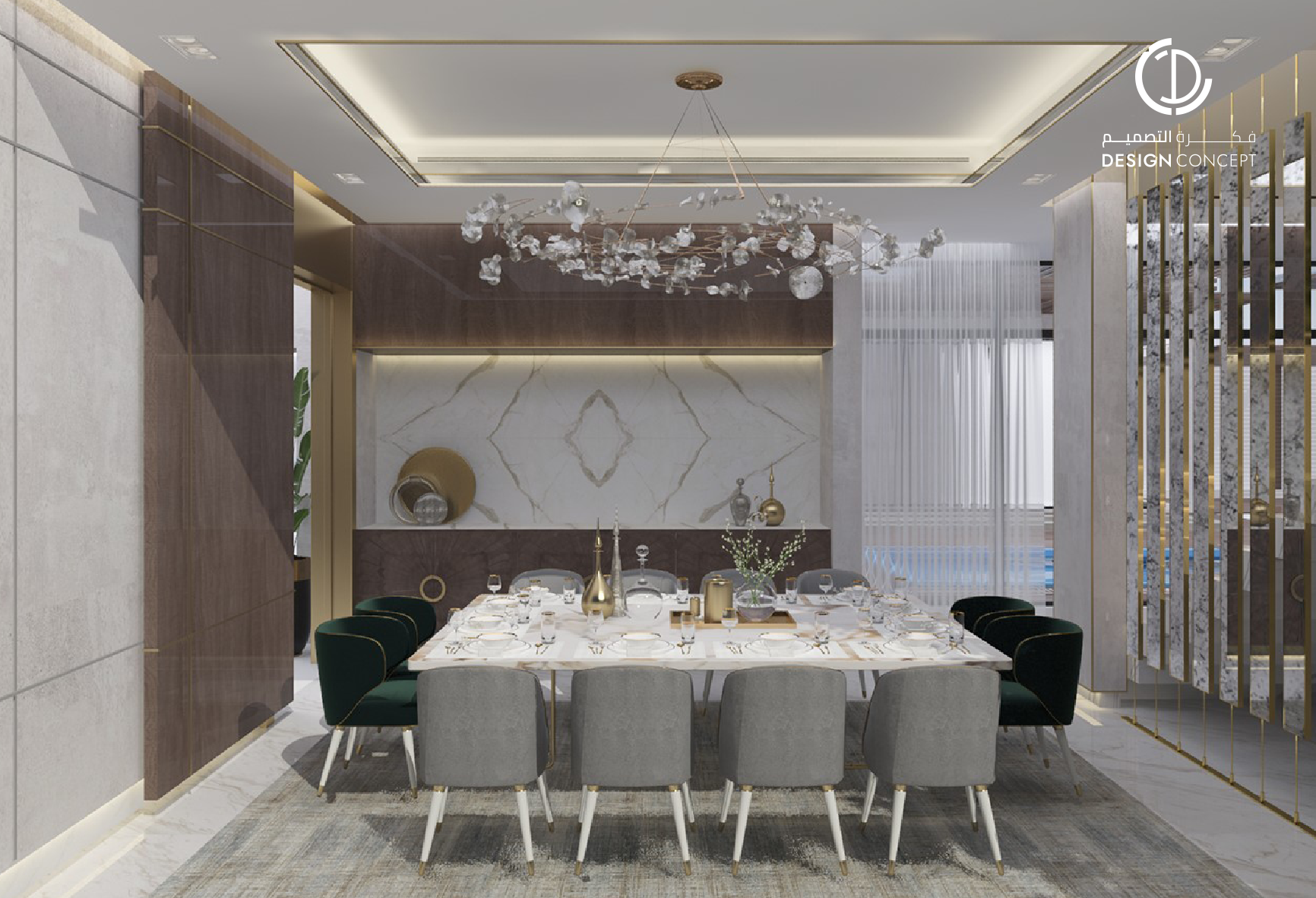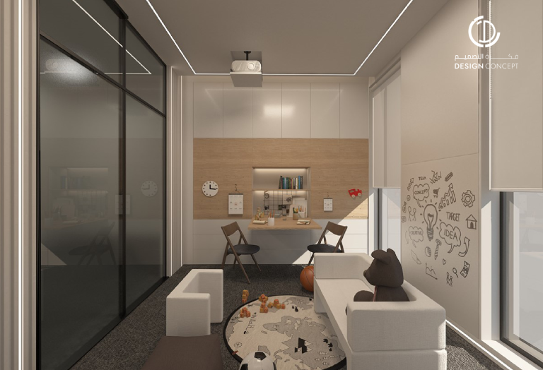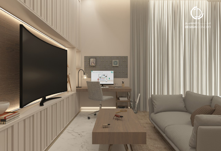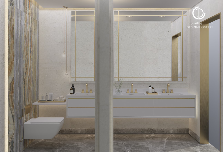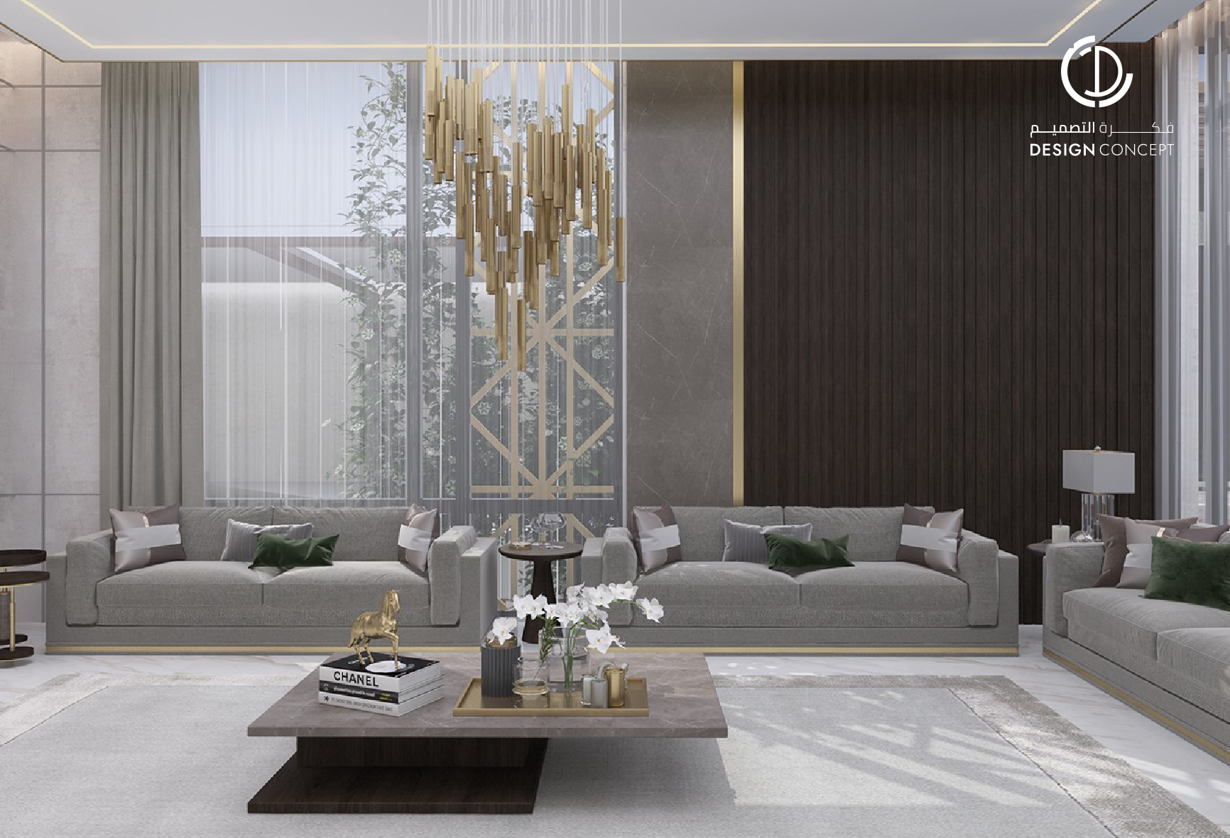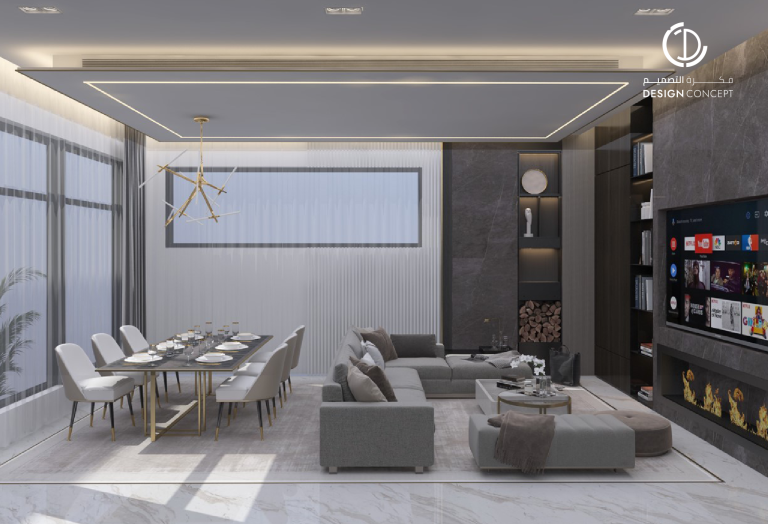 تصميم بنمط معاصر وحديث، اعتماد اللون الأبيض للجدران والرخام للأرضيات، كما أضافت قطع الأثاث الذهبية جمالاً للمكان مع الثريات فريدة الشكل في كل من المجلس والديوانية.