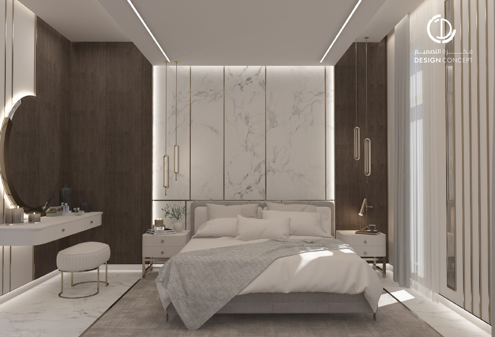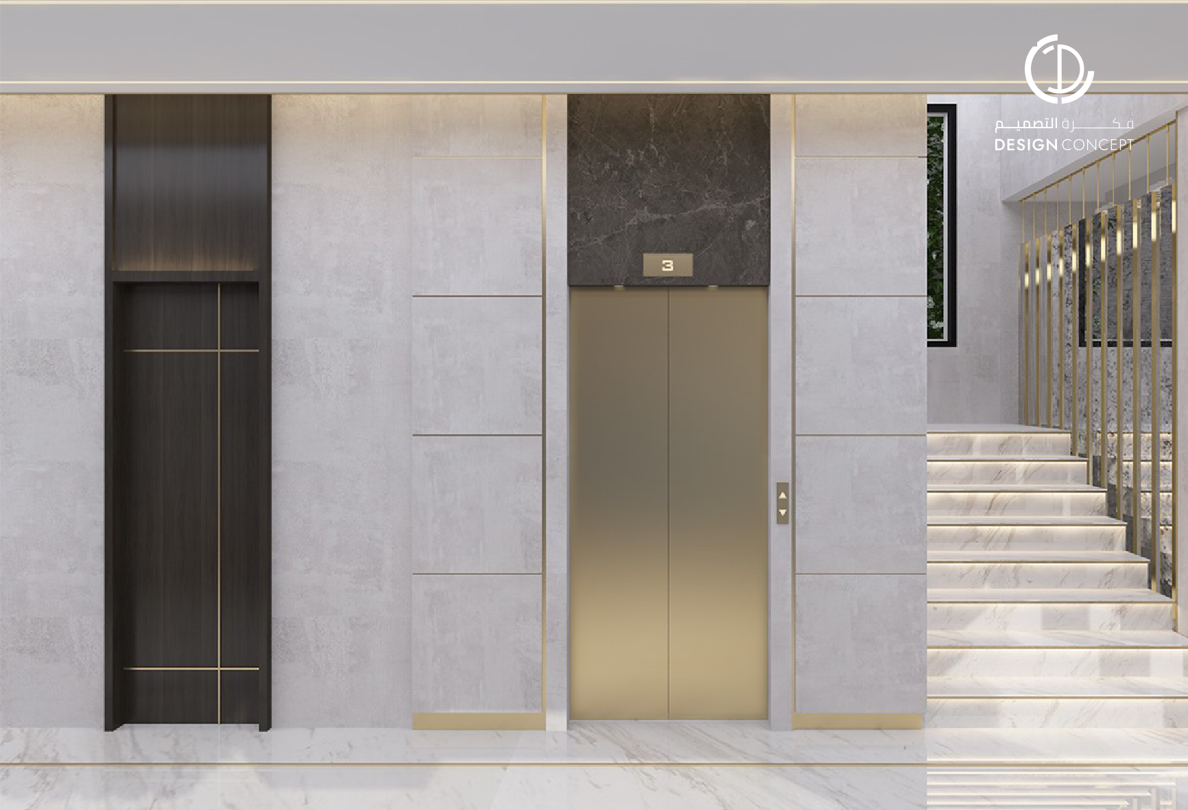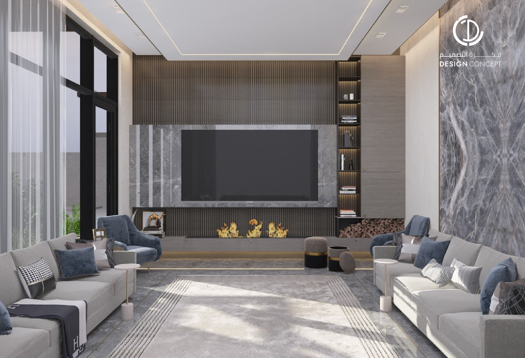 تصميم بنمط معاصر وحديث، اعتماد اللون الأبيض للجدران والرخام للأرضيات، كما أضافت قطع الأثاث الذهبية جمالاً للمكان مع الثريات فريدة الشكل في كل من المجلس والديوانية.