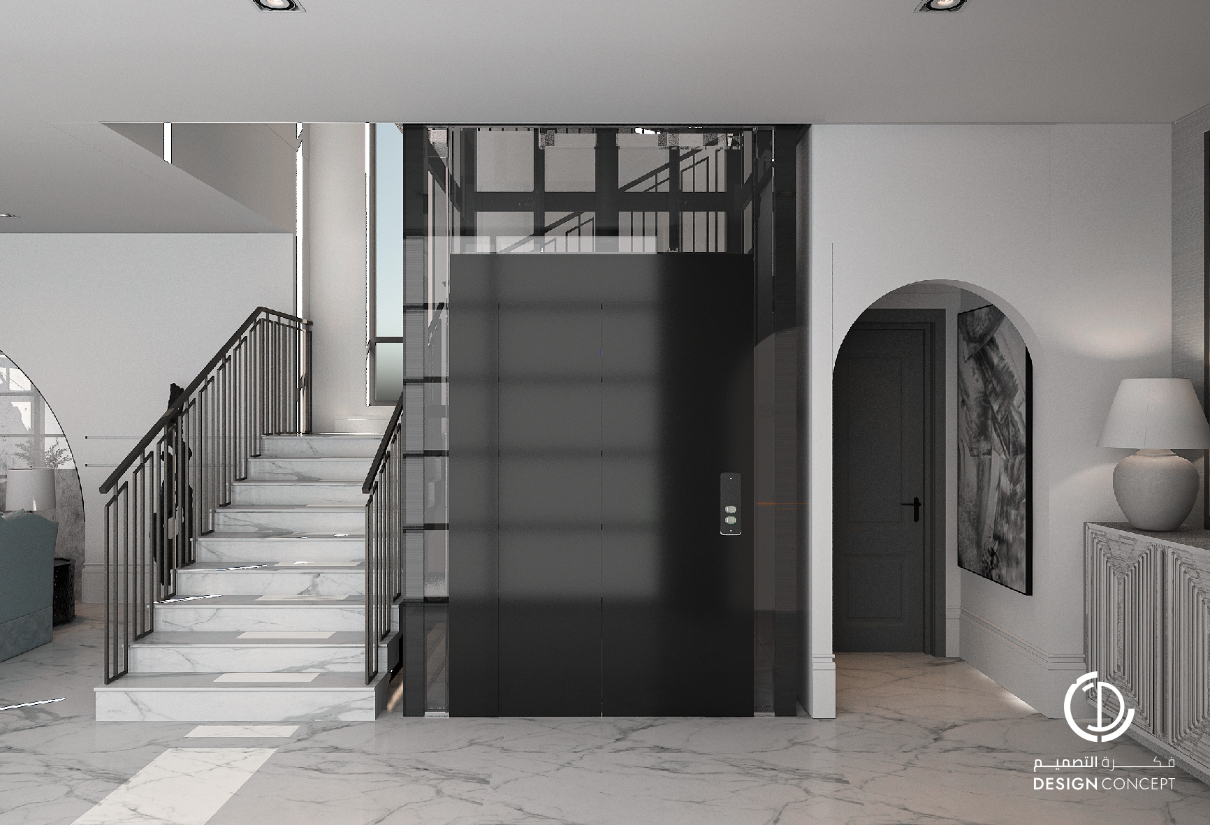 ڤيلا بتصميم معاصر ذو طابع أمريكي أنيق، توسط المدخل كنسول ذو سطح رخامي ترتكز عليه من الخلف مرايا تعكس اتساع المدخل وجانب من الحديقة.