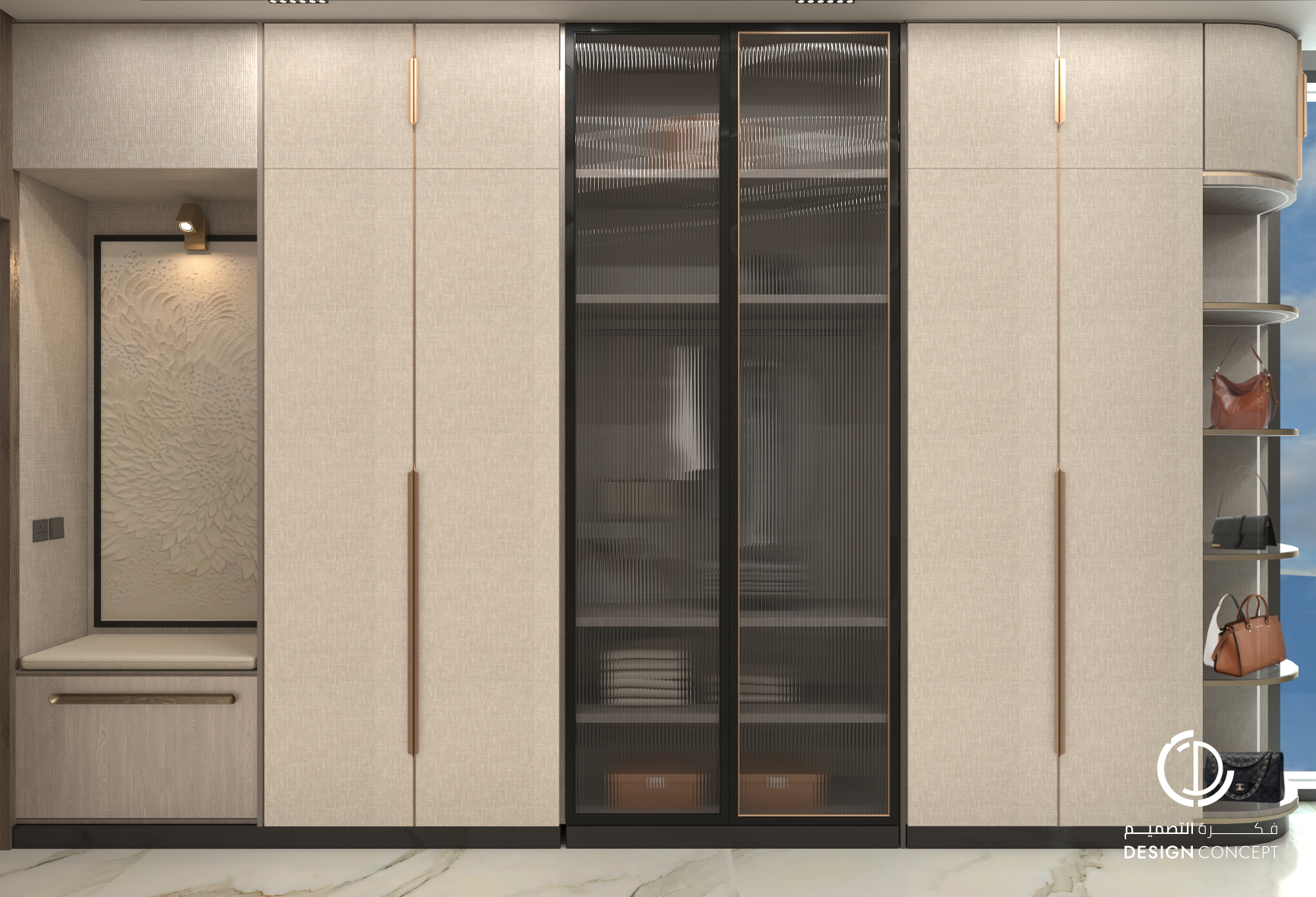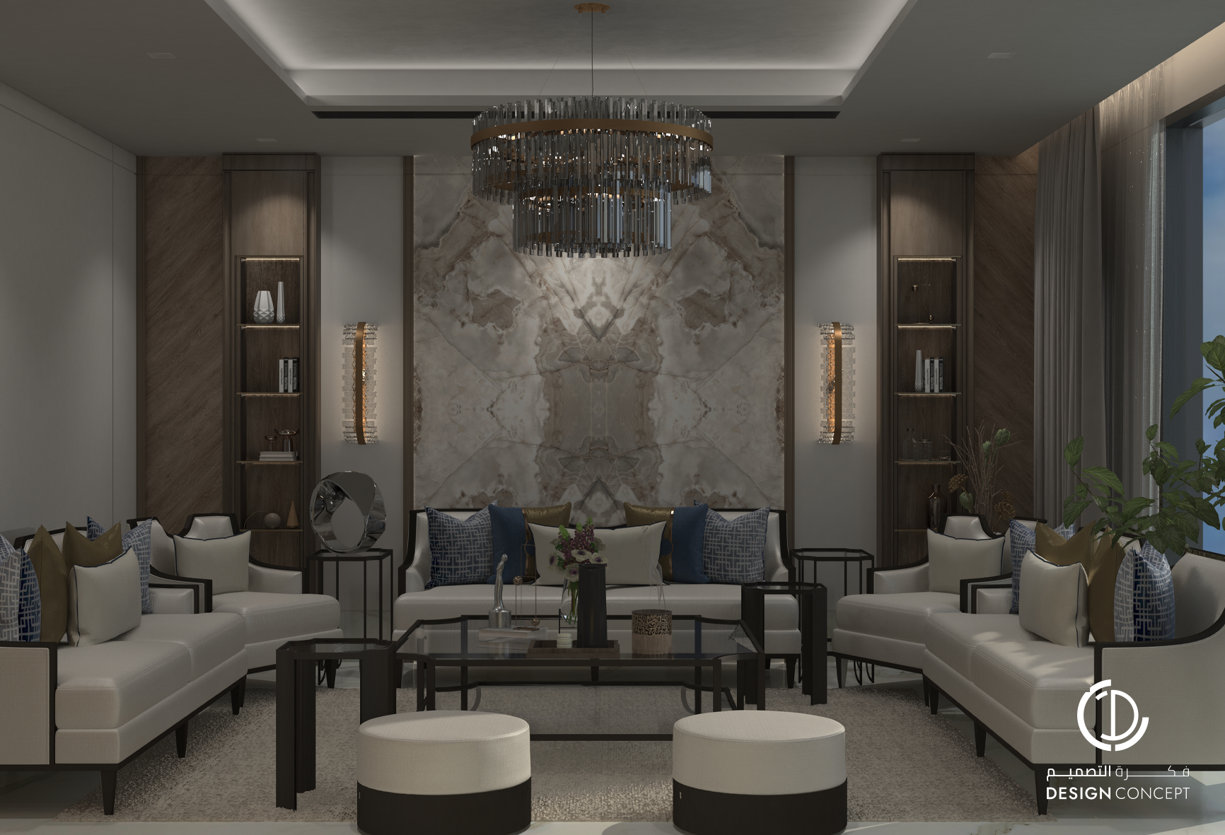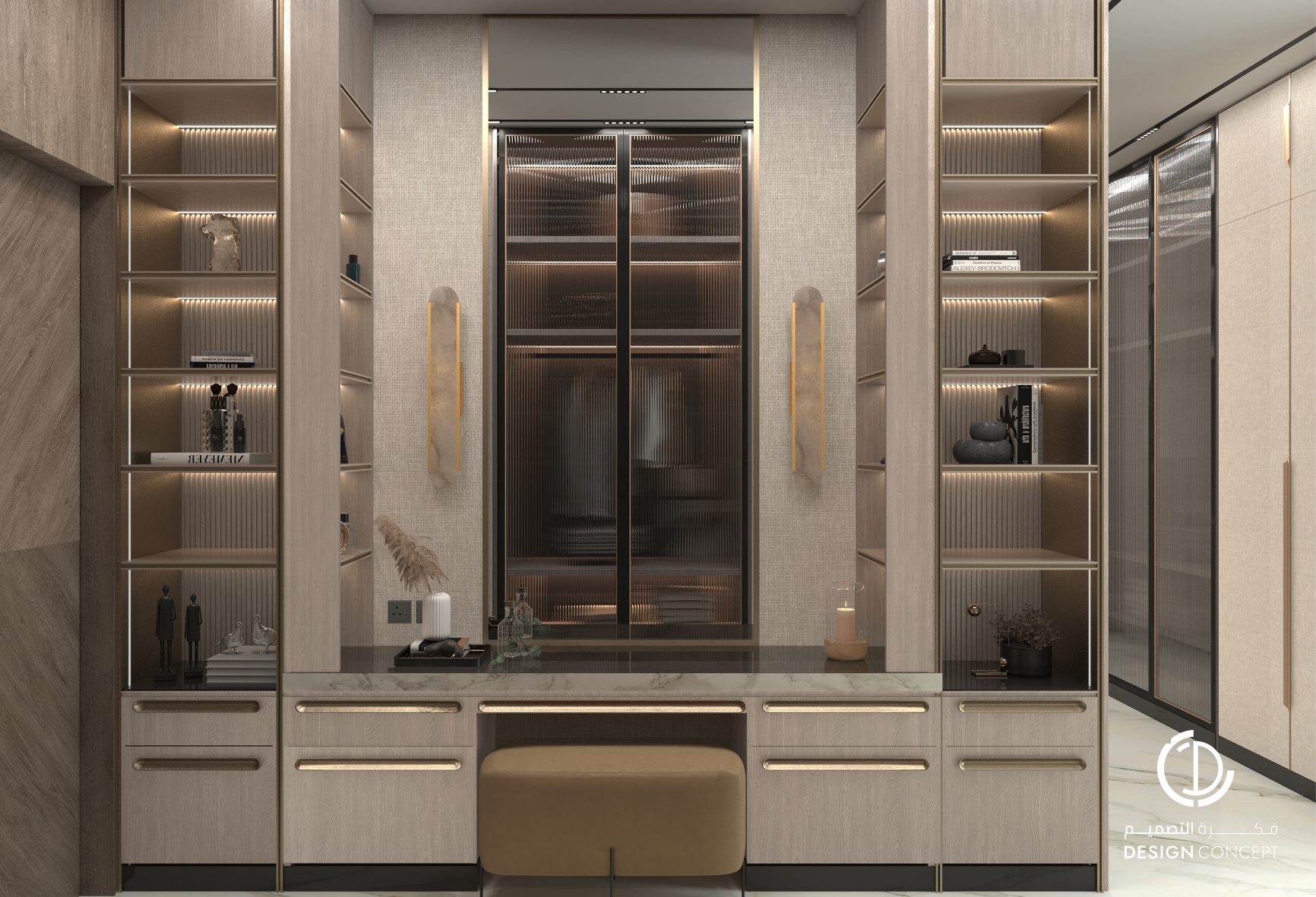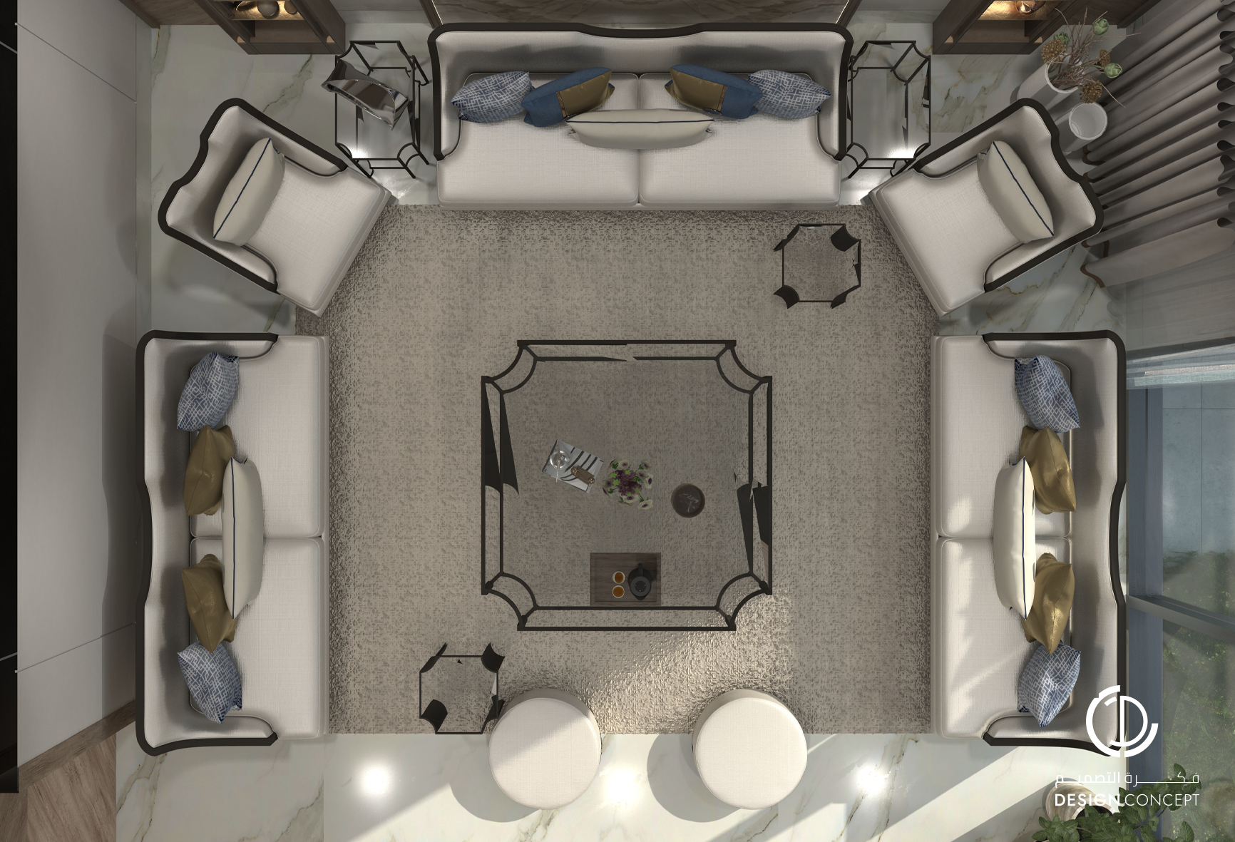 تم تصميم الفيلا على مساحة 130م² بعناية لتوفّر تجربة سكنية تجمع بين الأناقة والراحة. يضم التصميم مجلس بتفاصيل من الرخام والخشب، صالة عائلية دافئة وغرفة نوم رئيسية بلمسات عصرية. تم اعتماد خامات طبيعية وألوان محايدة وإضاءة هادئة في التصميم بشكل عام لخلق توازن بصري يوحي بالاتساع والسكينة.