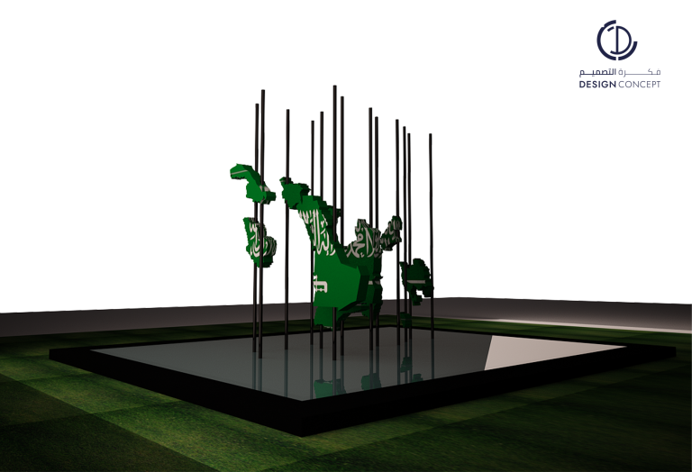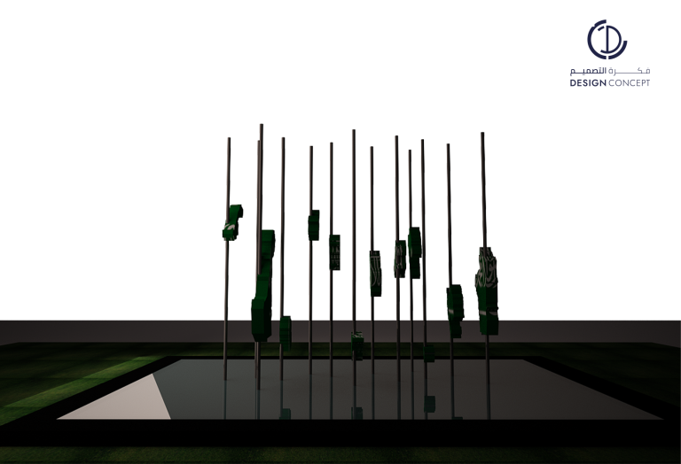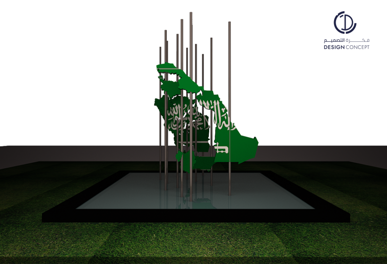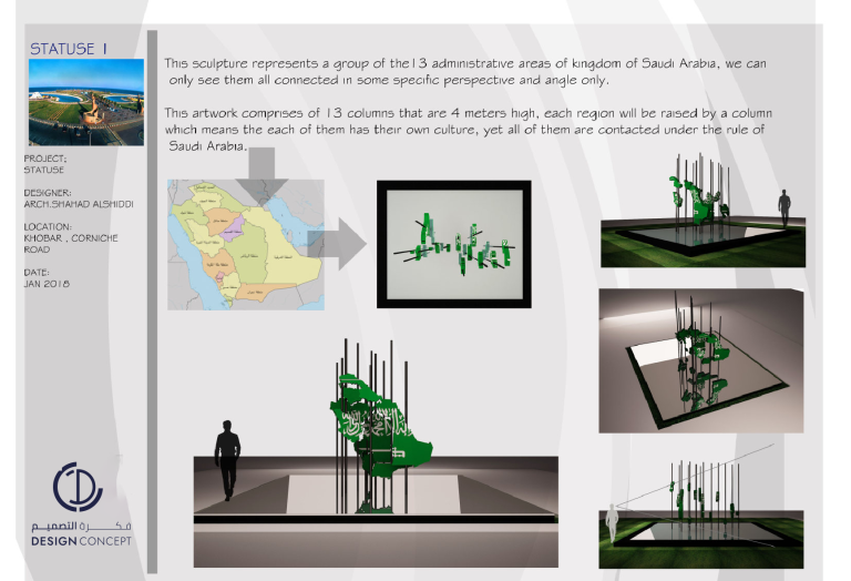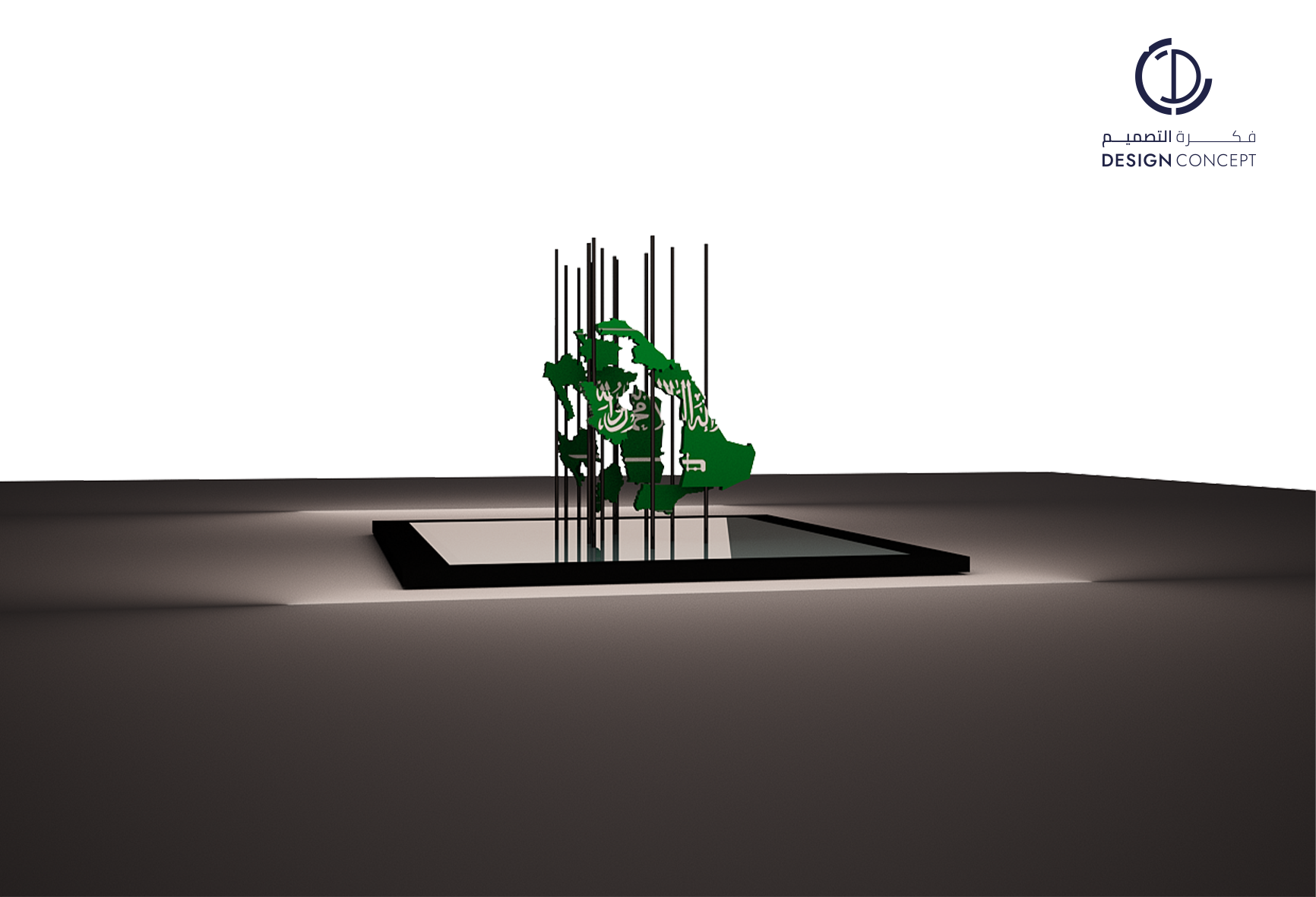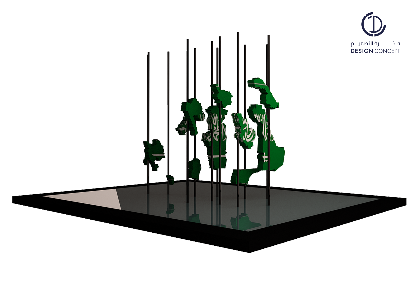 يُمثّل التصميم المناطق الإدارية بالمملكة، نستطيع مشاهدتها مجتمعة لتكون خريطة المملكة في زاوية محددة فقط يتضمن هذا العمل 13 عمود بارتفاع أربع أمتار، كل منطقة على عمود بمعنى أن كل منطقة لديها ثقافتها وحضارتها الخاصة بها، مع ذلك تتفق وتجتمع كل المناطق تحت ظل المملكة العربية السعودية